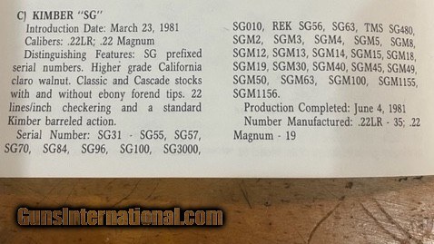 Description: Offered is a beautiful Kimber of Oregon Classic Super Grade. This is Kimber's first release of an in house production Super Grade and only 35 of this model were produced in 22LR. This series dates back to 1981. The rifle remains in beautiful condition with it's original box. The serial number is listed in the Kimber collectors book and a photo of the page is posted. Price is $3750 plus shipping from my FFL to your FFL insured. Best to call Jeff at 616 886-7607 SOLD Rifle Caliber: .22 Long Rifle Manufacturer: Kimber of Oregon Model: Super Grade Serial Number: SG100 Barrel Length: 21" Condition: As New Manufacture Date: 2004 |
