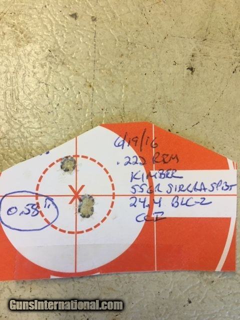 Description: Kimber of Oregon Model 84 in .222 Remington. Scope and rings not included. This rifle is a tack driver as shown in a 100 yard target I shot a while back using my handloads. Comes in Kimber box (looks original, but not sure) with label. The stock has a few bumps on it that hardly show up in the photos. I would rate the rifle around 98% overall - I have shot it only to sight in and develop a load. Price reduced to $1175 delivered to your FFL dealer in the lower 48. SOLD |