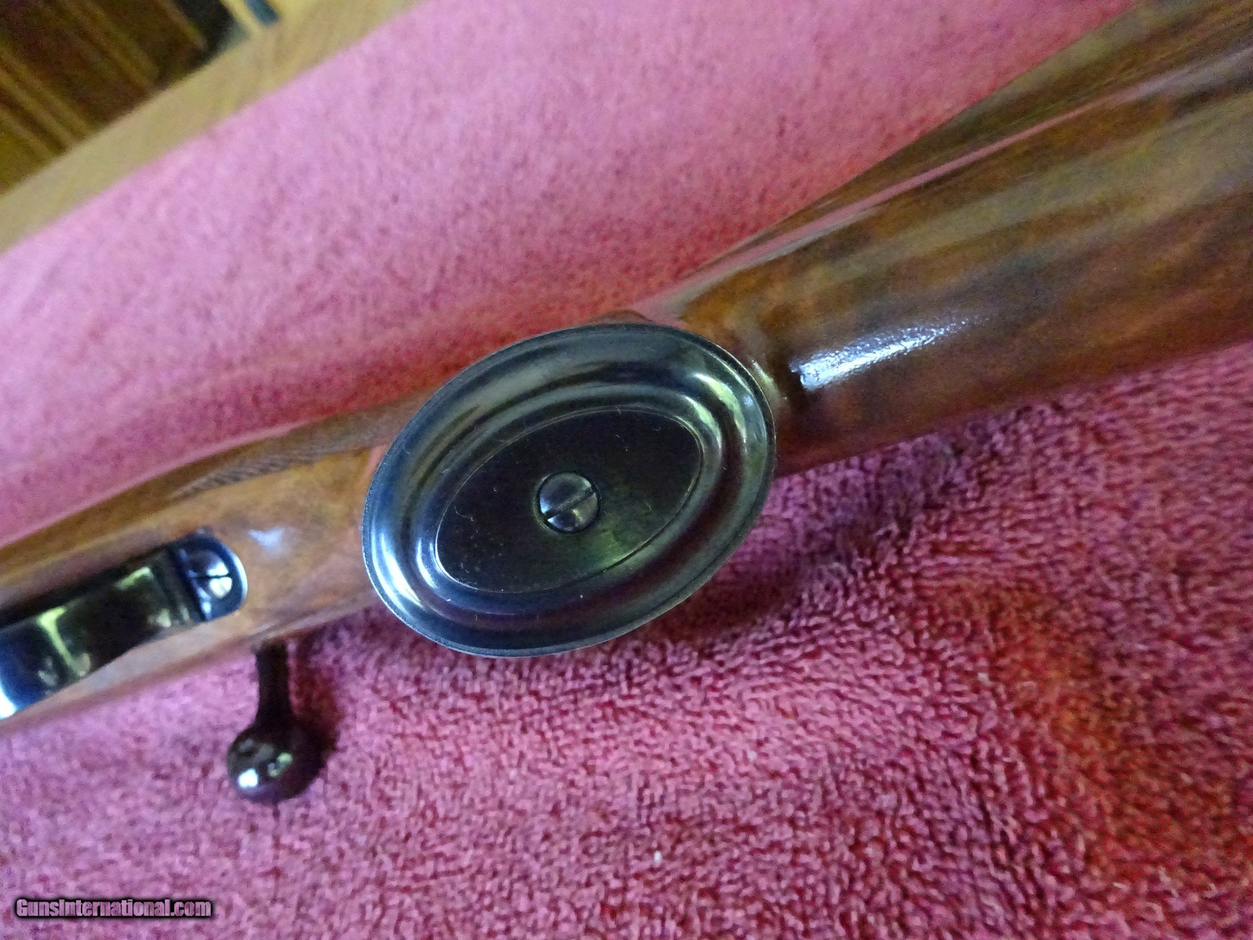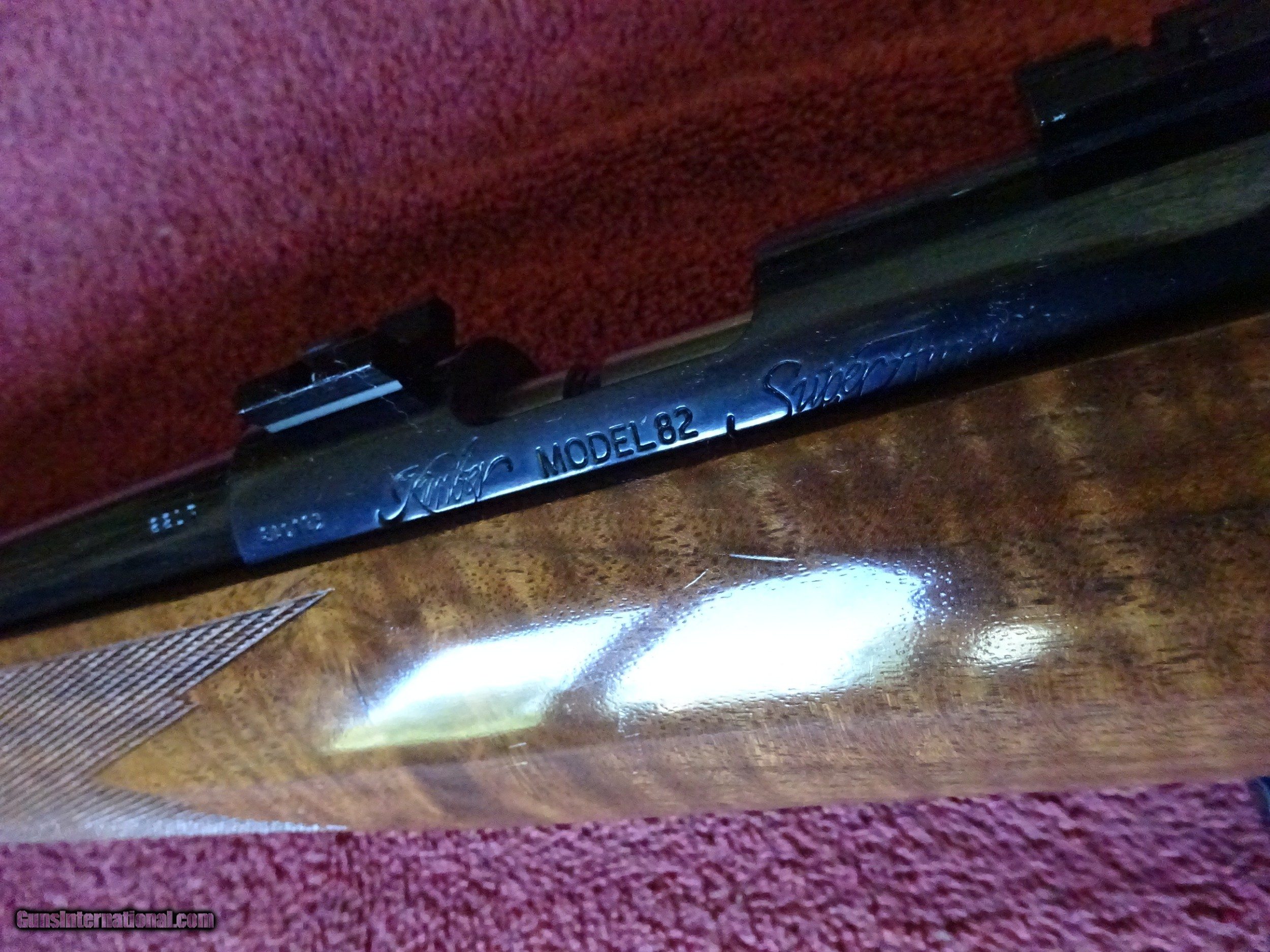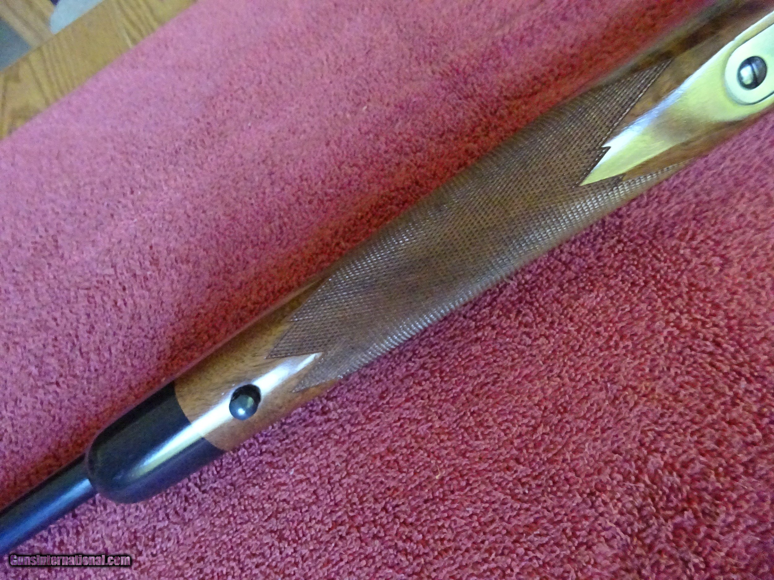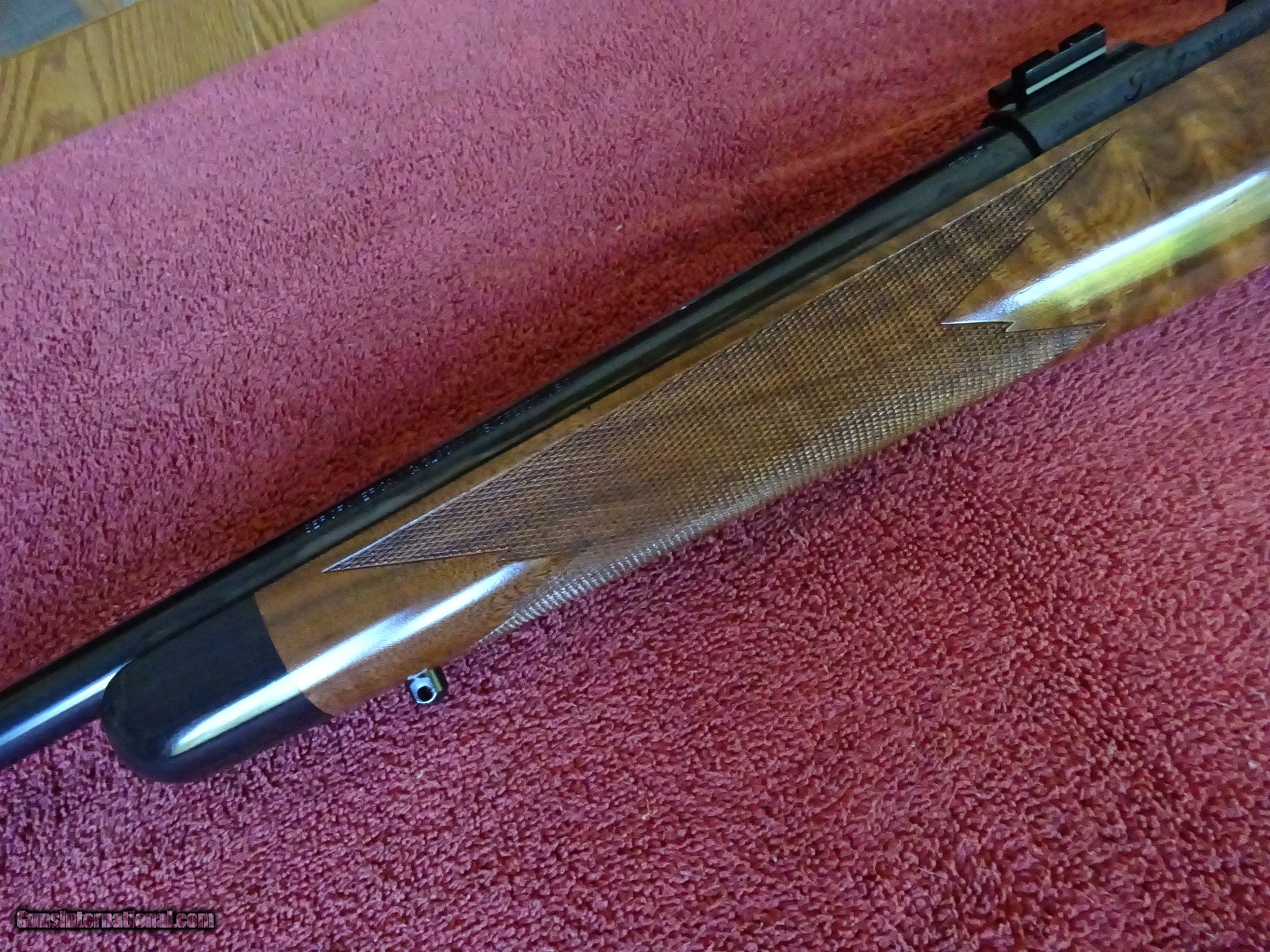 Description: KIMBER MODEL 82-C SUPER AMERICA, 22 LONG RIFLE. 100% HIGH LUSTER BLUE, MIRROR PERFECT BORE, NO OPEN SIGHTS, FACTORY DRILLED AND TAPPED RECEIVER WITH SCOPE MOUNTS. GORGEOUS HIGHLY FIGURED AMERICAN WALNUT STOCK WITH CHEEKPIECE, 24 LINES PER INCH WRAP-AROUND CHECKERING, STEEL GRIP CAP AND BLACK KIMBER MARKED PAD. EBONY FOREARM TIP, SLING SWIVEL STUDS. 100% ORIGINAL CONDITION. IT WOULD BE DIFFICULT TO FIND A MORE ATTRACTIVE AMERICAN-MADE SPORTING FIRLE. TRULY A GORGEOUS GUN. VERY MINOR HANDLING MARKS IN THE WOOD FINISH, NOTHING OFFENSIVE, GREAT GUN. MADE 1993-1999, 3 DIGIT SERIAL NUMBER, PROBABLY FIRST-YEAR PRODUCTION. $2000.00 + $50.00 Insured shipping to an FFL address. See all Pats gun listings on this site! We also have hundreds of pieces of ORIGINAL gun company advertising & memorabilia available for sale on our site SPORTINGCOLLECTIBLES. We have no reprints or reproductions. Email for more information. SOLD |
