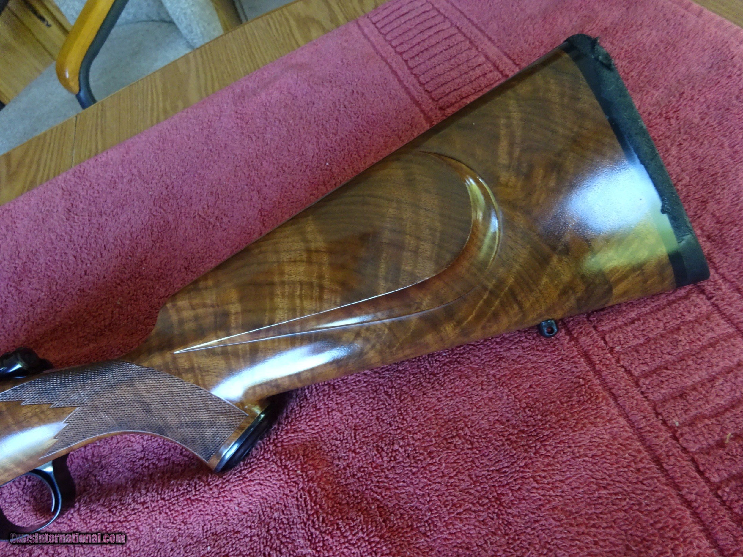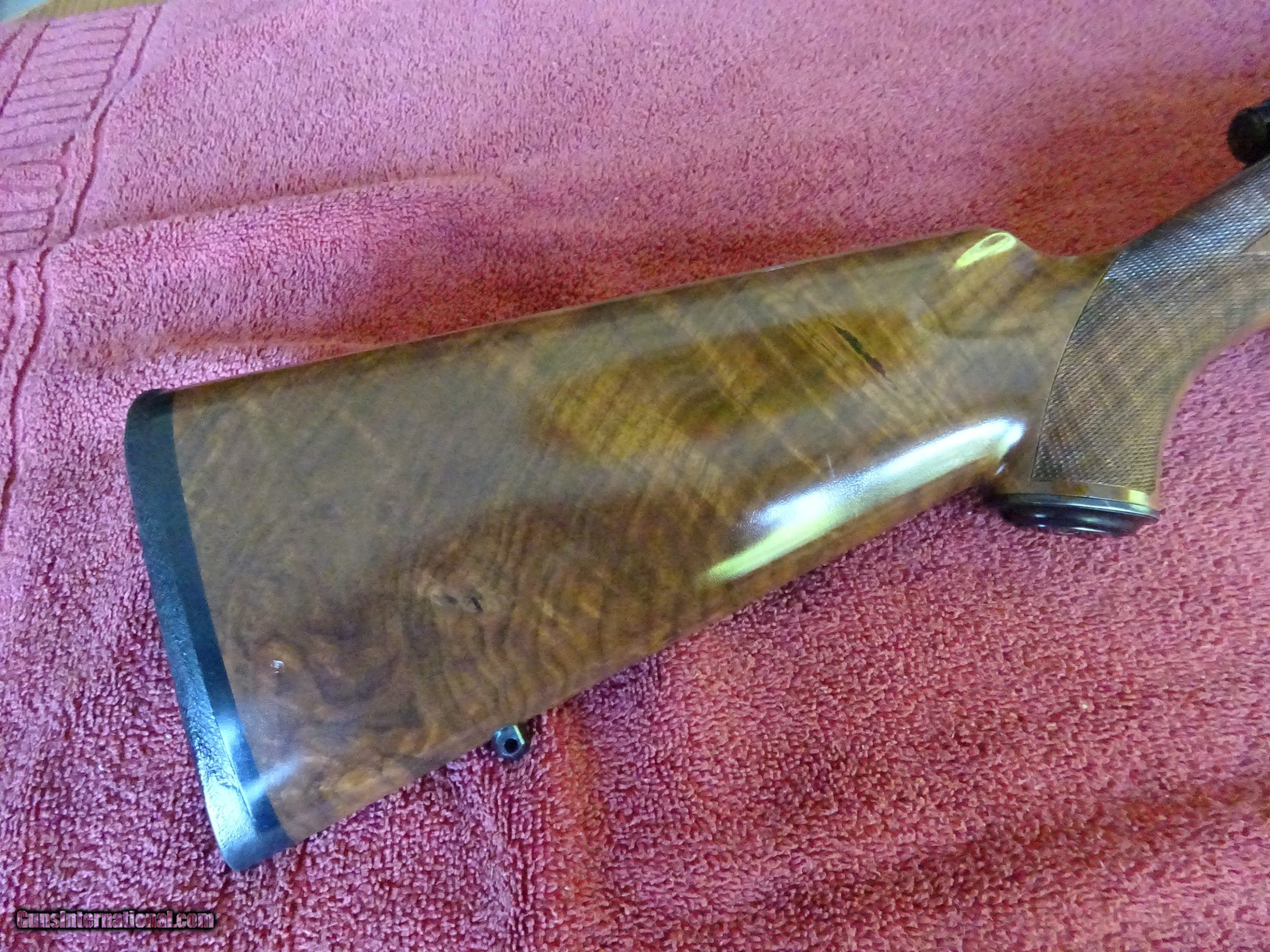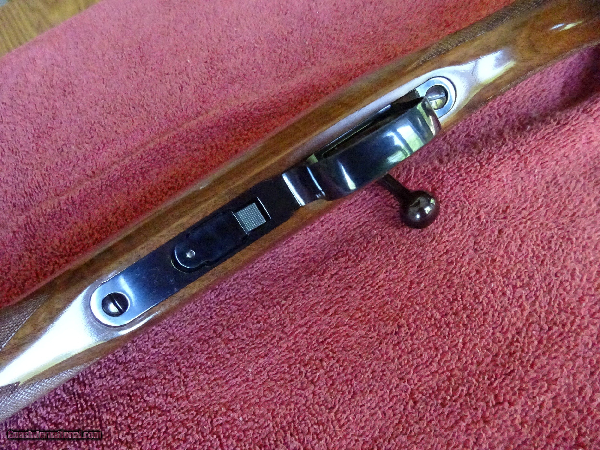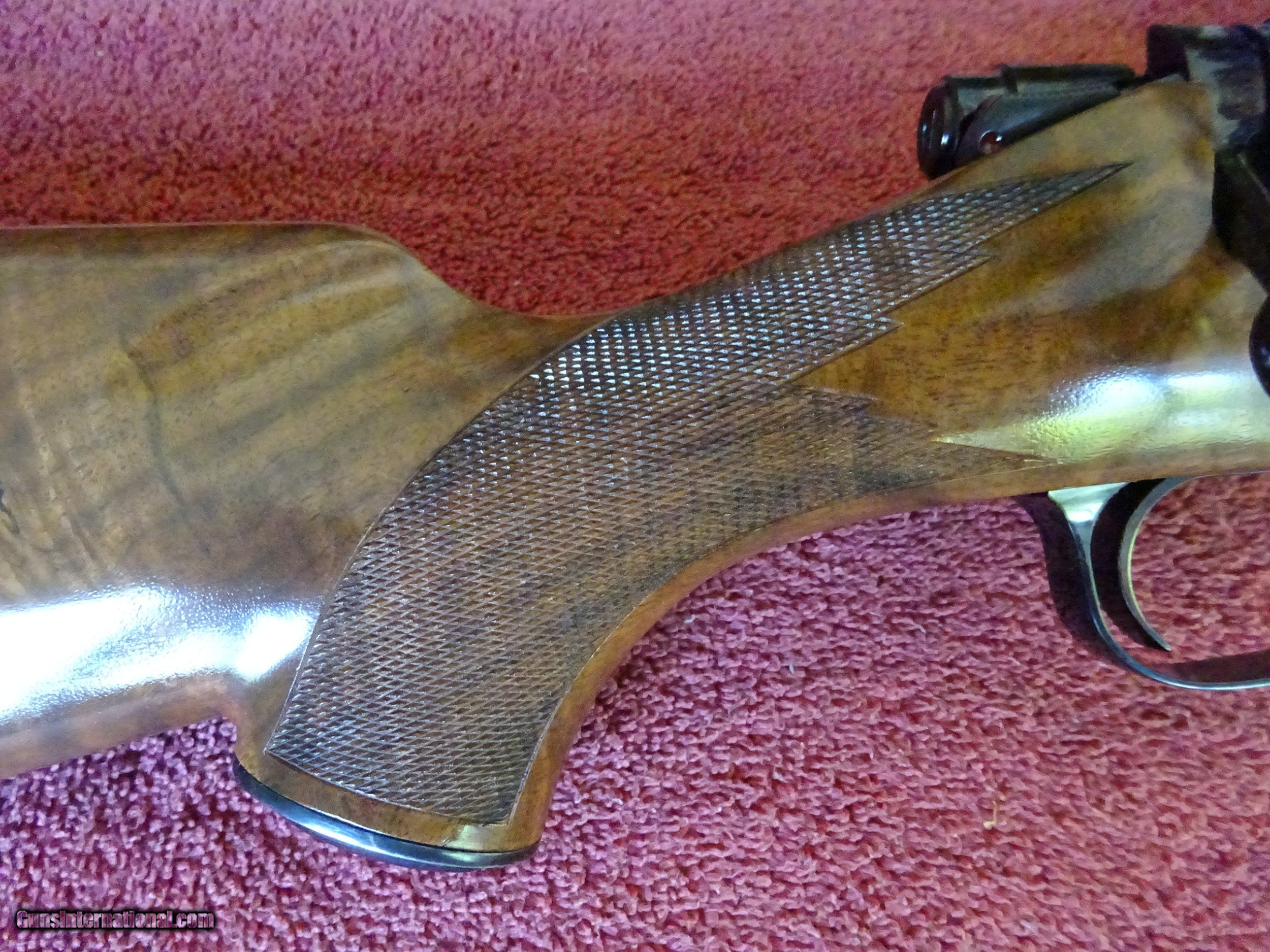 Description: KIMBER MODEL 82-C SUPER AMERICA, 22 LONG RIFLE. 100% HIGH LUSTER BLUE, MIRROR PERFECT BORE, NO OPEN SIGHTS, FACTORY DRILLED AND TAPPED RECEIVER WITH SCOPE MOUNTS. GORGEOUS HIGHLY FIGURED AMERICAN WALNUT STOCK WITH CHEEKPIECE, 24 LINES PER INCH WRAP-AROUND CHECKERING, STEEL GRIP CAP AND BLACK KIMBER MARKED PAD. EBONY FOREARM TIP, SLING SWIVEL STUDS. 100% ORIGINAL CONDITION. IT WOULD BE DIFFICULT TO FIND A MORE ATTRACTIVE AMERICAN-MADE SPORTING FIRLE. TRULY A GORGEOUS GUN. VERY MINOR HANDLING MARKS IN THE WOOD FINISH, NOTHING OFFENSIVE, GREAT GUN. MADE 1993-1999, 3 DIGIT SERIAL NUMBER, PROBABLY FIRST-YEAR PRODUCTION. $2000.00 + $50.00 Insured shipping to an FFL address. See all Pats gun listings on this site! We also have hundreds of pieces of ORIGINAL gun company advertising & memorabilia available for sale on our site SPORTINGCOLLECTIBLES. We have no reprints or reproductions. Email for more information. SOLD |