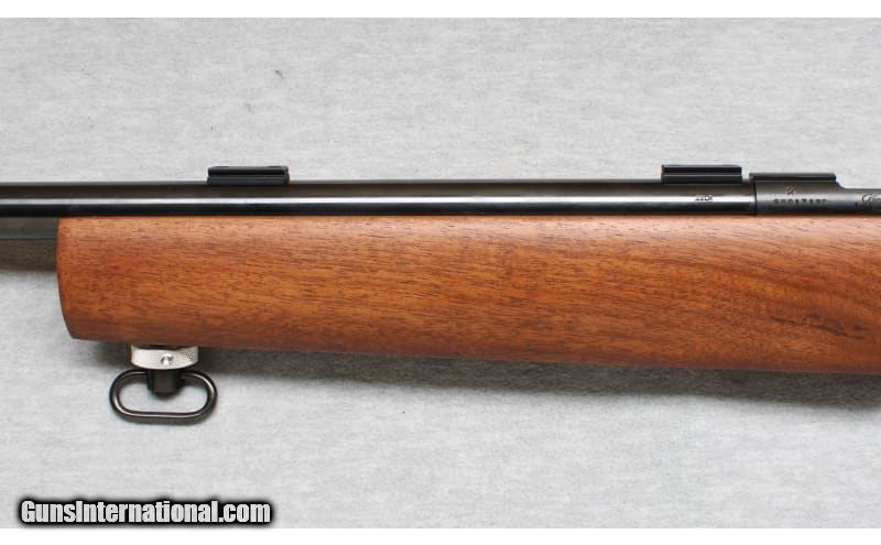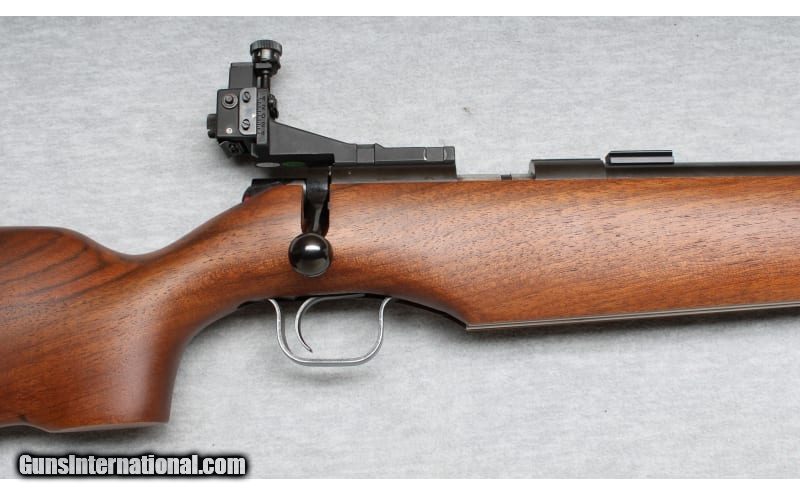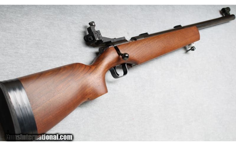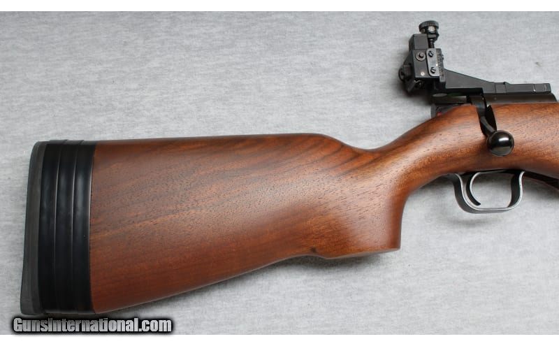 Description: Appears as new with original box. Single shot bolt action target rifle with numerous factory features. 25" heavy barrel, micro adjustable target sights and scope mounting blocks installed. Smooth action, light and crisp trigger pull, walnut stock with adjustable LOP spacers and aluminum channel for adjustable hand stop. An outstanding choice for rimfire rifle target shooting competitions. .22 Long Rifle SOLD Chambers: Bolt action Metal Condition: As new Wood Condition: As new Bore Condition: Bright Barrels: 25 Triggers: Factory Stock Dimensions: 13 1/2" LOP Fore End: Smooth with aluminum channel for adjustable hand stop Butt Pad: Factory Sights: Scope mounting blocks and micro adjustable target sight Item Location: La Vista, NE |