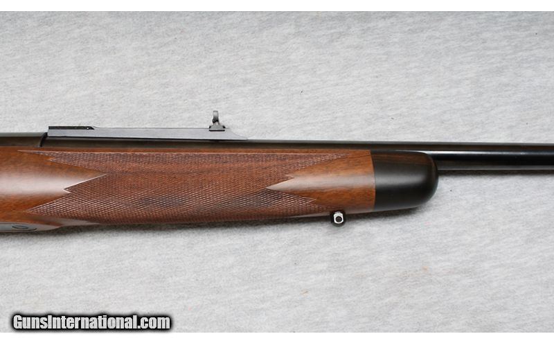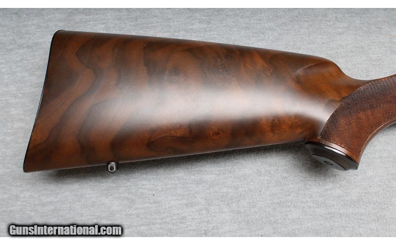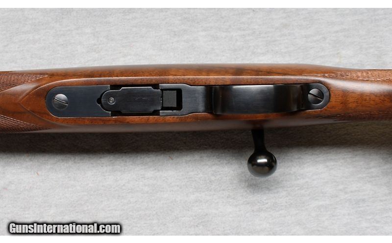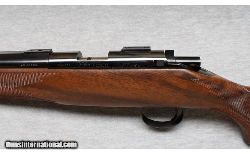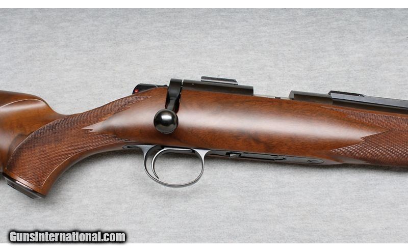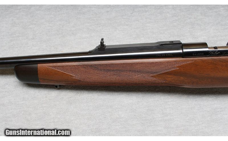 Description: This Kimber Model 82 is a right-hand bolt-action rifle in .22 WMR. Manufactured in Oregon with fixed ramp front sight, folding rear leaf sight on a quarter rib with integral scope base and a scope base on the rear of the receiver. It has a 22-inch barrel. The stock is finely checkered oil-rubbed walnut with black forearm cap and a black steel pistol-grip cap. It has sling swivel bases attached. It is in like-new condition. It comes with the original box and one magazine. .22 WMR SOLD Metal Condition: Like New Wood Condition: Like New Bore Condition: Like New Barrels: 22 Inches Triggers: Factoryt Stock Dimensions: LOP 13 3/4 Inches Fore End: Walnut Checkered Butt Pad: Metal pad Sights: "quarter rib, express sights with 3/8 Inch Dovetail bases. Item Location: La Vista, NE |