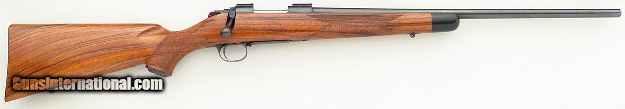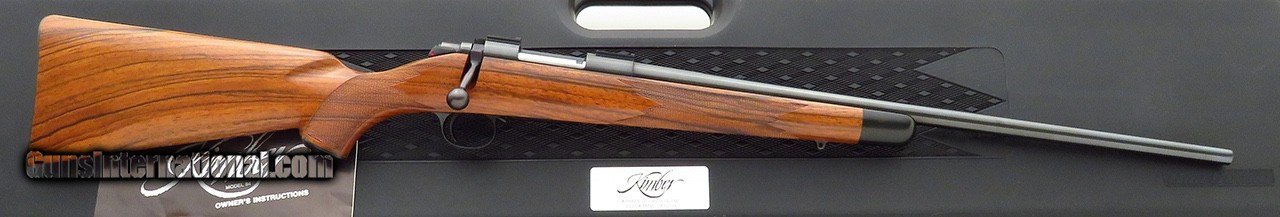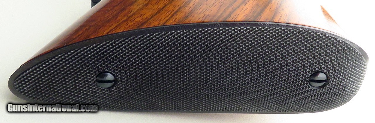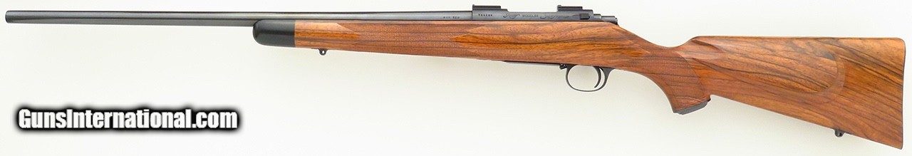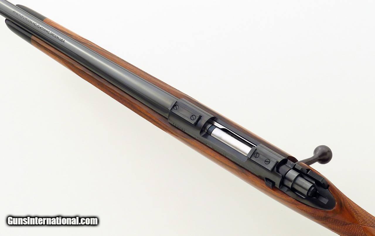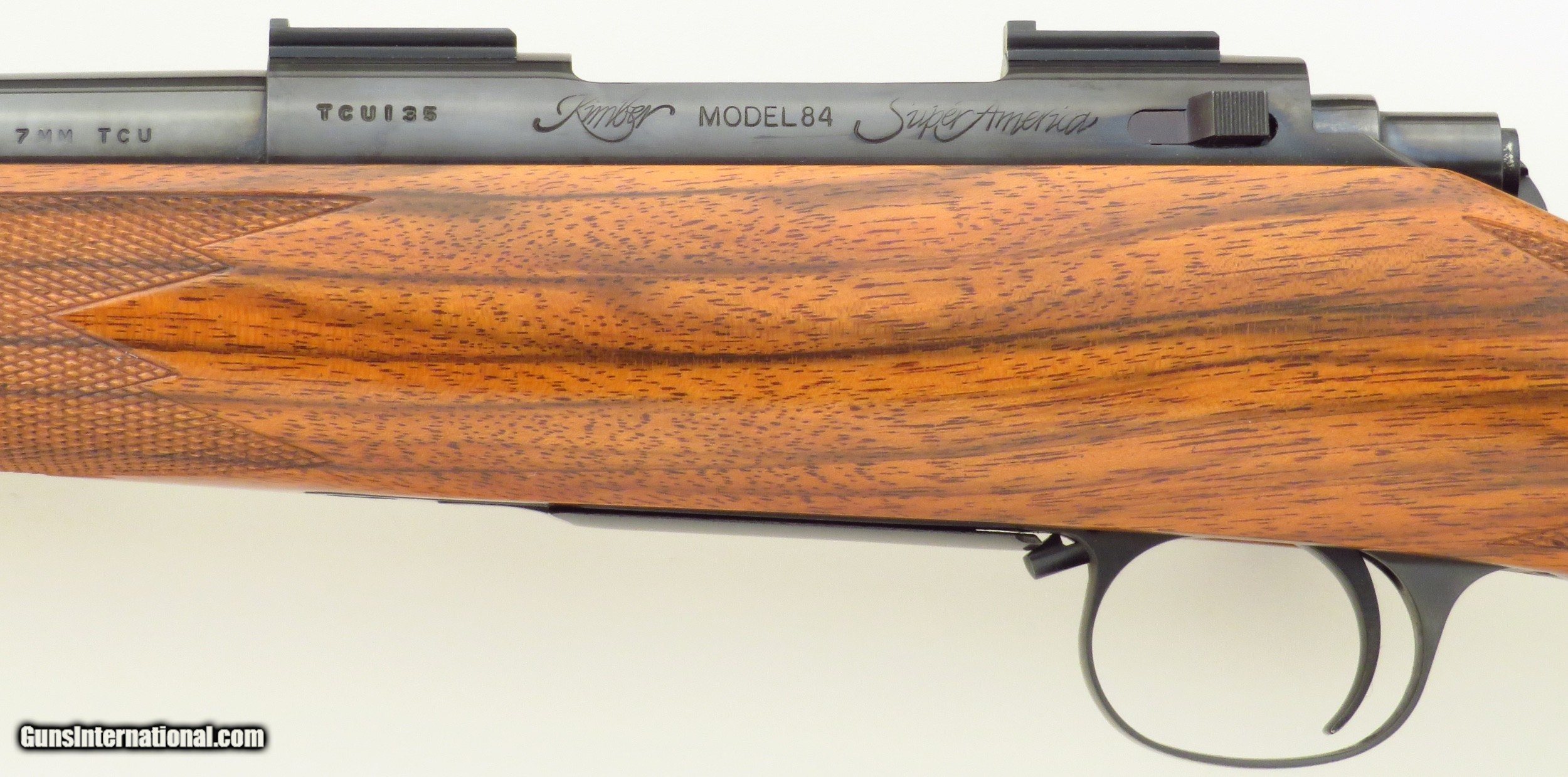 Description: Kimber Model 84 SuperAmerica 7mm TCU. Originating from the famed Earl Kelly collection, serial TCU135 is not only a rare caliber but wears an outstanding English walnut stock dressed with flawless wrap checkering. Features include a 21.5-inch barrel, polished blue finish, Kimber bases, rocker (disc) safety and steel bottom metal with an inside-the-bow release. The stock is dressed with an ebony forend tip, scalloped cheek rest with shadow line, steel grip cap, inletted (Howell-type) sling swivel studs and a Neidner checkered steel butt plate with widow's peak. DIMENSIONS: Weight is 6.2 pounds and the length-of-pull is 13.5 inches. CONDITION: New and unfired with the barest suggestions of handling. INCLUSIONS: The original Kimber hard case (stickered) and cardboard oversleeve (with Kel's handwritten notes on end), and factory manual are present. The price is firm and layaway is available. $7,500 plus shipping. SOLD |