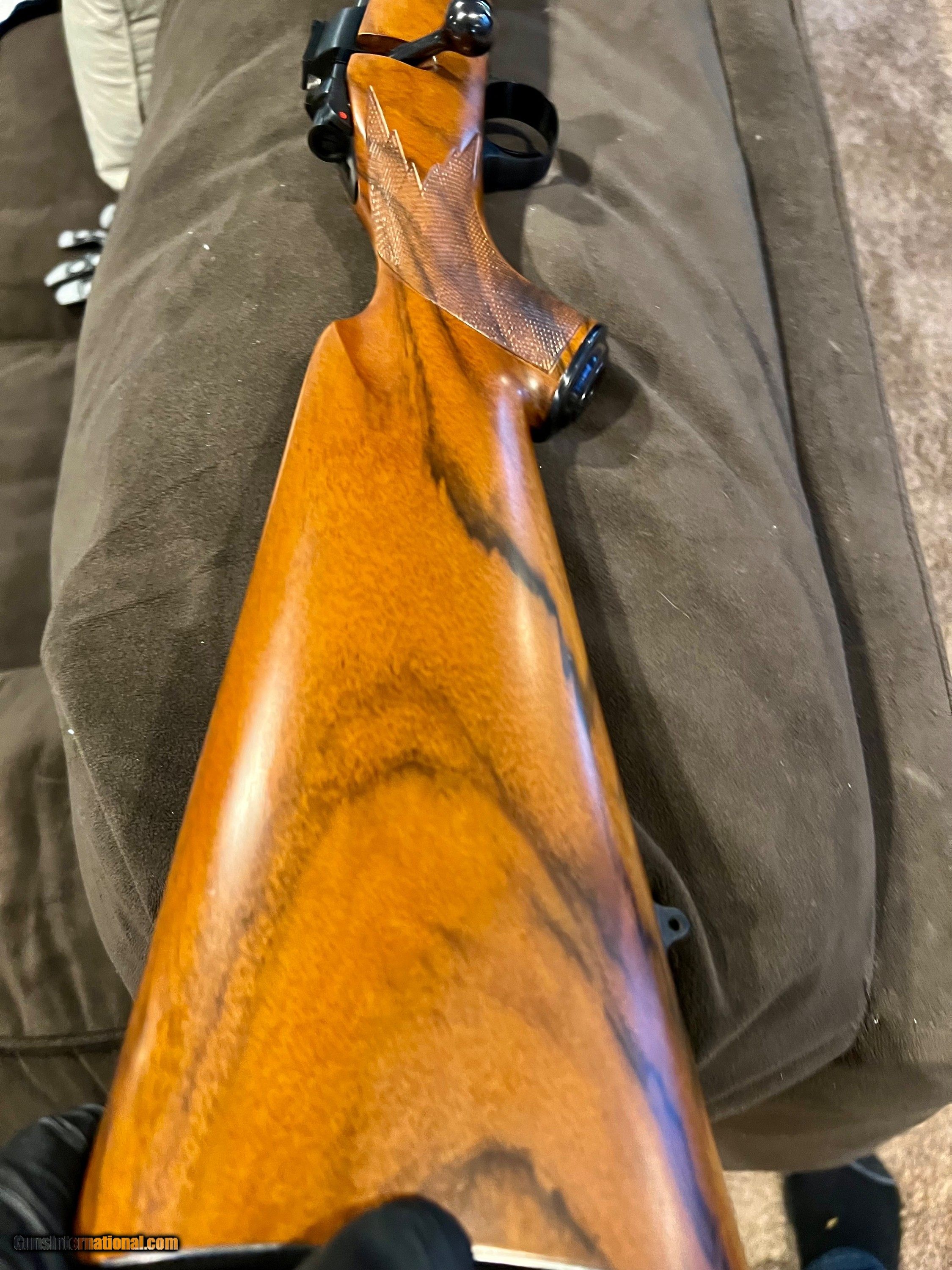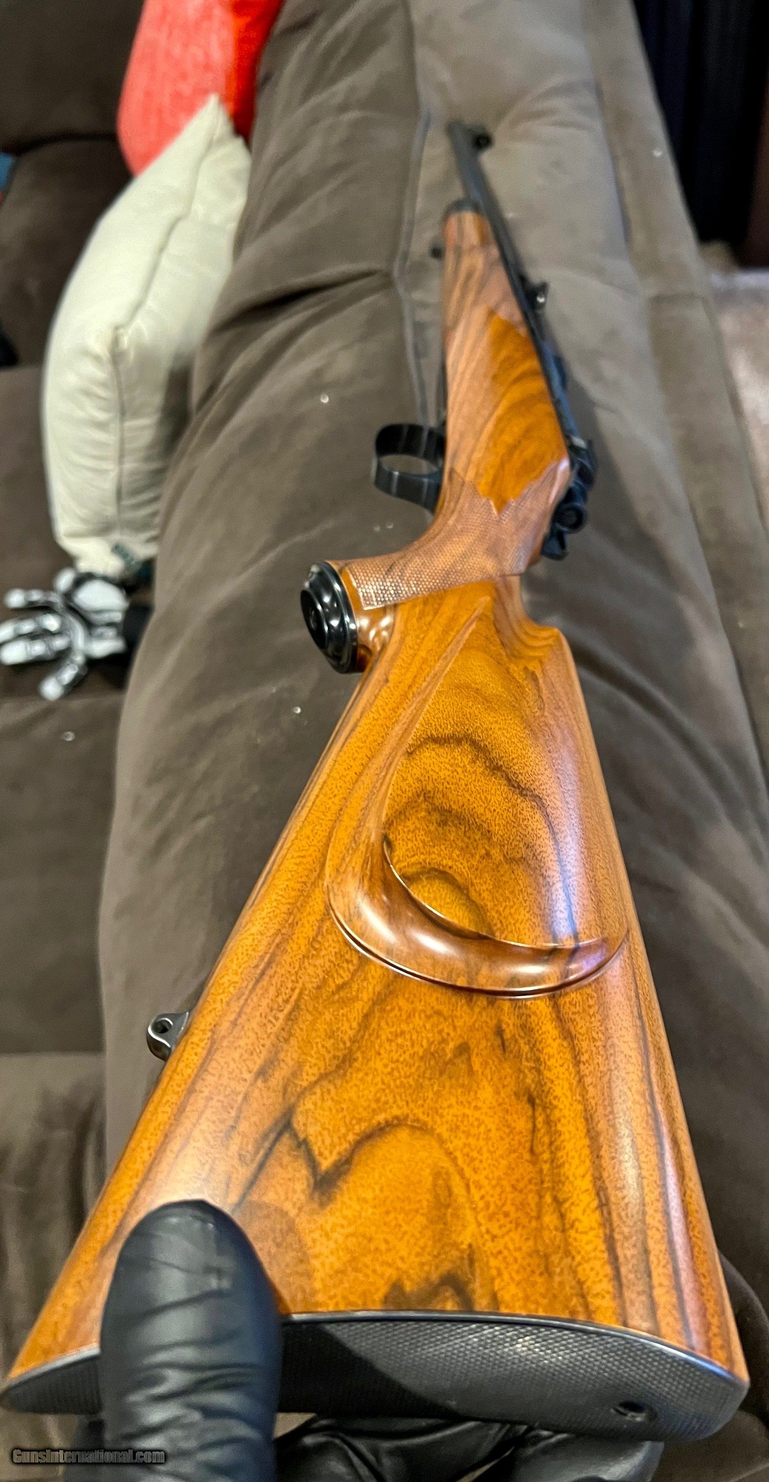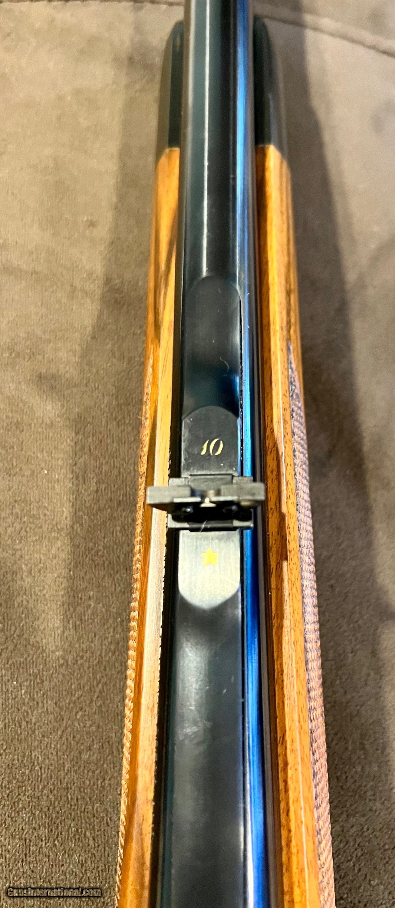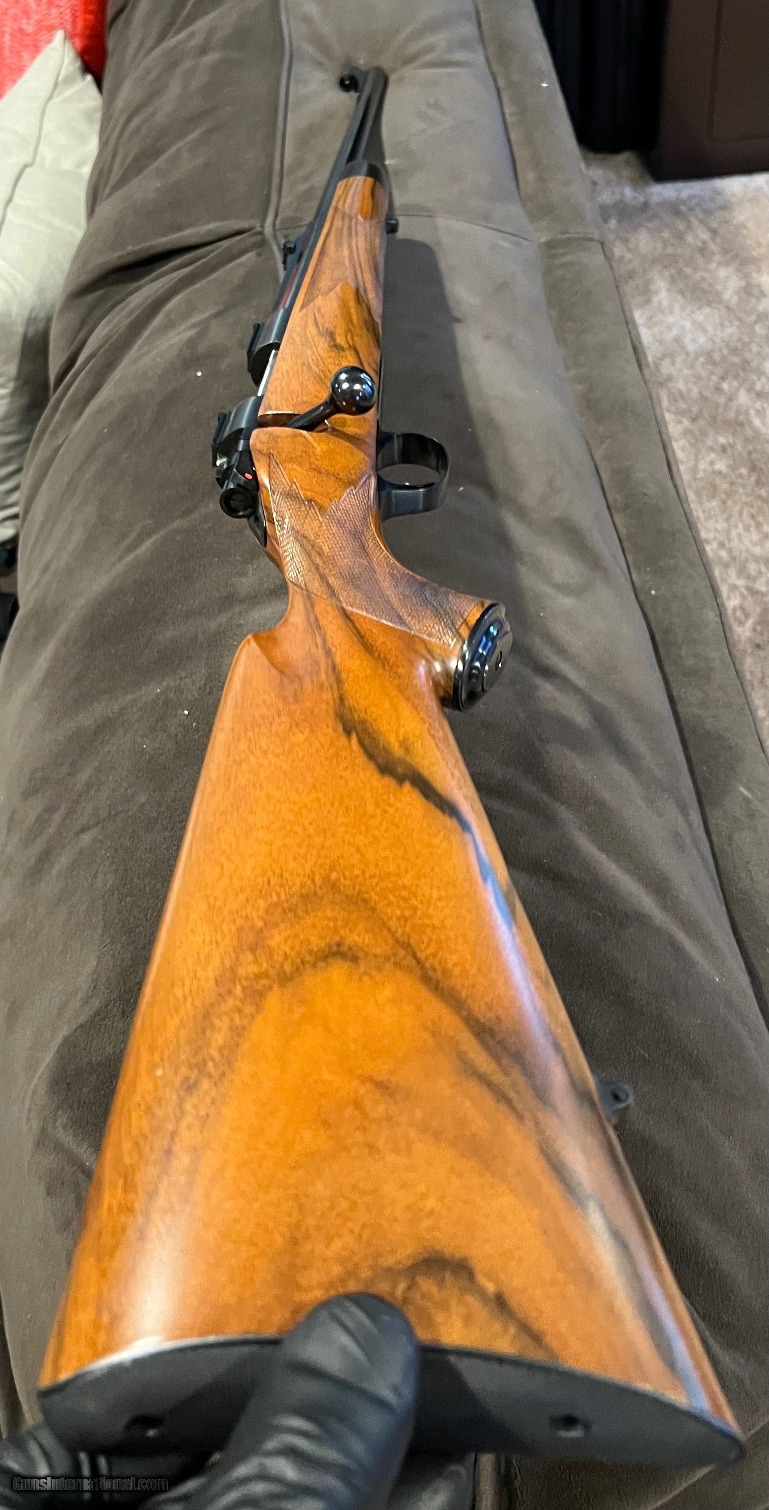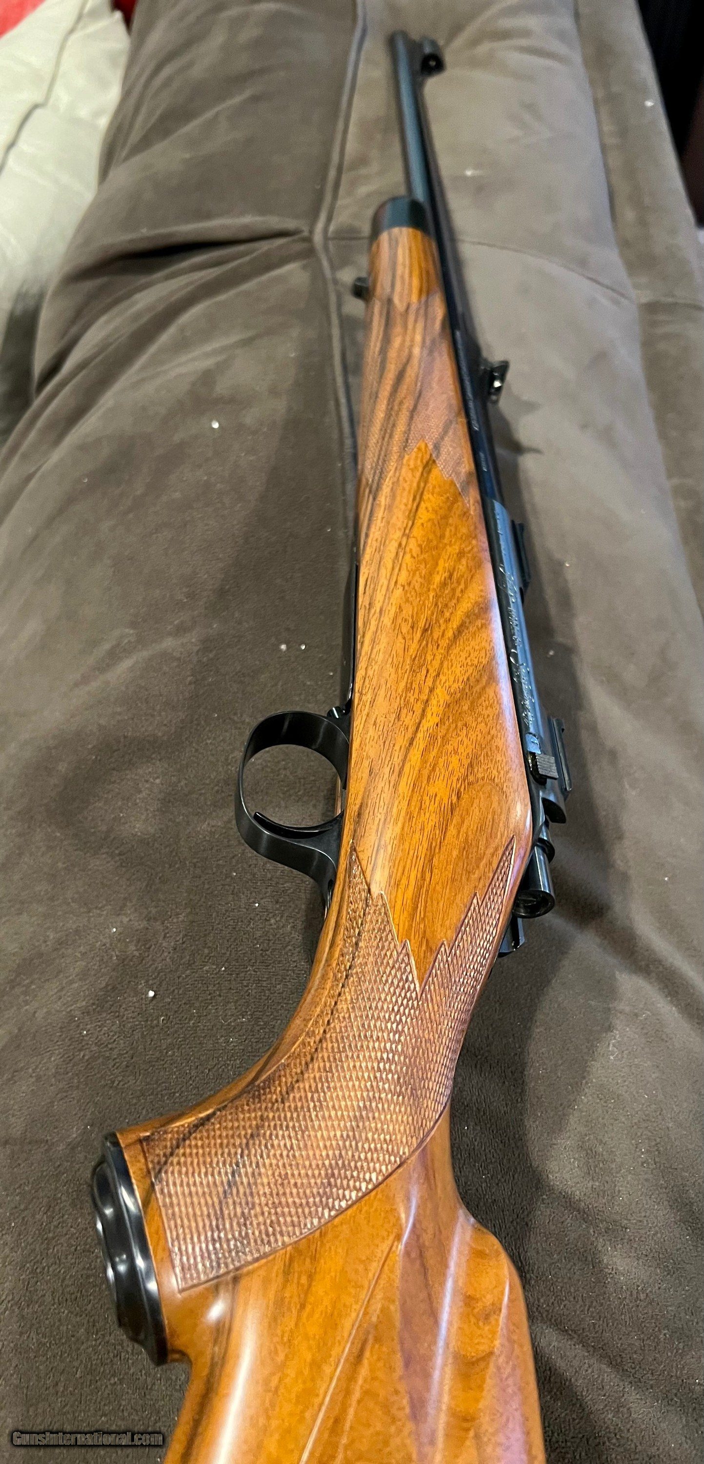 Description: Kimber of Oregon 84B 10th Anniversary Super America, NIB, less than 100 made, awesome wood, with box and papers!!! This is a Kimber Collectors holy grail rifle, made only one year 89-90 only 100 or less made. Kimber decided to make a limited edition rifle to celebrate their 10th year in business. The Warne's decided these rifles needed to be special, they shot all thier Super America rifles and only kept the best barreled actions for this edition. They next added special (on the 10th anniv only) hooded front and rib rear sights machined into the barrel, not just bolted on top. Now that they had their special barreled actions they added a gold ten and star on either side of the rear folding sight. Finally they decided these special rifles needed to be stocked in French walnut with a redesigned pattern, they are slim, trim, handy, and sleek. Most Kimber of Oregon collectors feel the Late 84B models were the best rifles they ever produced. This rifle is an 84B is in its factory box with papers. This is becoming a rare hard to find Rifle nowadays. DO NOT CONFUSE THIS WITH ALL THE INFERIOR RUSTED UP KIMBERS AVAILABLE ON THE WEB!!!! As you can see the wood is exceptional. It would make a fine edition to any collection. Factory Kimber Rings available for an additional charge. Feel free to call or text SOLD Rifle Caliber: .223 Remington Manufacturer: Kimber of Oregon Model: 84B 10th Anniversary Super America |