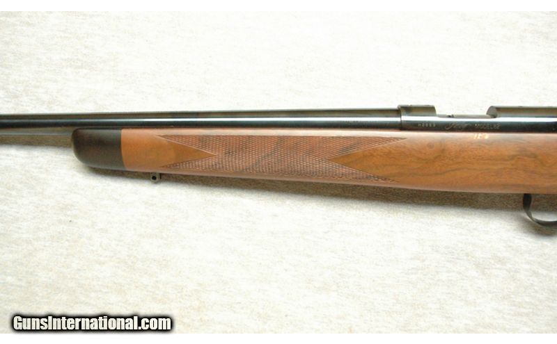 Description: This Kimber Model 82 is a right-hand bolt-action rifle in .22 Hornet. It has a 22-inch barrel. It is drilled and tapped for scope bases. No iron sights. The butt stock is walnut with a checkered grip and a black steel pistol-grip cap. The forearm is checkered walnut with a black fore-end cap. It has sling swivel bases attached. The centerfire .22 Hornet is a varminting and small-game hunting cartridge that was introduced in 1930. It has ballistics somewhere between the .22 WMR and the .223 Remington. It comes with the original box. This rifle appears to be unfired. .22 Hornet SOLD Chambers: .22 Hornet Metal Condition: Like New Wood Condition: Excellent with a few dings Bore Condition: Like New Barrels: 22 Inch Triggers: Factory Stock Dimensions: LOP 13 1/2 Inch Fore End: Checkered Walnut Butt Pad: Steel Butt Pad Sights: Drilled and tapped for scope base Item Location: La Vista, NE |
