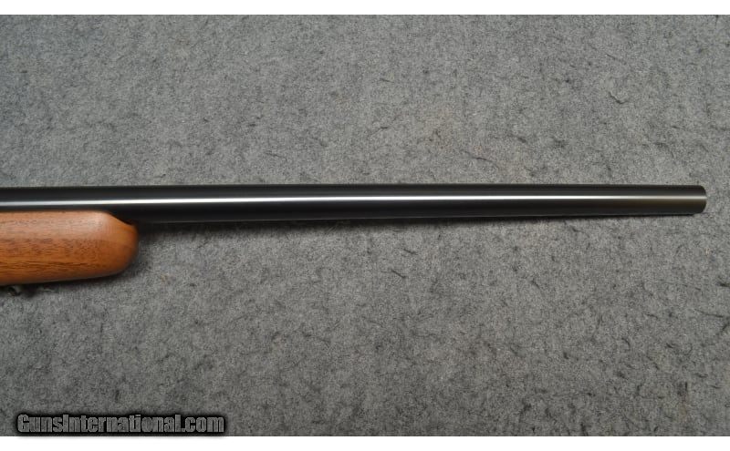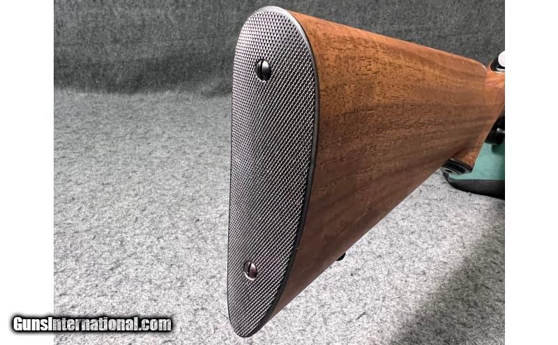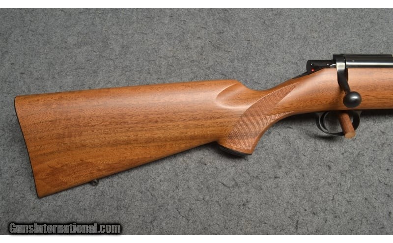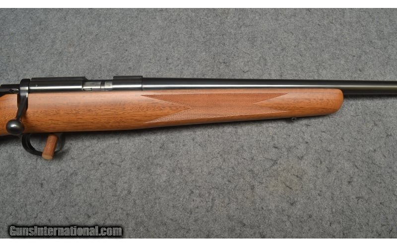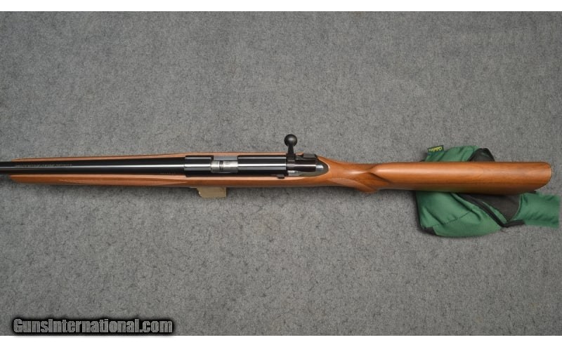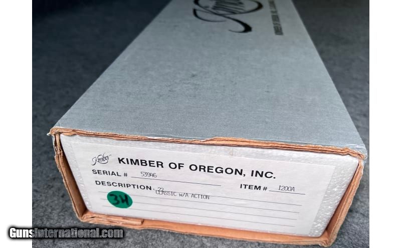 Description: This early 80s rimfire bolt action rifle is a Kimber of Oregon Model 82 with "A" action chambered in .22 Long Rifle. It has a rotating two-position safety on the right side of the receiver, a grooved receiver, sling studs top and bottom, a very beautifully crafted walnut stock with diamond checkering on the fore arm and pistol grip, checkered steel butt plate, steel pistol grip cap, and a Mauser type rear locking bolt action. The underside of the bolt handle is marked with the serial number. It is in "As New In the Box" condition, appearing to have never been fired. The bluing is in excellent condition, showing no noticeable marks or loss anywhere. Likewise, the exquisitely wood grained walnut stock is in excellent condition, showing absolutely no handling wear or marks. This rifle comes with the original Kimber of Oregon box, instructions, warranty card, plastic liner, styrofoam, and one magazine. .22 Long Rifle SOLD Metal Condition: "Bluing is in excellent condition, showing no noticeable marks or loss anywhere Wood Condition: "Entire stock is in excellent condition, showing absolutely no handling wear or marks Bore Condition: "Very bright and shiny, with strong rifling. It appears that this firearm has never been fired. Barrels: 22" barrel Triggers: Wide smooth trigger Stock Dimensions: "13¾"" LOP, 40¾"" overall length Fore End: Diamond checkered walnut fore arm and diamond checkered pistol grip stock Butt Pad: Checkered steel butt plate Weight: 6 lb 8 oz Sights: "No sights, receiver is grooved for a scope mount Item Location: Wichita, KS |