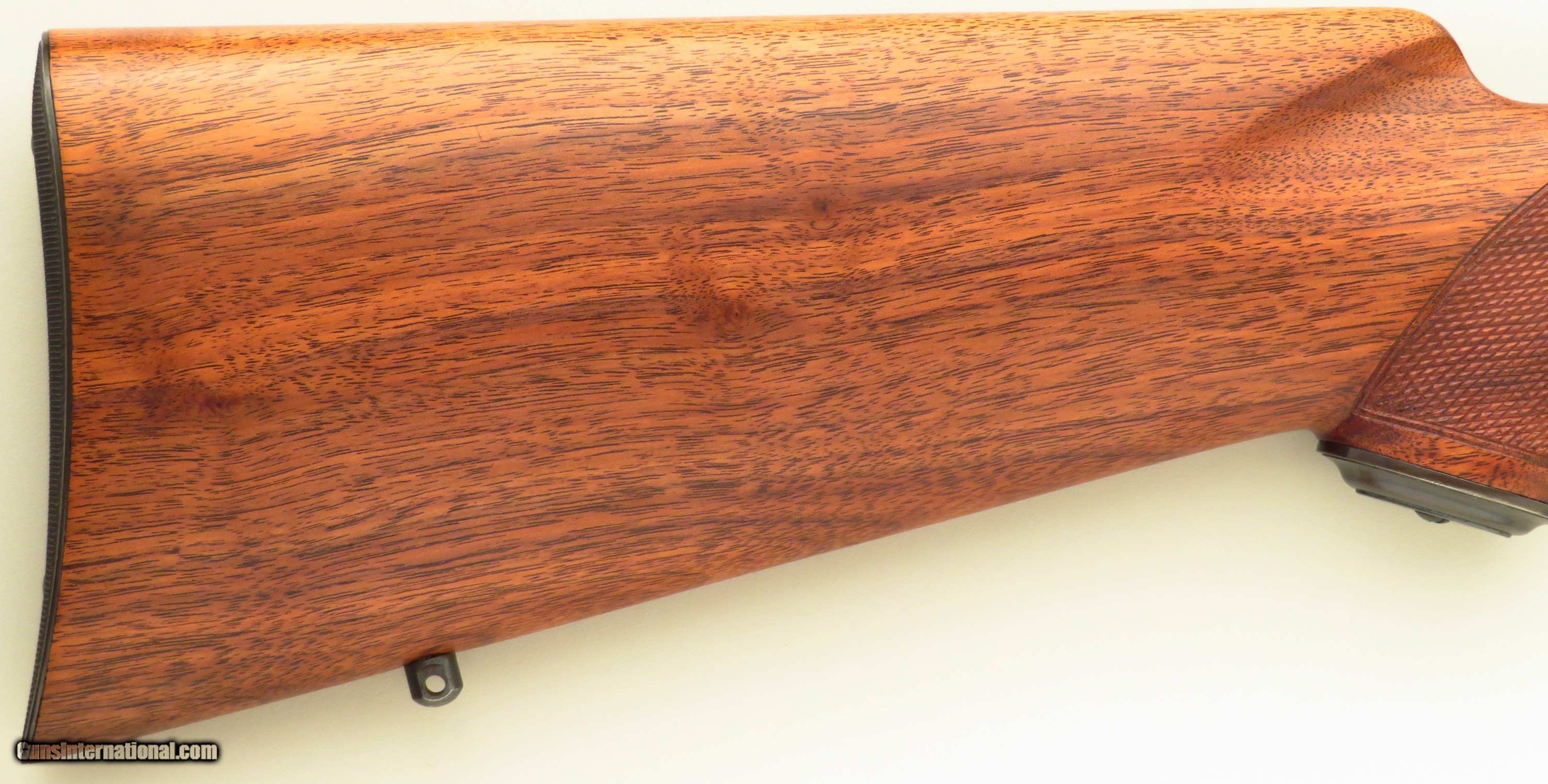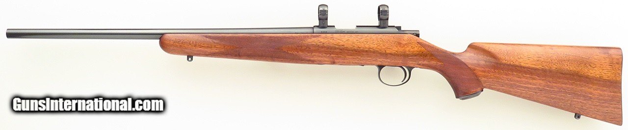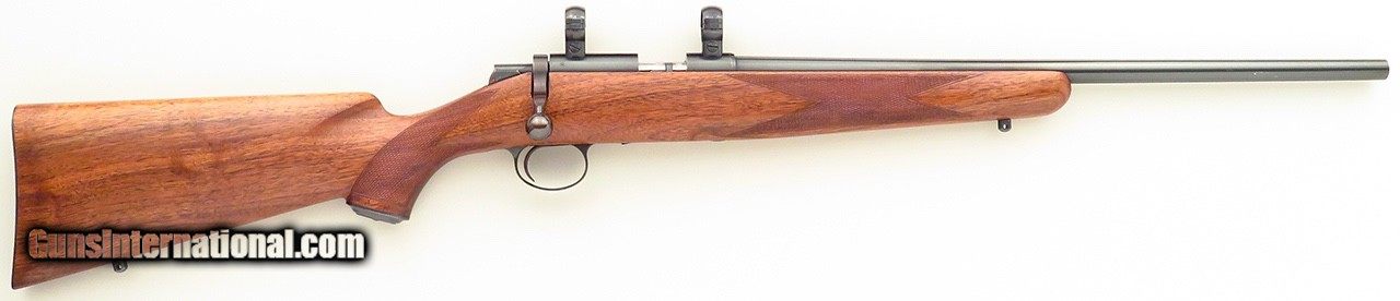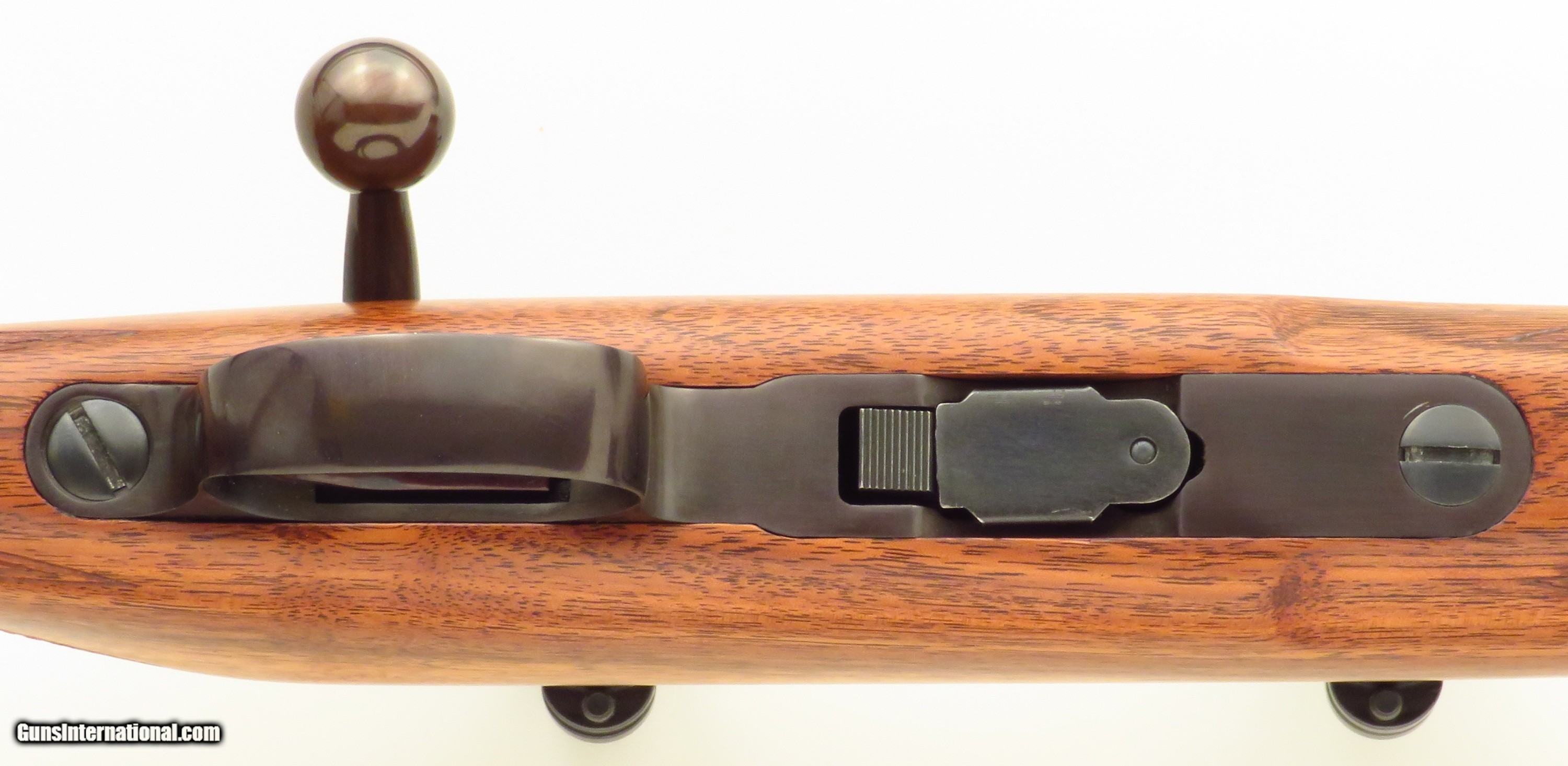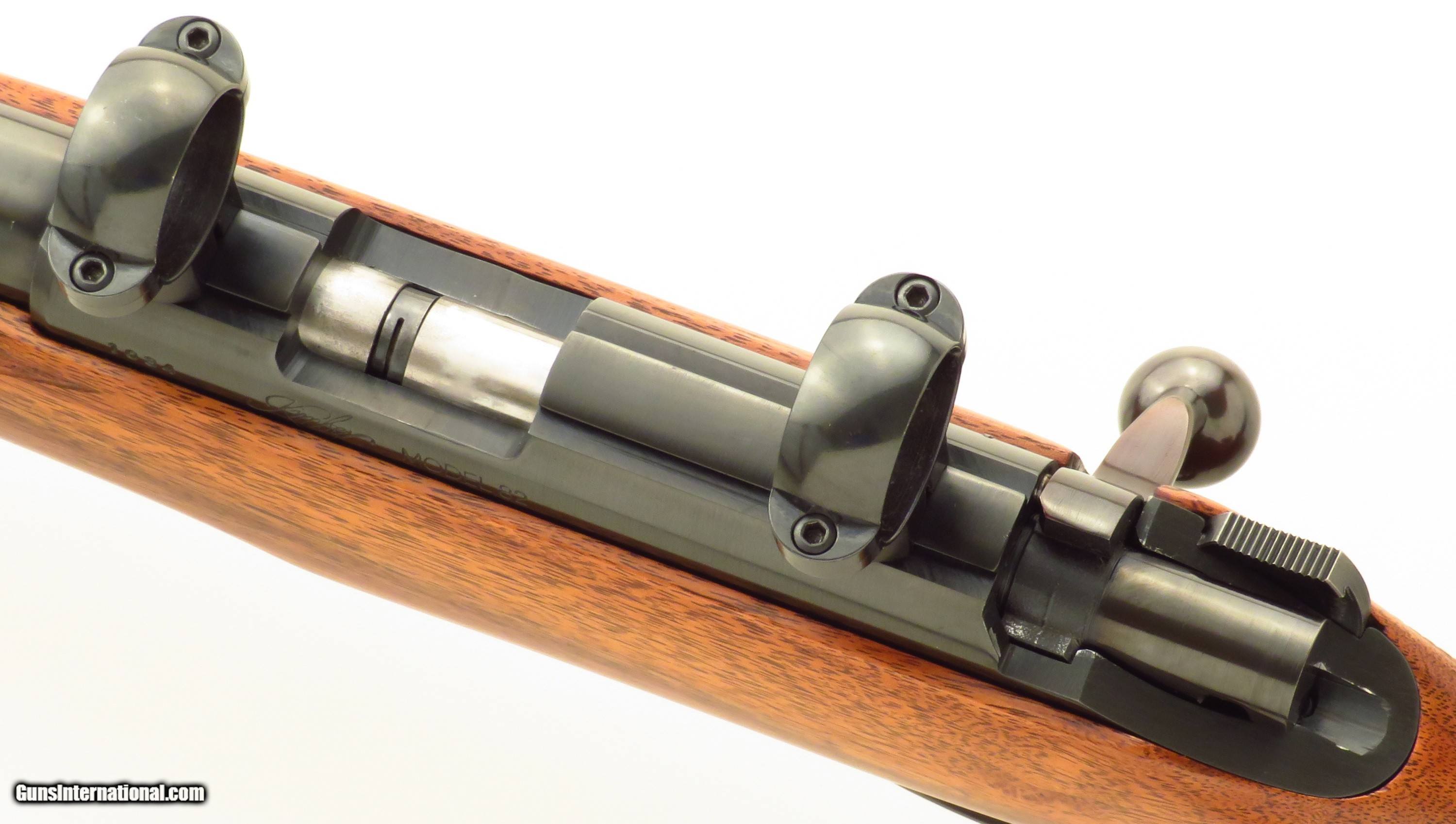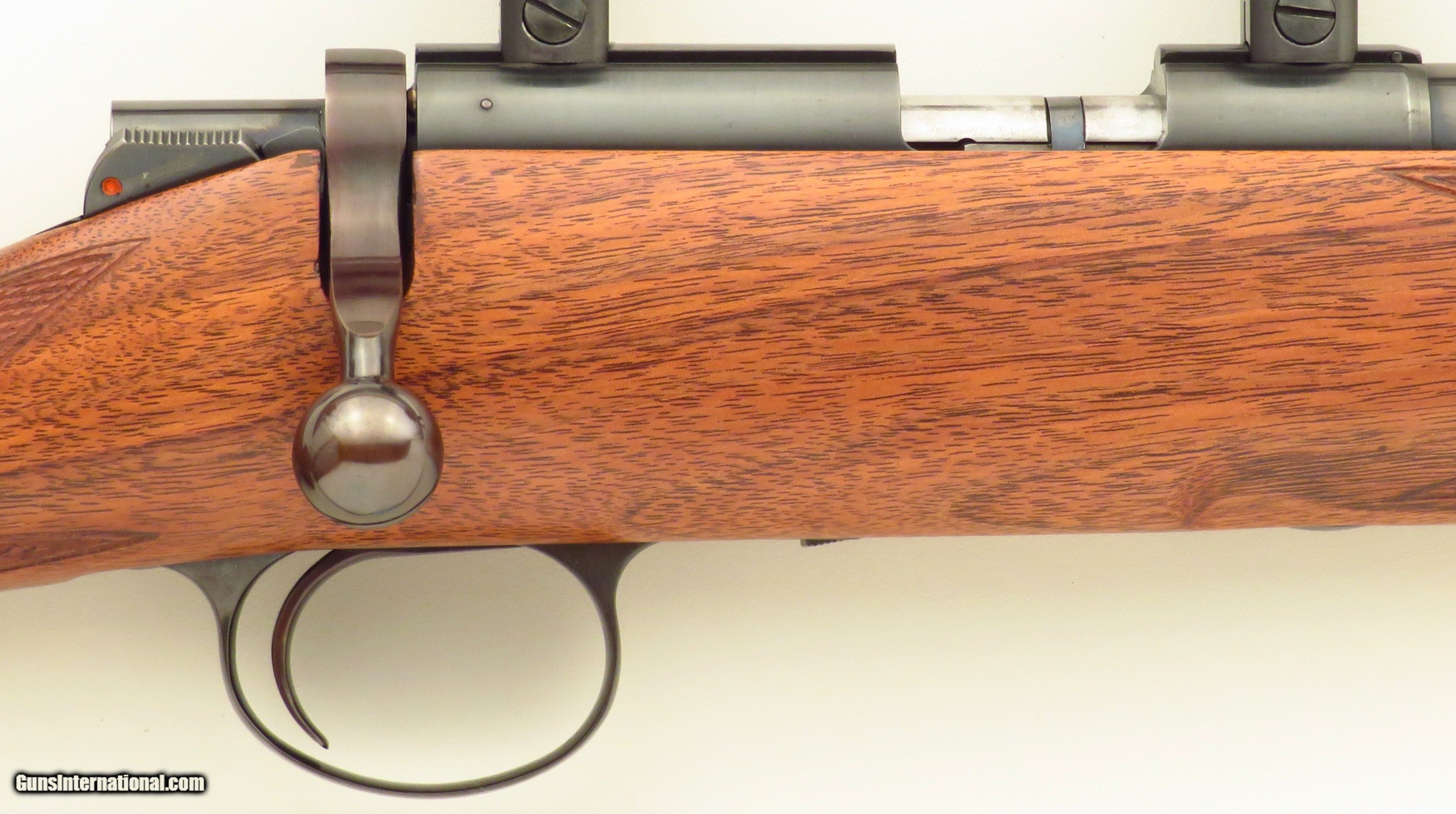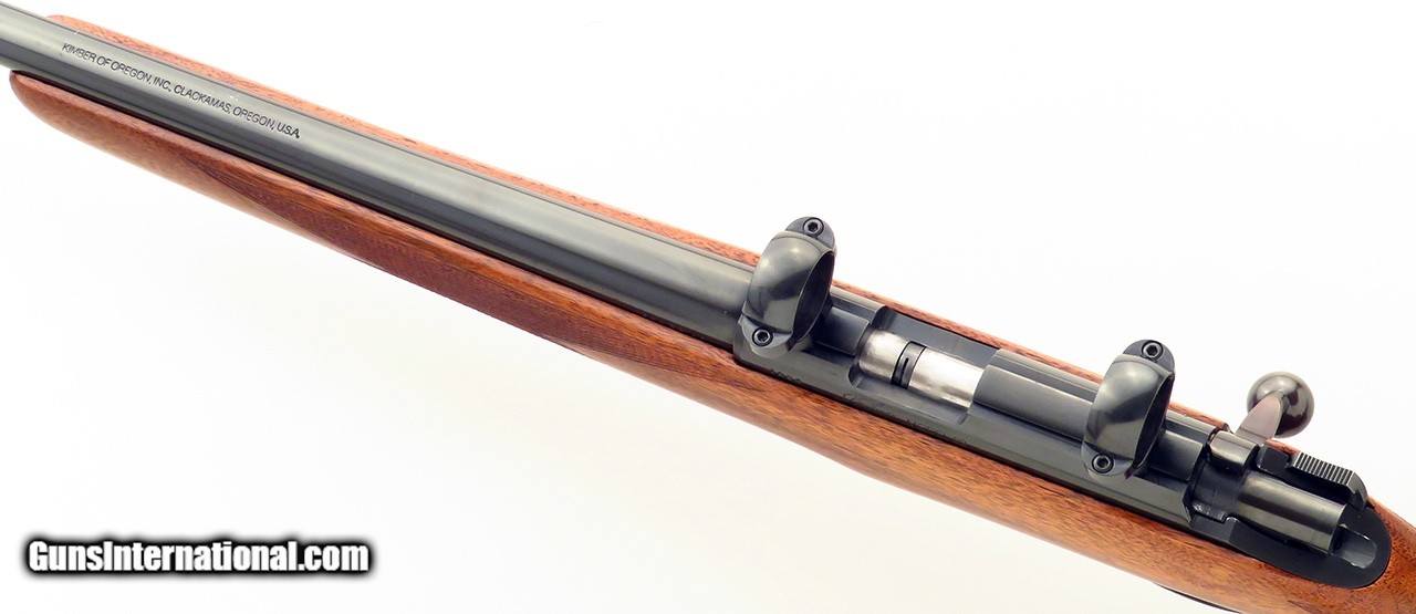 Description: Kimber of Oregon Model 82 .22 LR. An early rifle with serial 1034, features include a 20-inch barrel (shortened from 22 inches, recrowned), dovetailed receiver, straight bolt handle, disc safety, bordered panel checkering, steel grip cap, checkered steel butt plate, sling swivel studs and a five-round magazine. Rings (1-inch, medium) are attached. DIMENSIONS: Weight is 6.4 pounds and the length-of-pull is 13.75 inches. CONDITION: The bore is outstanding, strong and bright. Metal finish is approximately 97 percent owing to a few minor ribs and scratches on the barrel. Wood is approximately 99 percent. No box, papers or additional accessories. The price is firm. $1,000 plus shipping. SOLD Rifle Caliber: .22 Long Rifle |