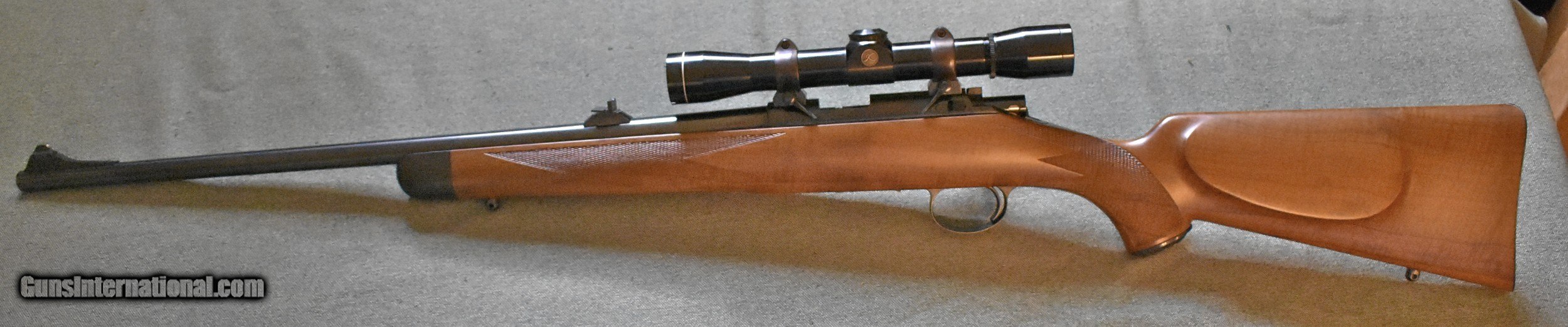 Description: Kimber of Oregon model 82 S set of three rifles. 22 long rifle,22 magnum,and 22 hornet. Each rifle is serial numbered 345 with a letter designation for each caliber. The long rifle is S345, the magnum is M345,and the hornet is H345. All 3 appear to be unfired and retain 100% finish. The long rifle and the magnum have Kimber 4X scopes installed. The hornet has a Leupold 4X installed. All three were ordered with a one standing one folding rear sight and a ramp front sight. Each comes with their original boxes. This is an extremely rare set of rifles that I would prefer to sell as a set. I can take a partial trade on the set. They would make an unusual addition to any collection. I have been told that there were only 500 S series rifles built in each caliber. give me a call and lets talk about it. The photos below are in order. 22 long rifle,22 magnum,and 22 hornet. SOLD Rifle Caliber: .22 Long Rifle Manufacturer: Kimber of Oregon Model: 82 S series Serial Number: 345 Metal Condition: new Wood Condition: new Bore Condition: new Action: bolt Butt Pad: Neidner steel buttplate |