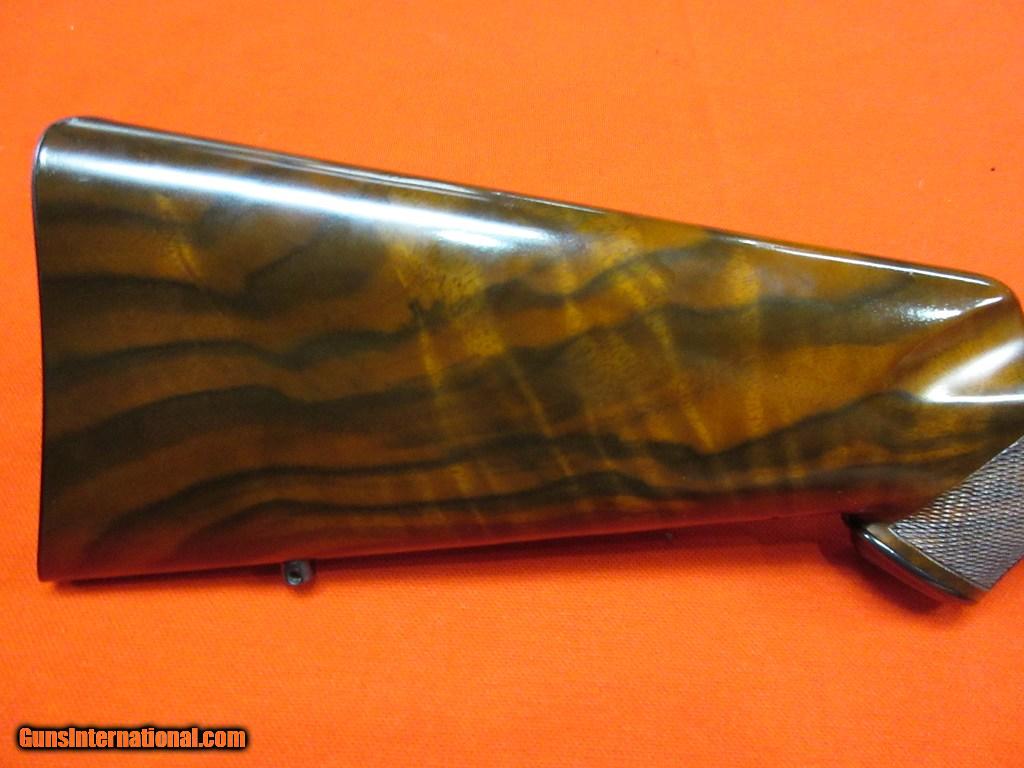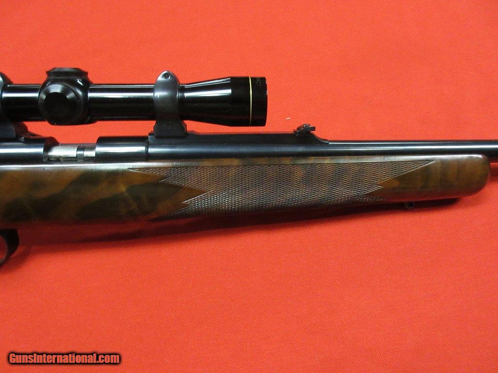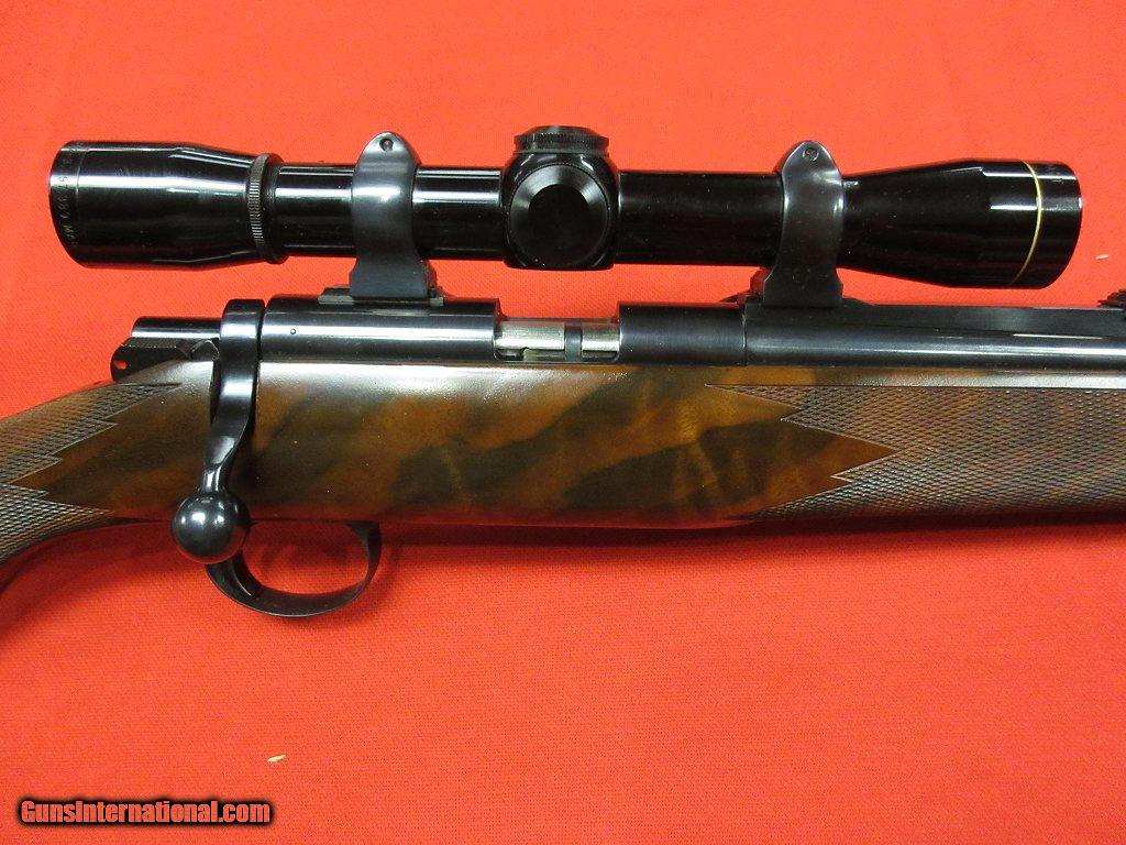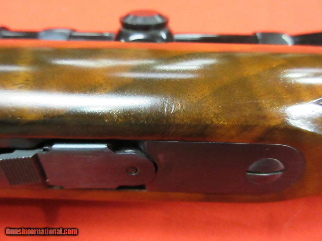 Description: Kimber of Oregon Model 82 Super America: Factory original and test fired only condition, highly figured walnut stock with checkering, Niedner checkered steel butt plate with a widows peak, detachable magazine, steel grip cap, factory sling swivels, quarter rib, folding rear sight, hooded front sight, topped with a Leupold M8 4X scope with factory hand detachable vertical scope rings. SOLD |
