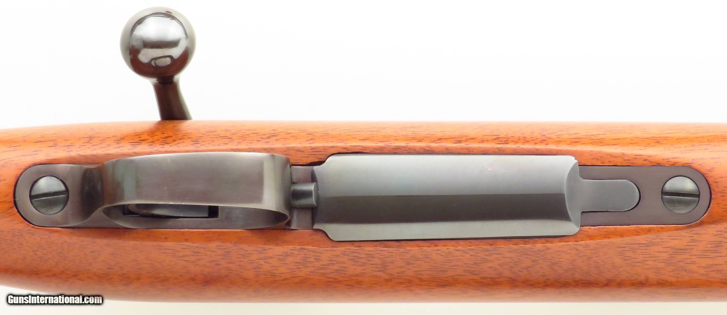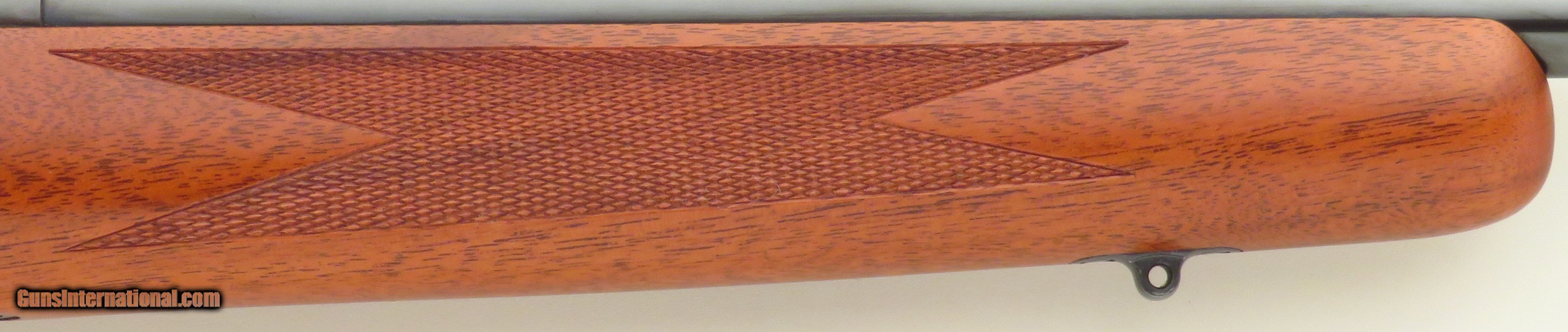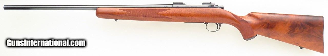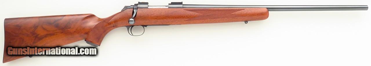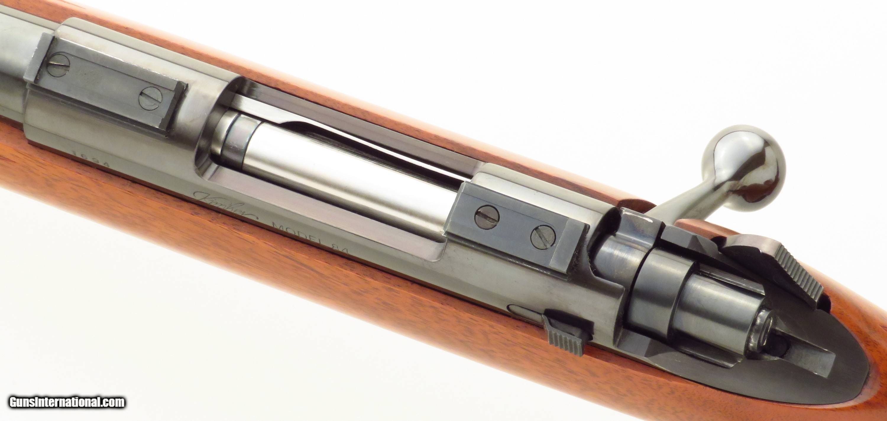 Description: Kimber of Oregon Model 84 .223 Remington. An early rifle with strong wood character, serial 1694 has a 22-inch sporter barrel. Features include a polished blue finish, round receiver with attacked Kimber bases, disc safety, checkered steel butt plate, steel grip cap and inletted sling swivel studs. No box or papers. DIMENSIONS: Weight is 6.2 pounds and the length-of-pull is 13.65 inches. CONDITION: The bore is strong and bright. Metal and wood finishes are each approximately 97 percent. $1,850 plus shipping. SOLD Rifle Caliber: .223 Remington |