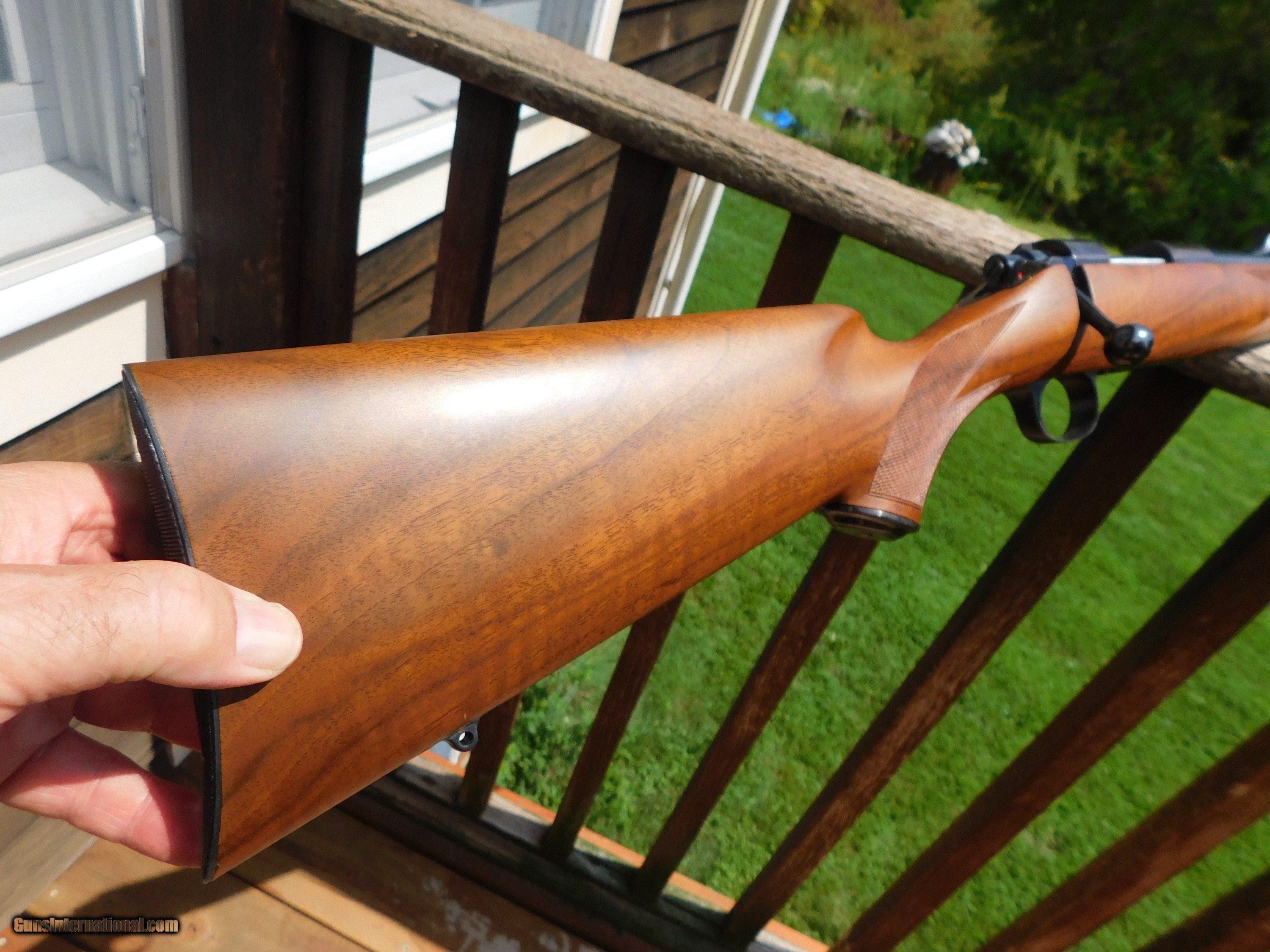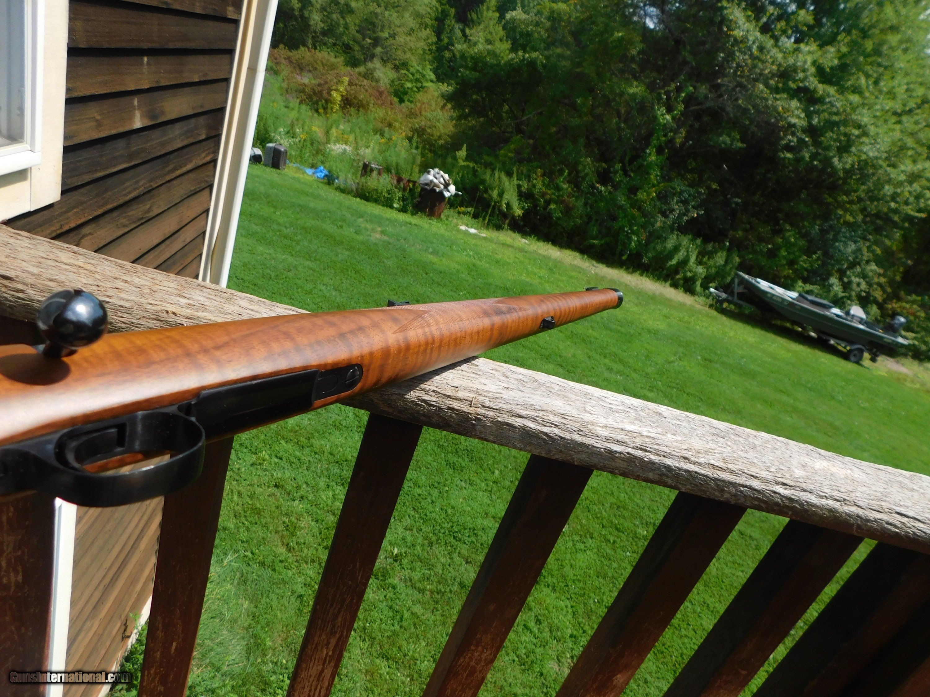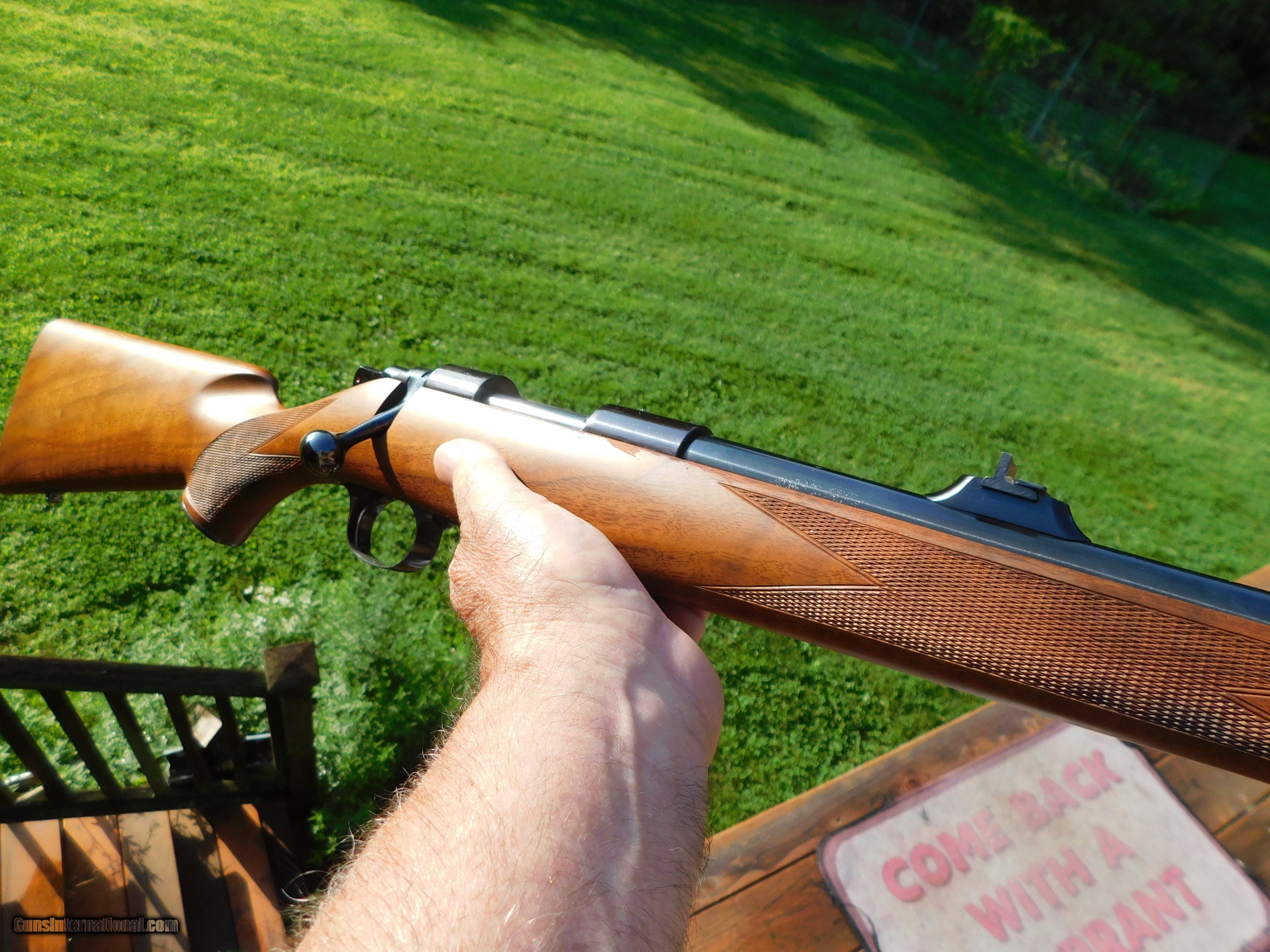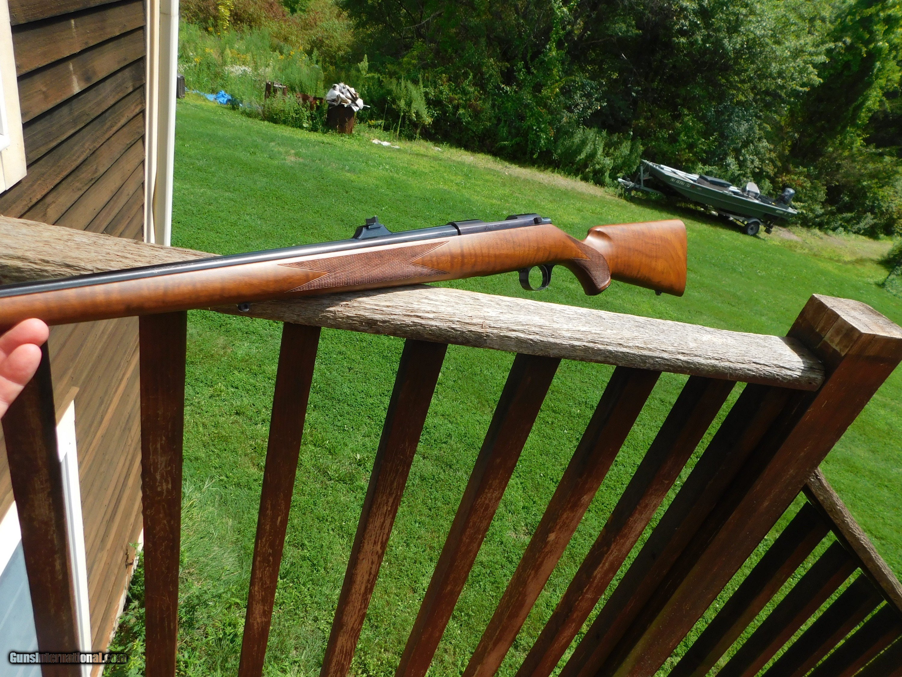 Description: This stunning little (38" overall 6 1/2lbs) 222 Mannlicher Stocked Carbine appears to have never been used. Something has caused some loss of blue on the barrel in the form of numerous very very small flecks where the blue has come off but the conditon otherwise both of metal as well as the handsome classic mannlicher stock is unmarked save for the distintice tiger striping on the forend and handsom figure on the butt stock Steel PG Cap and Neidner type checkered steel butt plate helpf to distinquish this fine firearm from others. We have priced it low enough to more than cover the cost to reblue should you wish to do this but it is not necessary as these marks are miniscule and as it sits it is still a beauty and a keeper. Its only the 2d one like it we've ever had; the last one sold for 3k or more. We also have 2 Kimber of Oregon Model 82 22's in approx new conditon Shipping is $ 65.00 insured. IF IT DOES NOT SAY ."SALE PENDING, UNDER DEPOSIT or ON HOLD"...IT IS AVAILABLE. WE DO NOT REPLY TO INQUIRIES THAT SAY "INTERESTED IN THIS GUN" OR "IS IT AVAILABLE" IF YOU WOULD LIKE TO BUY THIS OR ANY OF OUR GUNS WE SUGGEST YOU PHONE US; WE ARE OFTEN AVAIALABLE LONG HOURS. IF YOU ARE INTERSTED IN A GUN THAT IS UNDER DEPOSIT AND WOULD LIKE TO BE NOTIFIED IF A SIMILAR GUN COMES IN DROP US A LINE AND WE WILL MAKE EFFORTS TO CONTACT YOU WHEN ONE DOES COME IN. WE HAVE OVER 2000 SALES ON ALL SITES WITH AN A+ RATING ON ALL WE ALSO KEEP AN INVENTORY OF OLDER PERIOD CORRECT SCOPES; CALL WITH NEEDS WE MOSTLY PICK VERY CLEAN AND LIGHLTY USED GUNS. WE ARE HAPPY TO TAKE CONSIGNMENT GUNS AND COLLECTIONS OR WILL BUY YOURS OUTRIGHT. WE SOMETIMES ARE EMPLOYED FOR ESTATE PURPOSES AND VALUATIONS. AT THIS TIME WE ARE ONLY ACCEPTING US POSTAL MONEY ORDERS OR BANK CHECKS FOR PAYMENT IT IS THE BUYERS RESPONSIBILITY TO GET US A COPY OF YOUR RECEIVING FFL'S LIC AND A COPY OF YOUR PHOTO ID BEFORE THE GUN SHIPS YOU MUST CALL OR CONTACT YOUR FFL.WE DO NOT CALL FOR YOU UNLESS THEY RQUIRE IT. LAYAWAY PURCHASES NOT COMPLETED ON ANY RETURNED ITEM UNLESS NOT AS DESCRIBED OR DAMAGED ARE SUBJECT TO A 10% RELISTING/RESTOCKING FEE AND MUST BE RETURNED WITH NO NEW MARKS OR SCRATCHES, SENT BACK INSURED, PRIORITY SIGNATURE REQUIRED. ALL INFORMATION CONTAINED HEREIN IS BELIEVED TO BE ACCURATE BUT IS NOT GUARANTEED. WITH ANY OLDER OR USED GUN IT SHOULD BE INSPECTED BY A GUNSMITH PRIOR TO SHOOTING. SOLD |