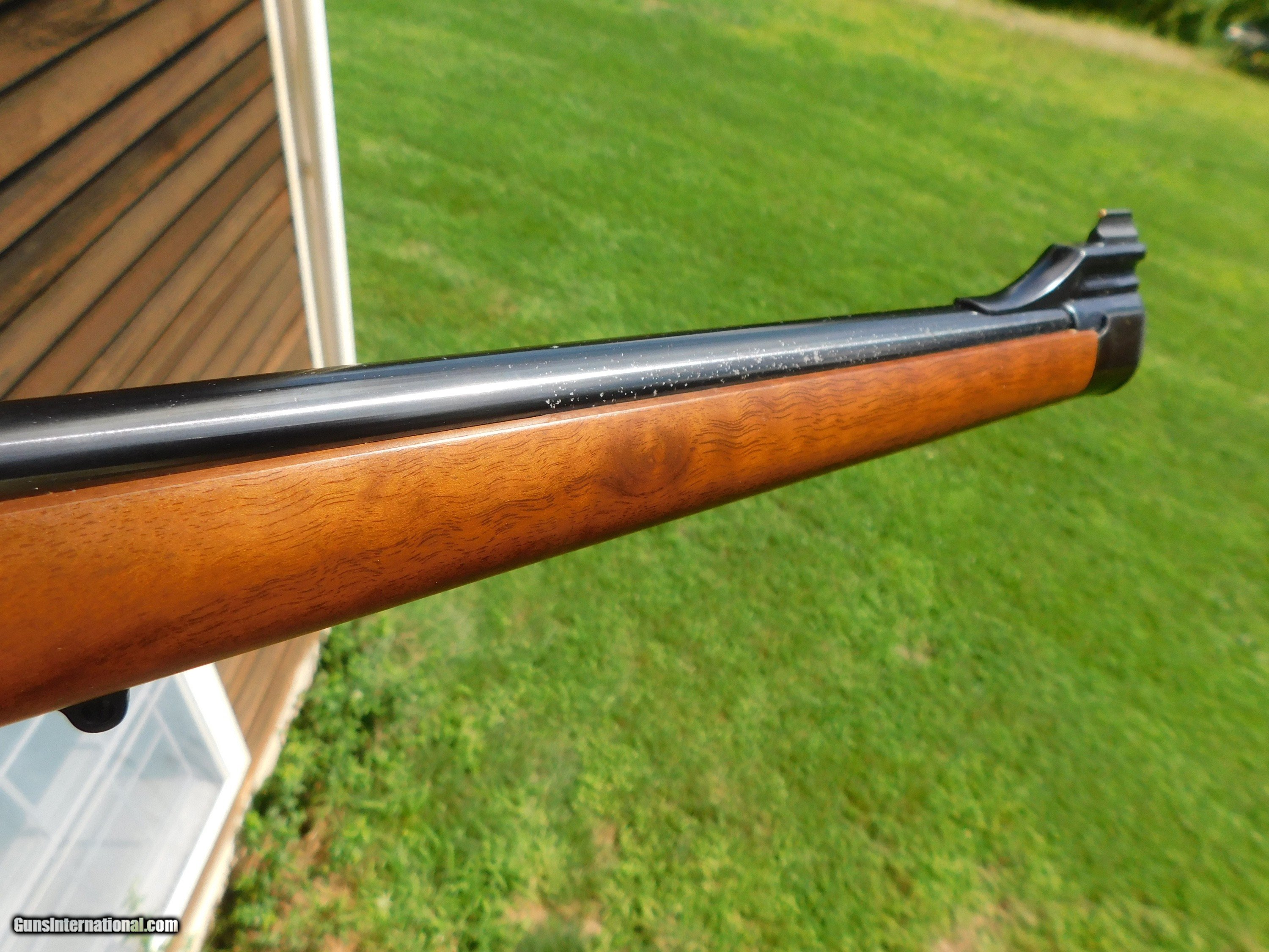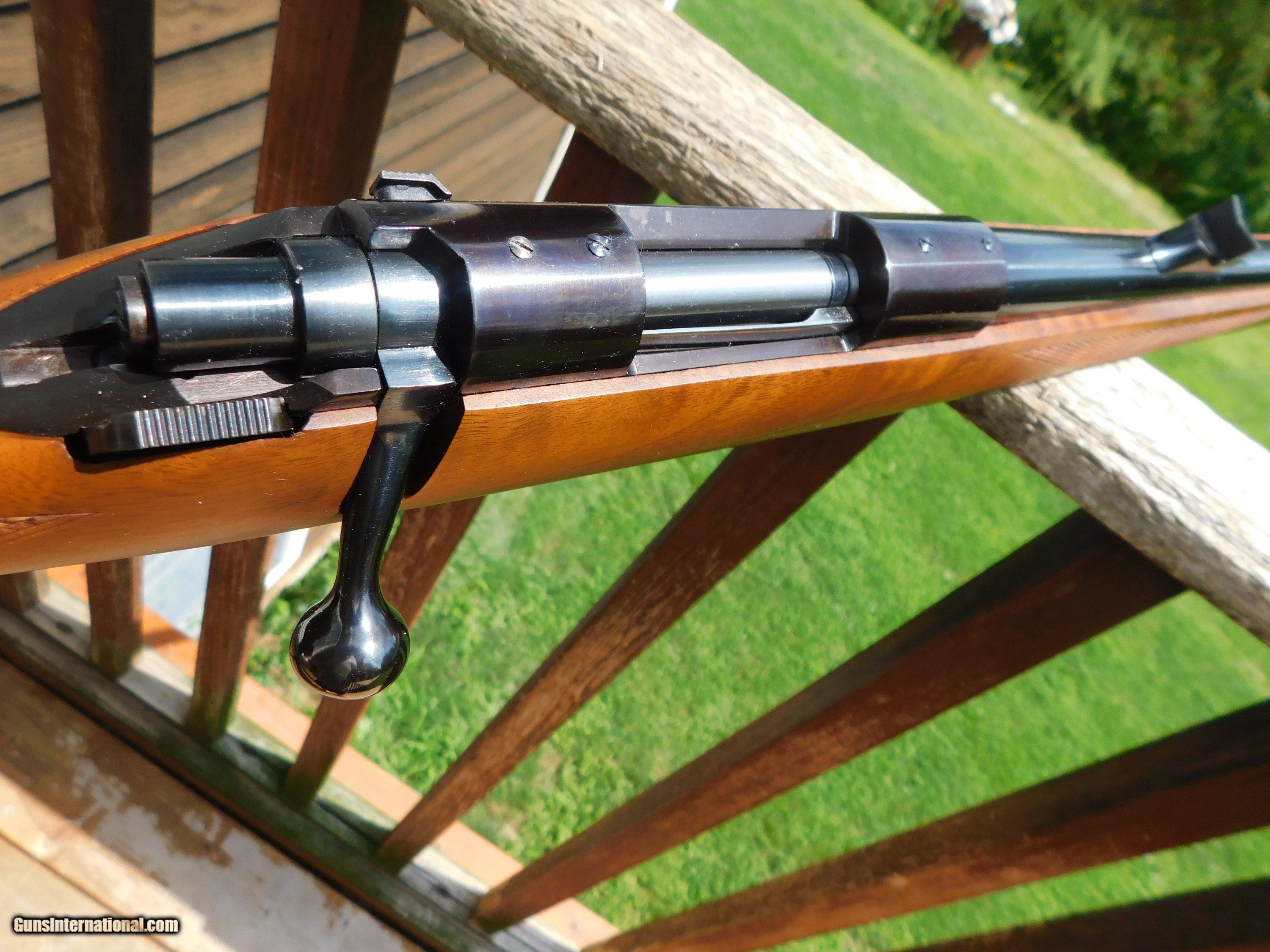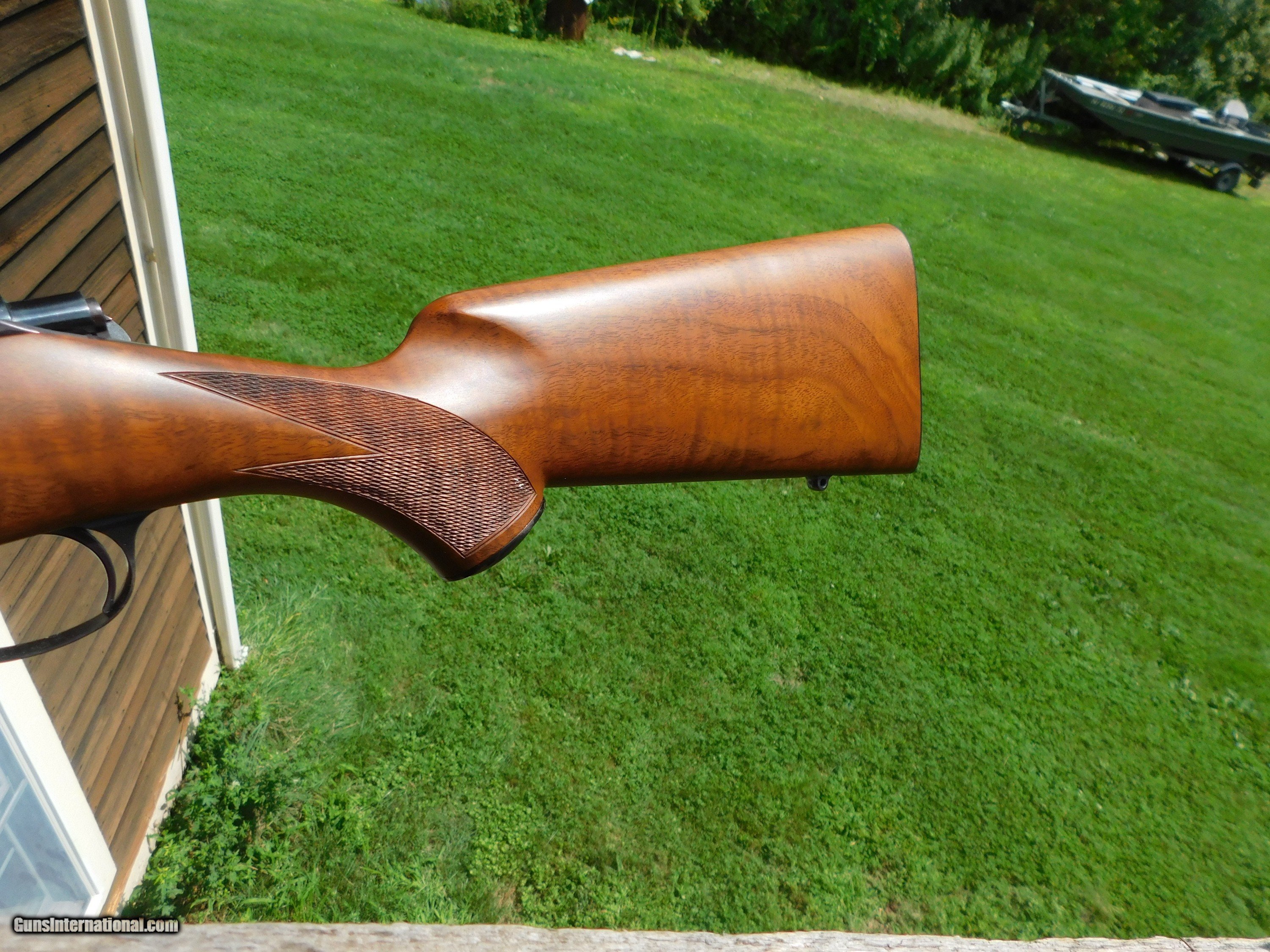 Description: This stunning little (38" overall 6 1/2lbs) 222 Mannlicher Stocked Carbine appears to have never been used. Something has caused some loss of blue on the barrel in the form of numerous very very small flecks where the blue has come off but the conditon otherwise both of metal as well as the handsome classic mannlicher stock is unmarked save for the distintice tiger striping on the forend and handsom figure on the butt stock Steel PG Cap and Neidner type checkered steel butt plate helpf to distinquish this fine firearm from others. We have priced it low enough to more than cover the cost to reblue should you wish to do this but it is not necessary as these marks are miniscule and as it sits it is still a beauty and a keeper. Its only the 2d one like it we've ever had; the last one sold for 3k or more. We also have 2 Kimber of Oregon Model 82 22's in approx new conditon Shipping is $ 65.00 insured. IF IT DOES NOT SAY ."SALE PENDING, UNDER DEPOSIT or ON HOLD"...IT IS AVAILABLE. WE DO NOT REPLY TO INQUIRIES THAT SAY "INTERESTED IN THIS GUN" OR "IS IT AVAILABLE" IF YOU WOULD LIKE TO BUY THIS OR ANY OF OUR GUNS WE SUGGEST YOU PHONE US; WE ARE OFTEN AVAIALABLE LONG HOURS. IF YOU ARE INTERSTED IN A GUN THAT IS UNDER DEPOSIT AND WOULD LIKE TO BE NOTIFIED IF A SIMILAR GUN COMES IN DROP US A LINE AND WE WILL MAKE EFFORTS TO CONTACT YOU WHEN ONE DOES COME IN. WE HAVE OVER 2000 SALES ON ALL SITES WITH AN A+ RATING ON ALL WE ALSO KEEP AN INVENTORY OF OLDER PERIOD CORRECT SCOPES; CALL WITH NEEDS WE MOSTLY PICK VERY CLEAN AND LIGHLTY USED GUNS. WE ARE HAPPY TO TAKE CONSIGNMENT GUNS AND COLLECTIONS OR WILL BUY YOURS OUTRIGHT. WE SOMETIMES ARE EMPLOYED FOR ESTATE PURPOSES AND VALUATIONS. AT THIS TIME WE ARE ONLY ACCEPTING US POSTAL MONEY ORDERS OR BANK CHECKS FOR PAYMENT IT IS THE BUYERS RESPONSIBILITY TO GET US A COPY OF YOUR RECEIVING FFL'S LIC AND A COPY OF YOUR PHOTO ID BEFORE THE GUN SHIPS YOU MUST CALL OR CONTACT YOUR FFL.WE DO NOT CALL FOR YOU UNLESS THEY RQUIRE IT. LAYAWAY PURCHASES NOT COMPLETED ON ANY RETURNED ITEM UNLESS NOT AS DESCRIBED OR DAMAGED ARE SUBJECT TO A 10% RELISTING/RESTOCKING FEE AND MUST BE RETURNED WITH NO NEW MARKS OR SCRATCHES, SENT BACK INSURED, PRIORITY SIGNATURE REQUIRED. ALL INFORMATION CONTAINED HEREIN IS BELIEVED TO BE ACCURATE BUT IS NOT GUARANTEED. WITH ANY OLDER OR USED GUN IT SHOULD BE INSPECTED BY A GUNSMITH PRIOR TO SHOOTING. SOLD |
