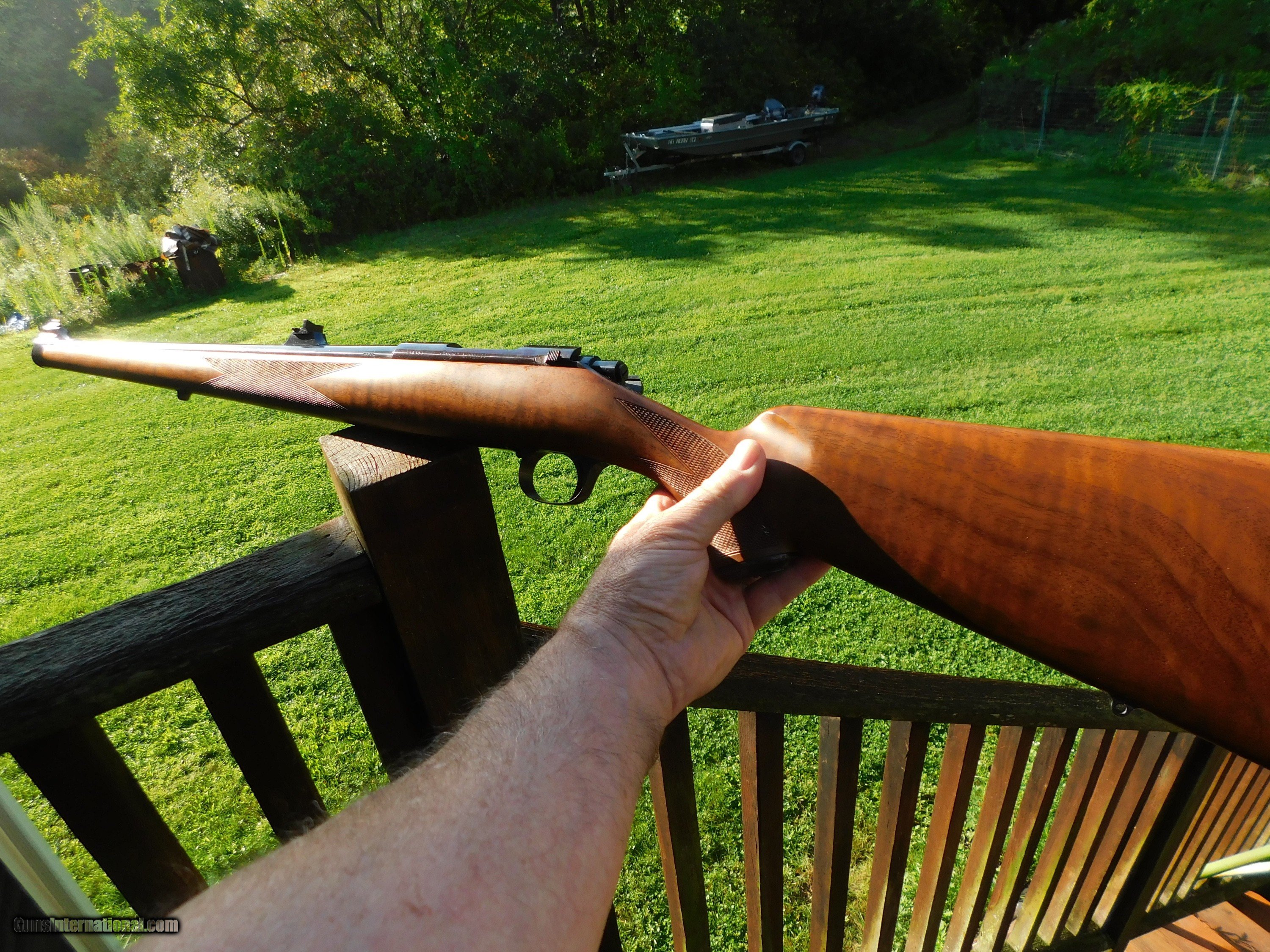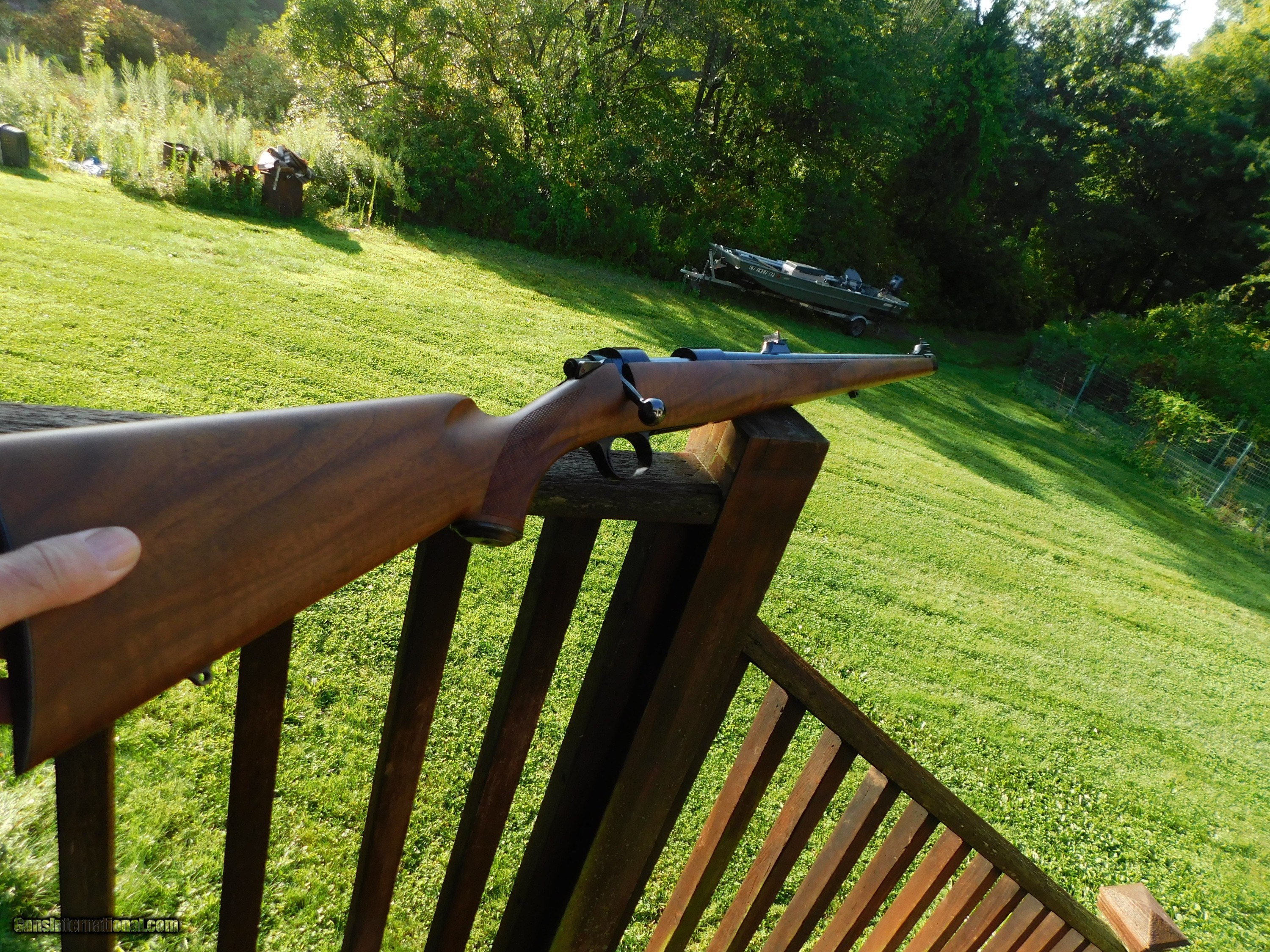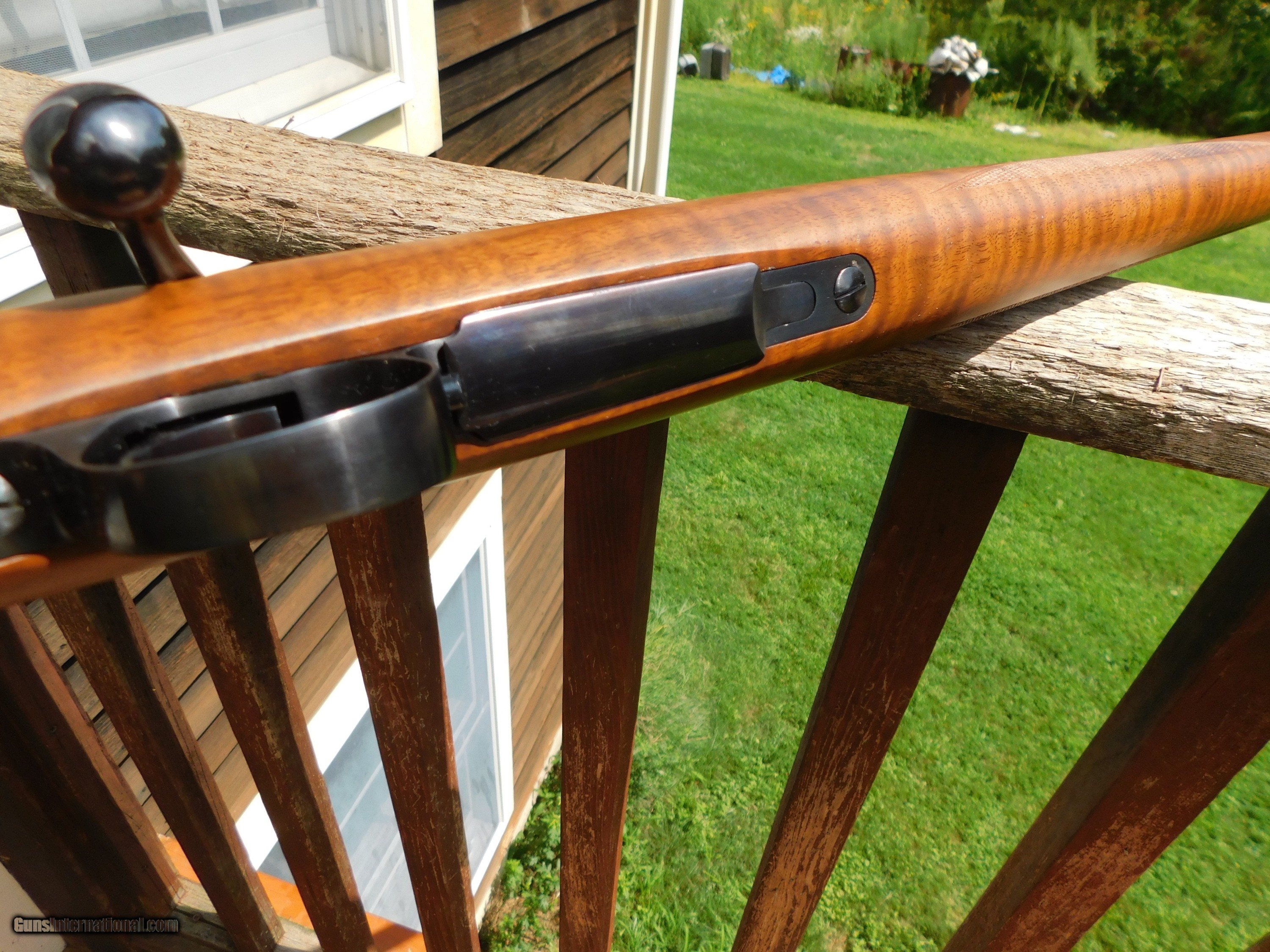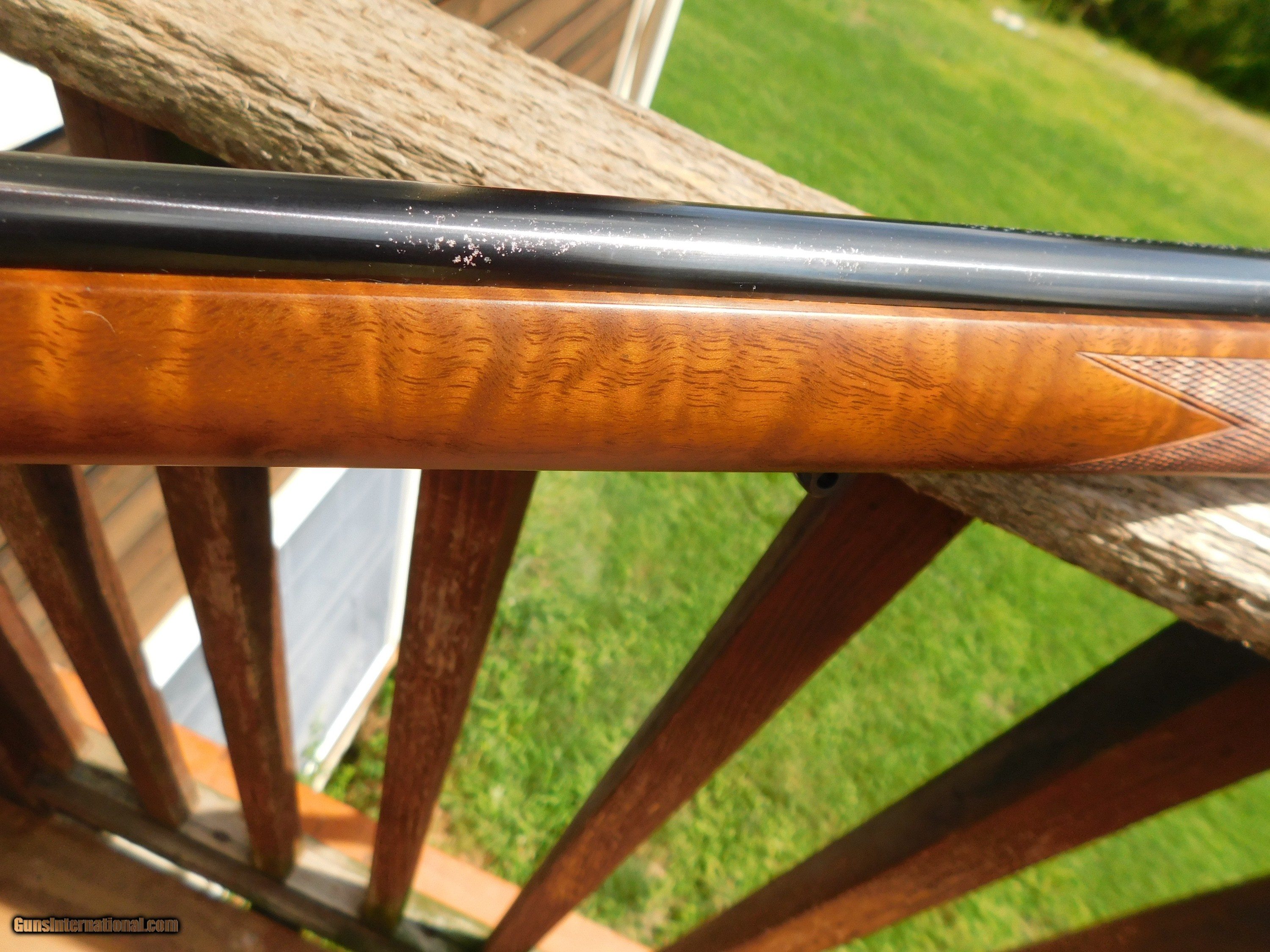 Description: This stunning little (38" overall 6 1/2lbs) 222 Mannlicher Stocked Carbine appears to have never been used. Something has caused some loss of blue on the barrel in the form of numerous very very small flecks where the blue has come off but the conditon otherwise both of metal as well as the handsome classic mannlicher stock is unmarked save for the distintice tiger striping on the forend and handsom figure on the butt stock Steel PG Cap and Neidner type checkered steel butt plate helpf to distinquish this fine firearm from others. We have priced it low enough to more than cover the cost to reblue should you wish to do this but it is not necessary as these marks are miniscule and as it sits it is still a beauty and a keeper. Its only the 2d one like it we've ever had; the last one sold for 3k or more. We also have 2 Kimber of Oregon Model 82 22's in approx new conditon Shipping is $ 65.00 insured. IF IT DOES NOT SAY ."SALE PENDING, UNDER DEPOSIT or ON HOLD"...IT IS AVAILABLE. WE DO NOT REPLY TO INQUIRIES THAT SAY "INTERESTED IN THIS GUN" OR "IS IT AVAILABLE" IF YOU WOULD LIKE TO BUY THIS OR ANY OF OUR GUNS WE SUGGEST YOU PHONE US; WE ARE OFTEN AVAIALABLE LONG HOURS. IF YOU ARE INTERSTED IN A GUN THAT IS UNDER DEPOSIT AND WOULD LIKE TO BE NOTIFIED IF A SIMILAR GUN COMES IN DROP US A LINE AND WE WILL MAKE EFFORTS TO CONTACT YOU WHEN ONE DOES COME IN. WE HAVE OVER 2000 SALES ON ALL SITES WITH AN A+ RATING ON ALL WE ALSO KEEP AN INVENTORY OF OLDER PERIOD CORRECT SCOPES; CALL WITH NEEDS WE MOSTLY PICK VERY CLEAN AND LIGHLTY USED GUNS. WE ARE HAPPY TO TAKE CONSIGNMENT GUNS AND COLLECTIONS OR WILL BUY YOURS OUTRIGHT. WE SOMETIMES ARE EMPLOYED FOR ESTATE PURPOSES AND VALUATIONS. AT THIS TIME WE ARE ONLY ACCEPTING US POSTAL MONEY ORDERS OR BANK CHECKS FOR PAYMENT IT IS THE BUYERS RESPONSIBILITY TO GET US A COPY OF YOUR RECEIVING FFL'S LIC AND A COPY OF YOUR PHOTO ID BEFORE THE GUN SHIPS YOU MUST CALL OR CONTACT YOUR FFL.WE DO NOT CALL FOR YOU UNLESS THEY RQUIRE IT. LAYAWAY PURCHASES NOT COMPLETED ON ANY RETURNED ITEM UNLESS NOT AS DESCRIBED OR DAMAGED ARE SUBJECT TO A 10% RELISTING/RESTOCKING FEE AND MUST BE RETURNED WITH NO NEW MARKS OR SCRATCHES, SENT BACK INSURED, PRIORITY SIGNATURE REQUIRED. ALL INFORMATION CONTAINED HEREIN IS BELIEVED TO BE ACCURATE BUT IS NOT GUARANTEED. WITH ANY OLDER OR USED GUN IT SHOULD BE INSPECTED BY A GUNSMITH PRIOR TO SHOOTING. SOLD |