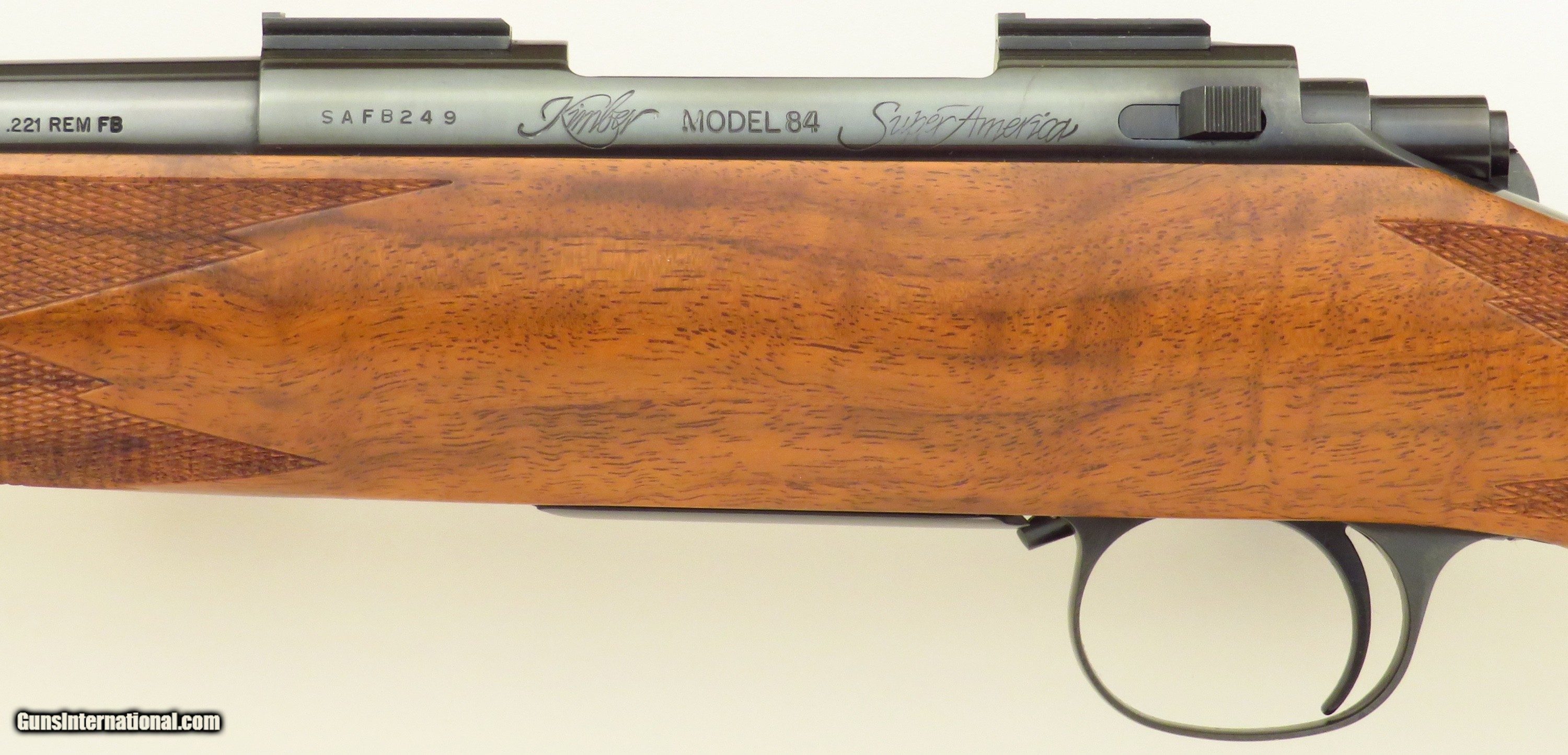 Kimber of Oregon Model 84 SuperAmerica .221 Fireball, skeleton grip cap, AAA claro, ebony, 24 LPI, inletted, 98 percent, layaway