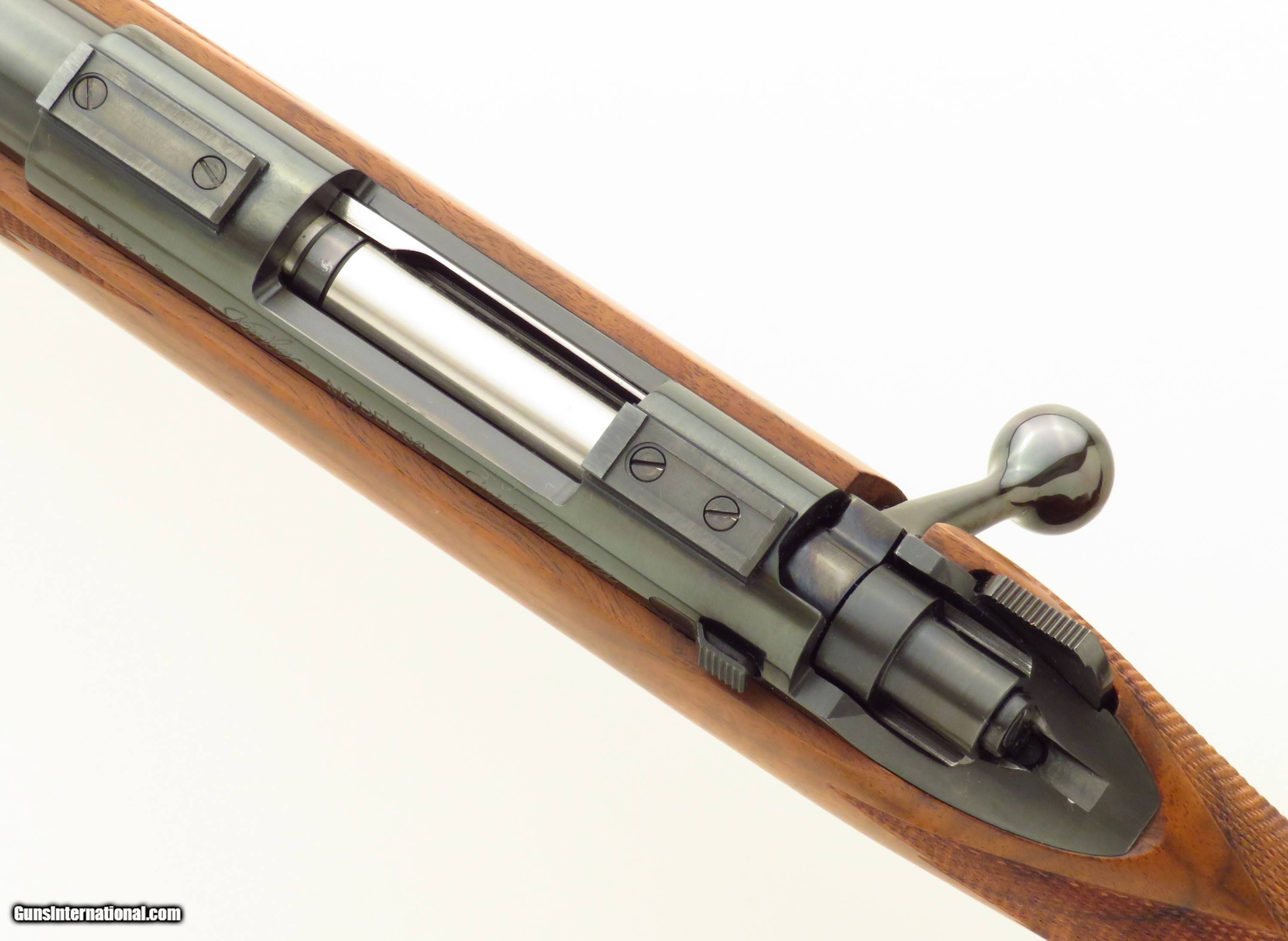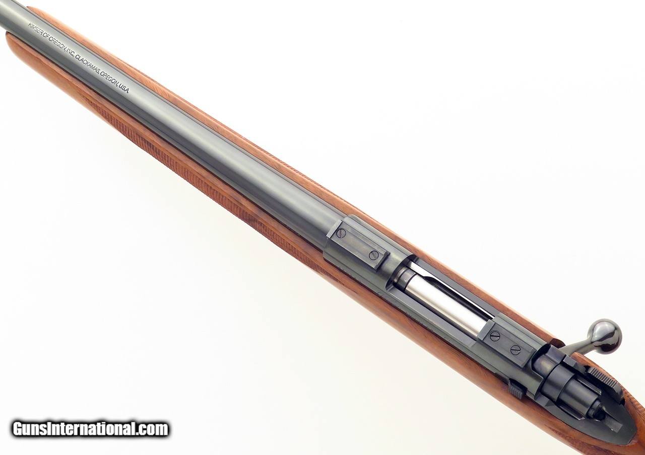 Description: Kimber of Oregon Model 84 SuperAmerica .221 Remington Fireball. Serial SAFB249 has a 22-inch plain barrel, disc safety and Kimber bases. WOOD: Stocked in AAA-grade claro walnut, formalities include 24 lines-per-inch wrap checkering, scalloped cheek rest with shadow line, checkered steel butt plate with widow's peak, skeleton grip cap and inletted sling swivel studs. DIMENSIONS: Weight is 6.6 pounds and the length-of-pull is 13.5 inches. CONDITION: The bore is strong and bright. Metal and wood finishes are each approximately 98 percent. No box or papers. $3,250 plus shipping. SOLD Rifle Caliber: .221 Remington Fireball |