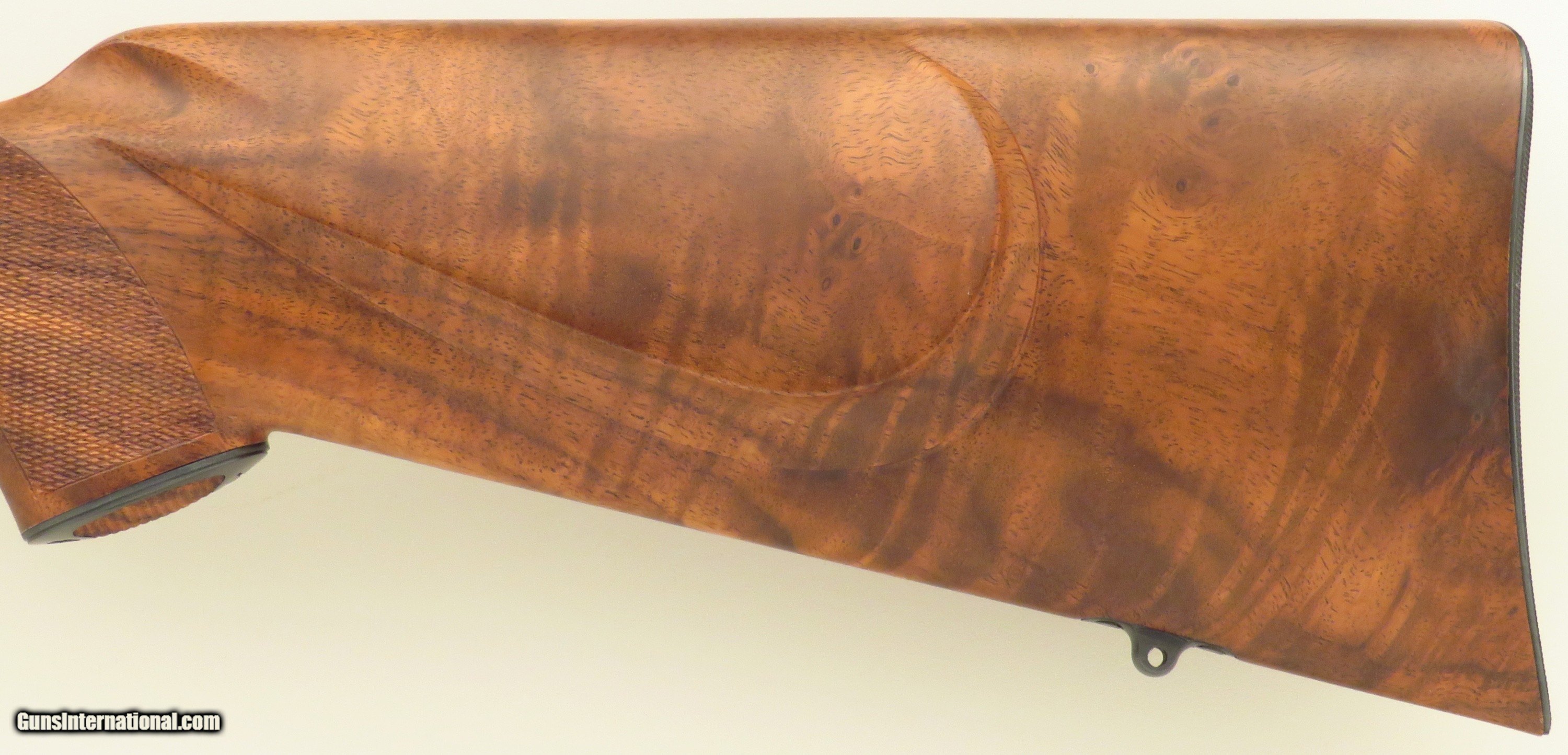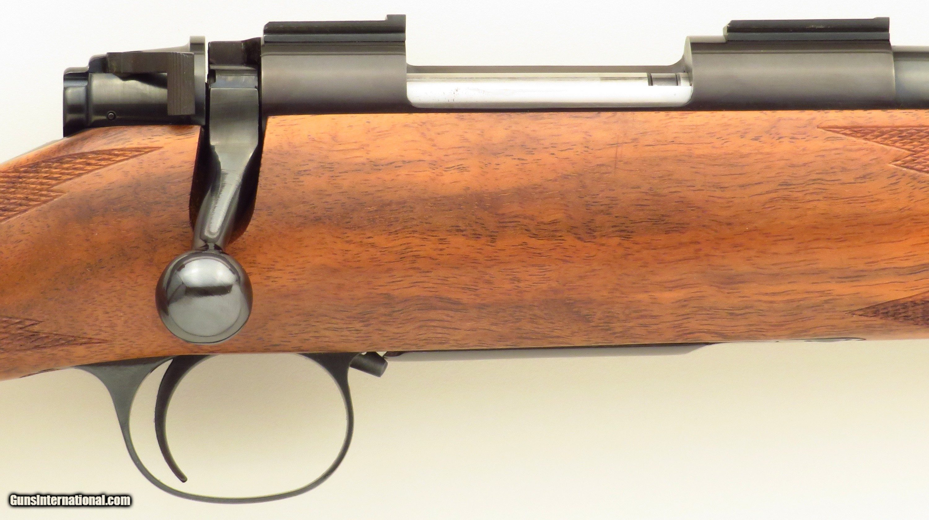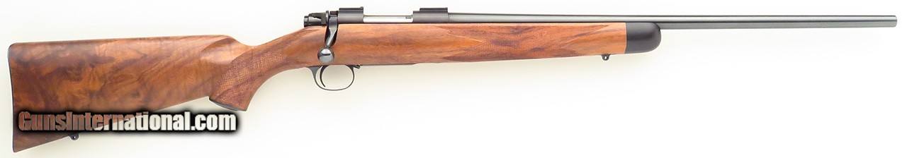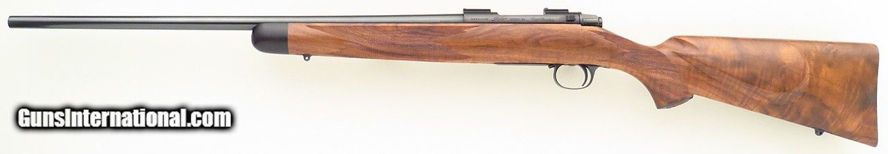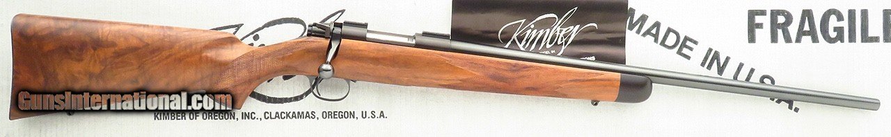 Description: Kimber of Oregon Model 84 SuperAmerica .222 Remington. Serial SATD123B has a 22-inch barrel, polished blue finish, round receiver with attached Kimber bases, full-length claw extractor and a three-position safety. STOCK: The AAA-grade claro walnut stock is appointed with a satin finish, ebony forend tip, 24 lines-per-inch wrap checkering, scalloped cheek rest with shadow line, checkered steel butt plate with widow's peak, skeleton grip cap and inletted sling swivel studs. DIMENSIONS: Weight (with bases) is 6.2 pounds and the length-of-pull is 13.7 inches. CONDITION: The bore is pristine. Metal and wood finishes are each approximately 98 percent with trace indications of handling. INCLUSIONS: The original box along and instructions are present. The price is firm and layaway is available. $3,250 plus shipping. SOLD Rifle Caliber: .222 Remington |