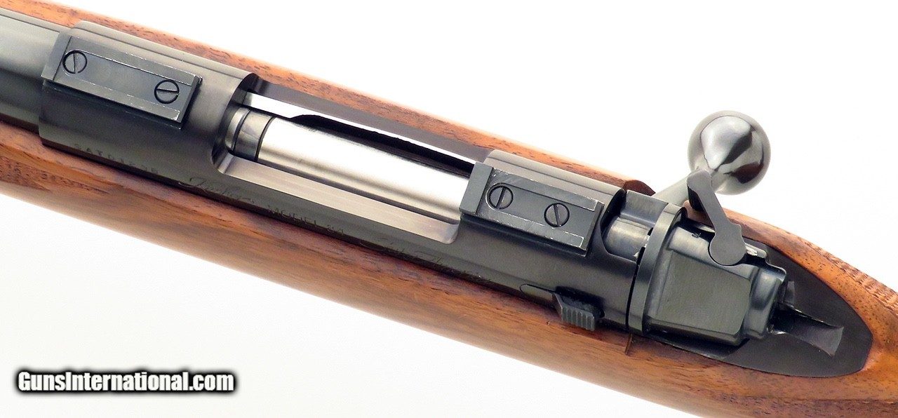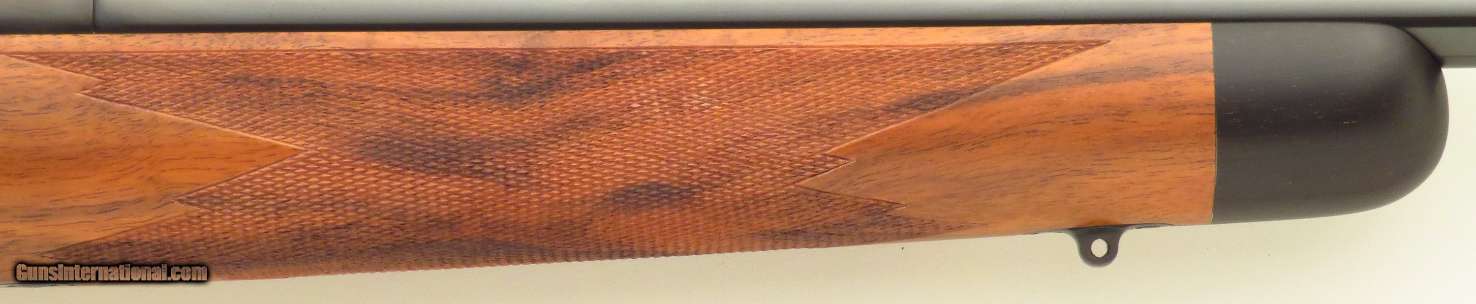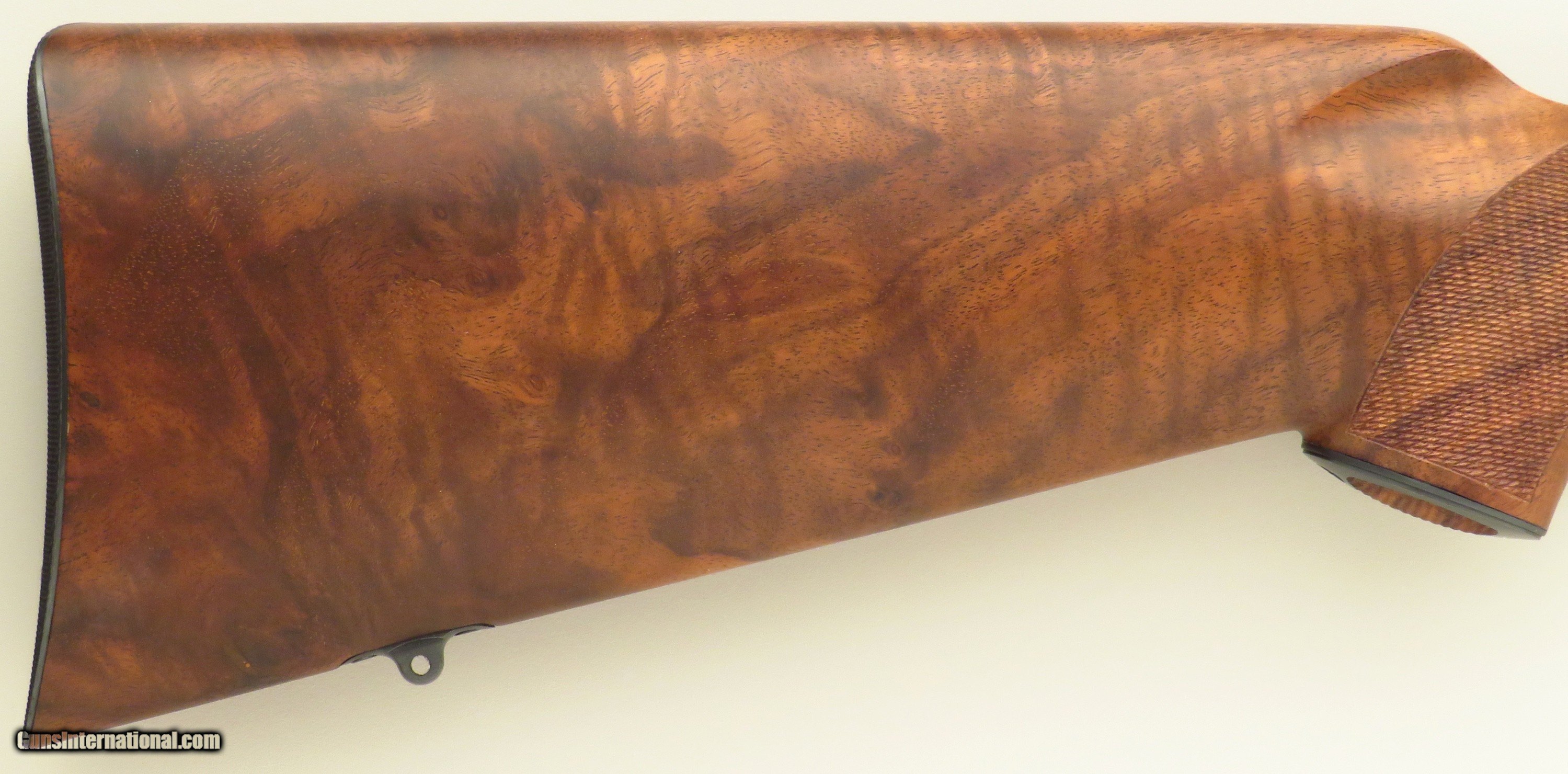 Description: Kimber of Oregon Model 84 SuperAmerica .222 Remington. Serial SATD123B has a 22-inch barrel, polished blue finish, round receiver with attached Kimber bases, full-length claw extractor and a three-position safety. STOCK: The AAA-grade claro walnut stock is appointed with a satin finish, ebony forend tip, 24 lines-per-inch wrap checkering, scalloped cheek rest with shadow line, checkered steel butt plate with widow's peak, skeleton grip cap and inletted sling swivel studs. DIMENSIONS: Weight (with bases) is 6.2 pounds and the length-of-pull is 13.7 inches. CONDITION: The bore is pristine. Metal and wood finishes are each approximately 98 percent with trace indications of handling. INCLUSIONS: The original box along and instructions are present. The price is firm and layaway is available. $3,250 plus shipping. SOLD Rifle Caliber: .222 Remington |