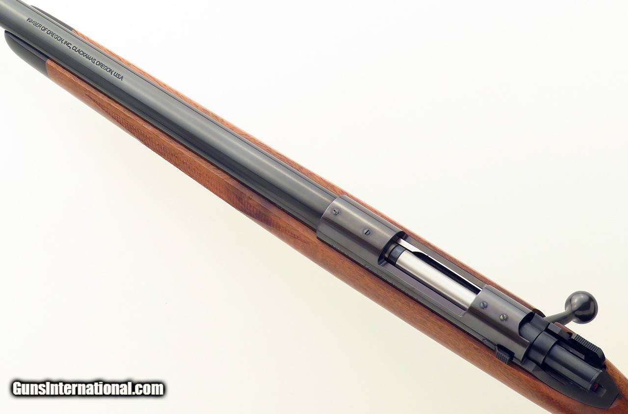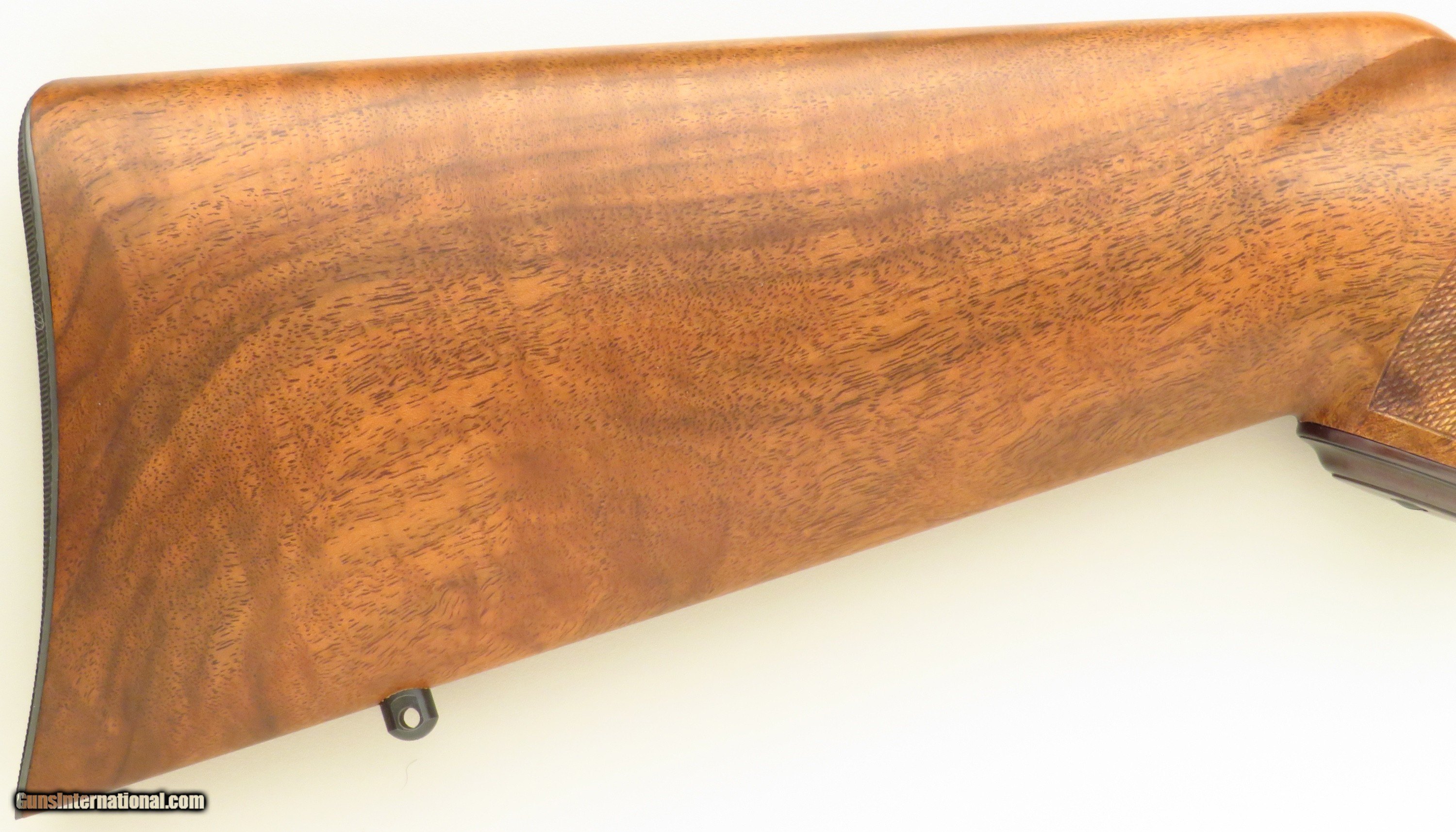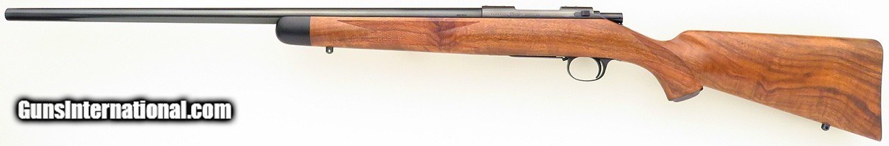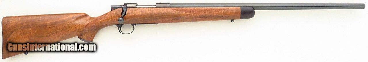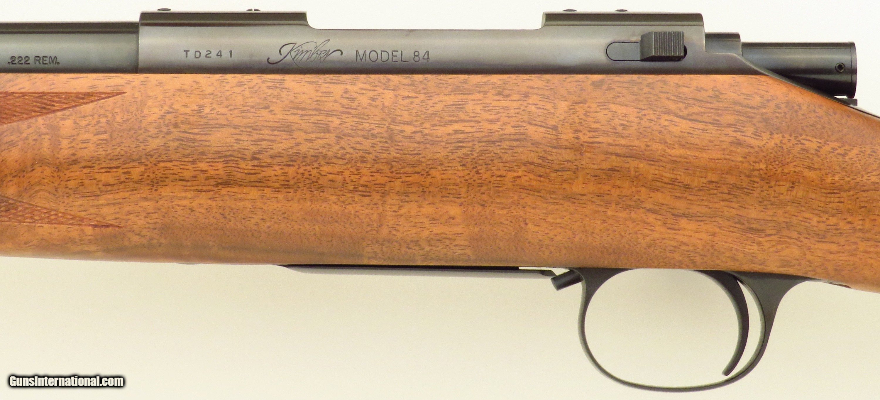 Description: Kimber of Oregon Model 84 Varmint .222 Remington. Serial TD241 has a 24-inch tapering heavy sporter barrel (.645-inch muzzle diameter), round receiver and disc safety. WOOD: The AA-grade claro walnut stock features an ebony forend tip, panel checkering, checkered steel butt plate with widow's peak, steel grip cap and sling swivel studs. The original box with correct end label, manual and warranty card is included. DIMENSIONS: Weight is 6.8 pounds and the length-of-pull is 13.65 inches. CONDITION: The bore is superb, strong and bright. Metal finish is approximately 98 percent with trace spot thinning on the receiver. Wood is approximately 99 percent. The price is firm and layaway is available. $2,500 plus shipping. SOLD Rifle Caliber: .222 Remington |