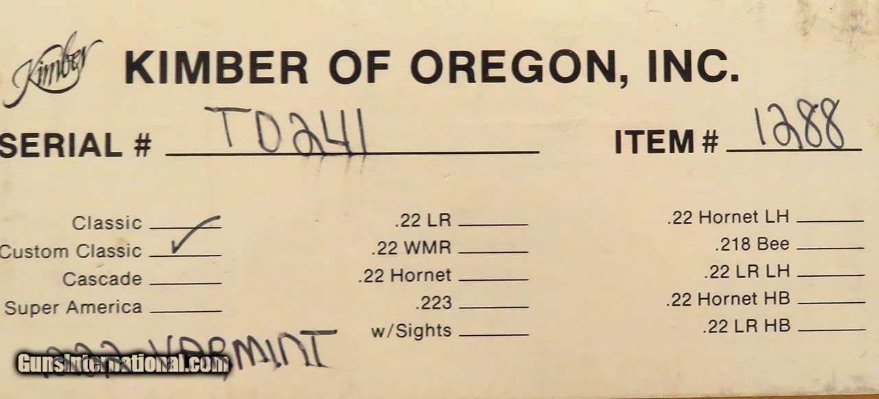 Kimber of Oregon Model 84 Varmint .222 Remington, AA claro, ebony, box, 98 percent, layaway