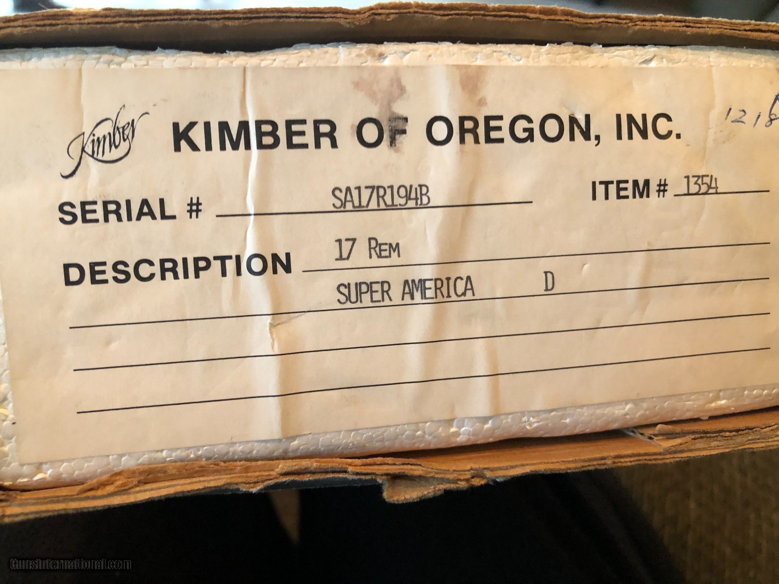Description: Kimber of Oregon Super America in 17 Remington. New in original box. Rare swing safety.(Model 70 style) Great wood and a Real Beauty and Rare rifle. Two Panel bolt. This is a repegsater and has hinged floor plate Rifle is unfired with no dings or scratches.PERFECT! 3495.00 plus shipping SALE PENDING SOLD Rifle Caliber: .17 Remington |