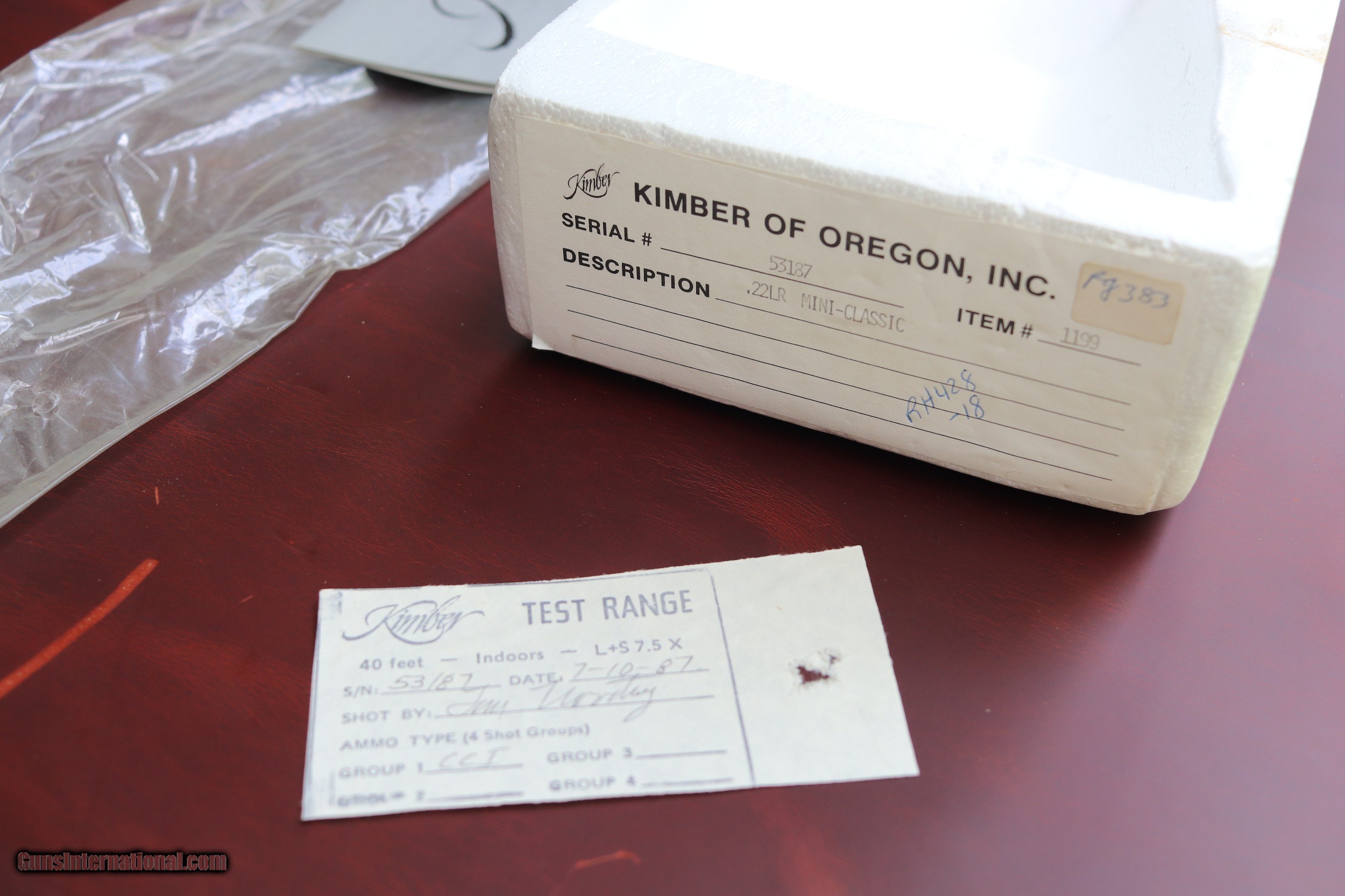 100% NIB KIMBER OF OREGON MODEL 82 MINI CLASSIC HAS BOX, END LABEL, TEST TARGET AND RETAINS 100%