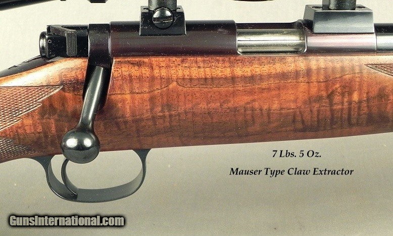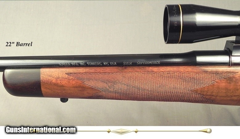 Description: #KA08779, Kimber 22 Long Rifle, Kimber Mfg. Inc., Yonkers, N.Y. USA: A Super America Model K-22 Kimber 22 L R Bolt Rifle Made in 2003, It remains unfired and in the box with paperwork, 22" barrel without open sights, Controlled round feed Mauser type claw extractor, Leupold VX-1 2 - 7 x 33, A neat Model 70 type 3 position wing safety (Not many 22's have these), Wrap around point pattern checkering, Steel grip cap, 5 shot clip magazine, Sling eyes on the stock, Cheekpiece, Ebony forend tip, An excellent piece of Claro Walnut with a lot of fiddleback and excellent color & contrast, 13 3/4" LOP over a factory 1/2" pad, 7 lbs. 5 oz. with the scope, The factory blue is 100%, The stock finish is 100%, The checkering is 100%, The bore is new. The factory target produced a 5 shot group of .230" at 50 yards using Remington Match Xtra Plus ammo. SOLD Rifle Caliber: .22 Long Rifle |
