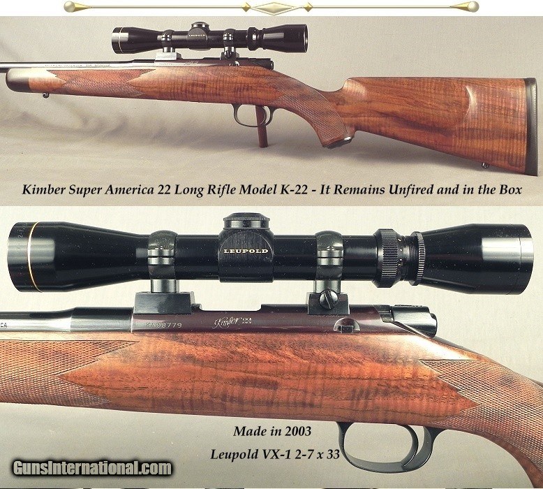 KIMBER 22 L R- SUPER AMERICA MOD- UNFIRED in the BOX- EXC WOOD- LEUPOLD 2 x 7- MADE 2003- FACTORY TARGET & ACCURATE- 13 3/4" LOP- 7 Lbs. 5 Oz.