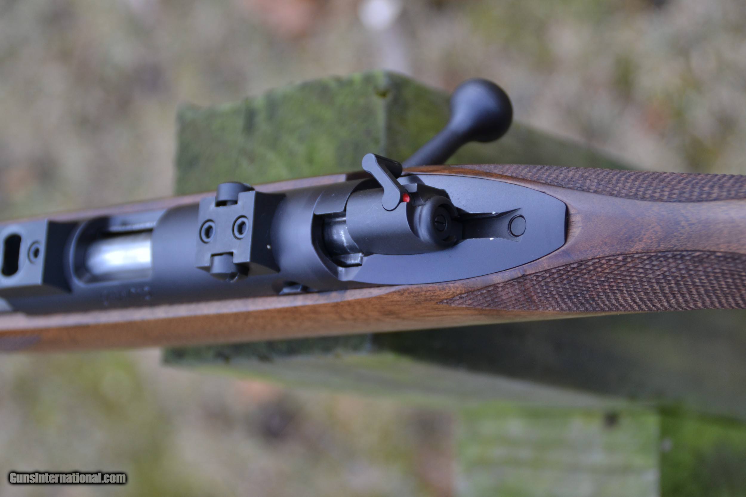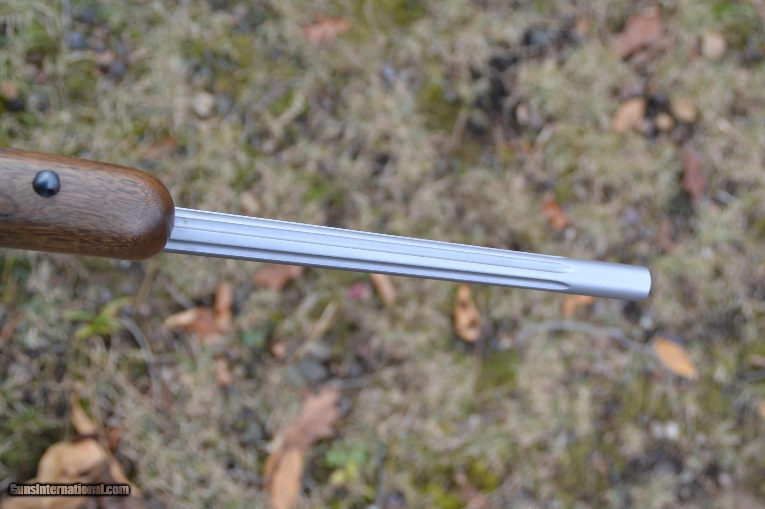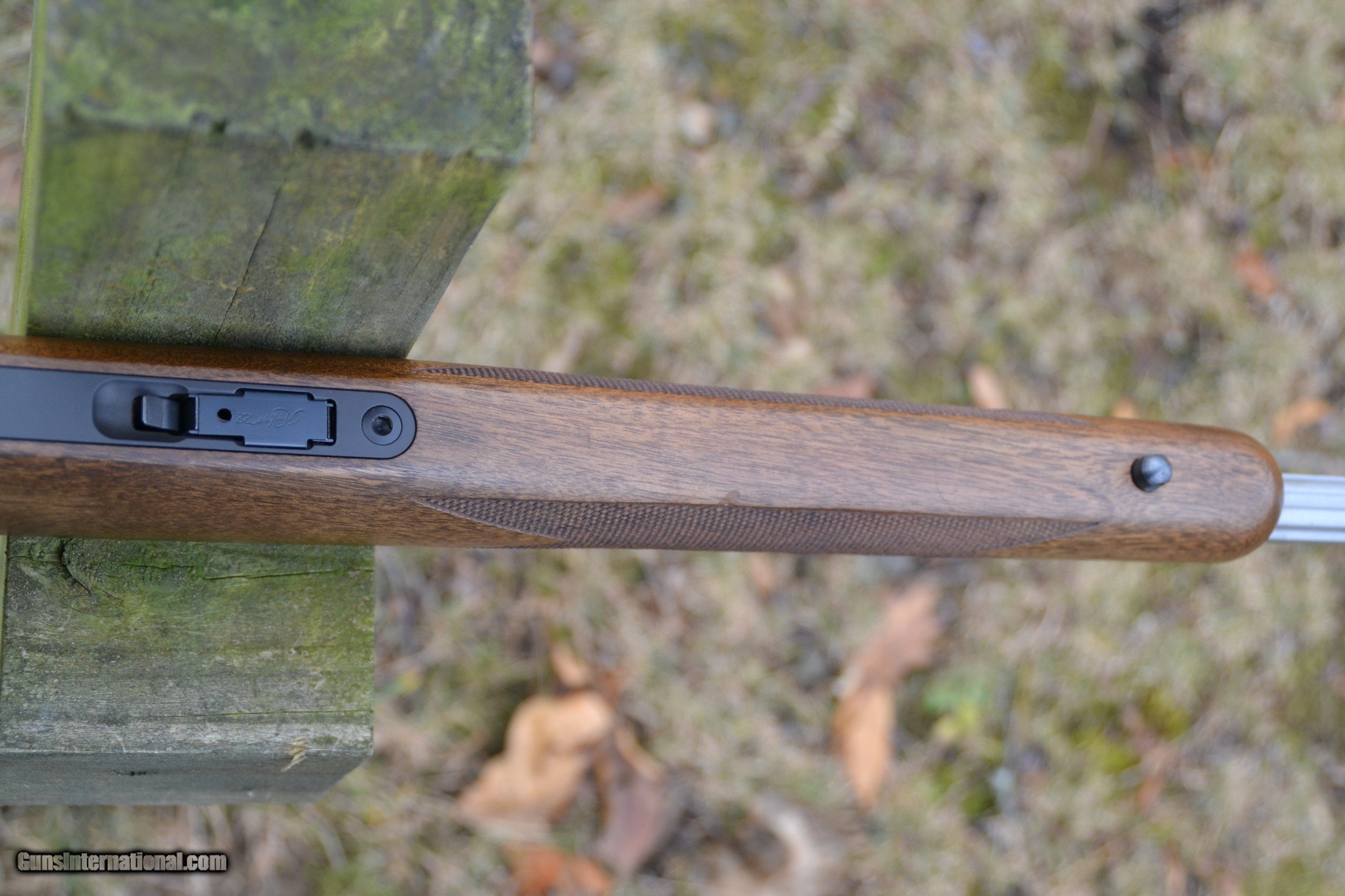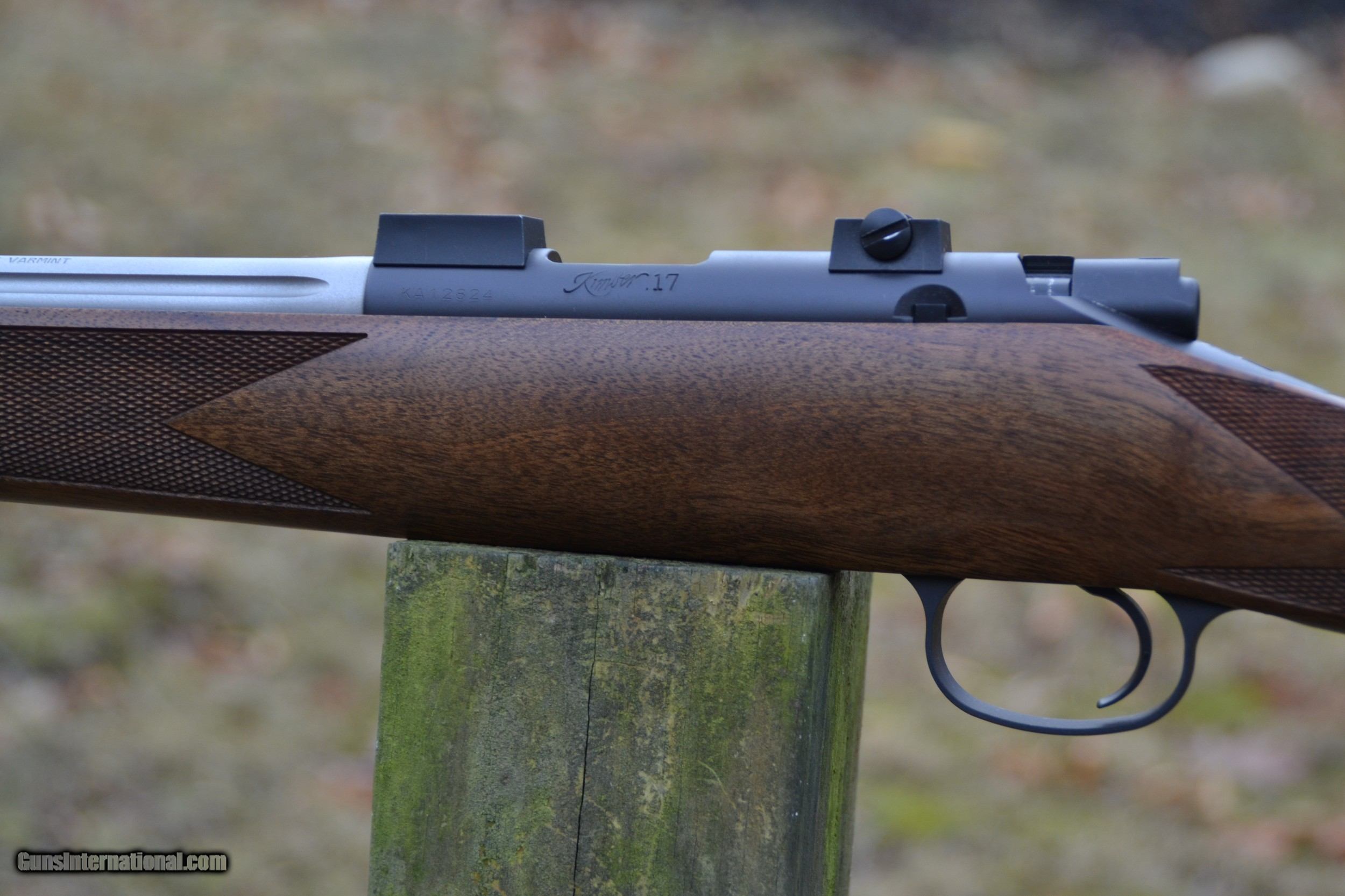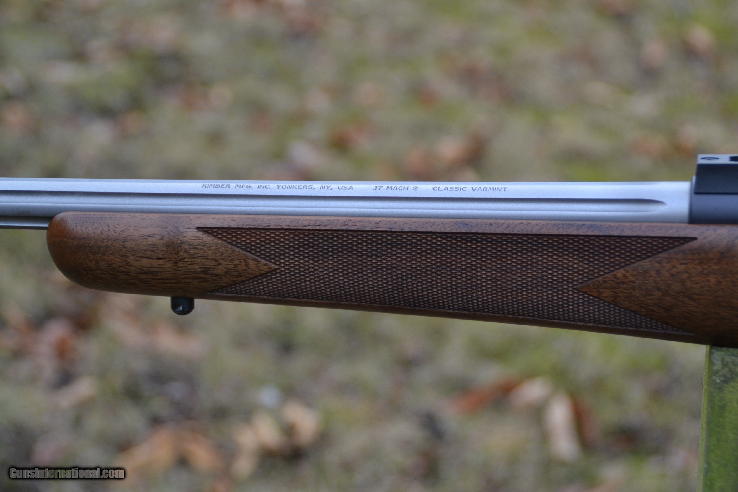 Description: A Kimber Manufacturing, Inc. (Kimber of New York) K-17 Classic Varmint in .17 Mach 2. Probably the best .17 Mach 2 made by any manufacturer and discontinued in 2007. The gun features a three position safety. The metal is a solid 99% and the wood is 98% with two small dings as shown. The rubber butt pad has begun to soften over time as they all do. A great squirrel gun by all accounts and one that is not easy to come across. SOLD |
