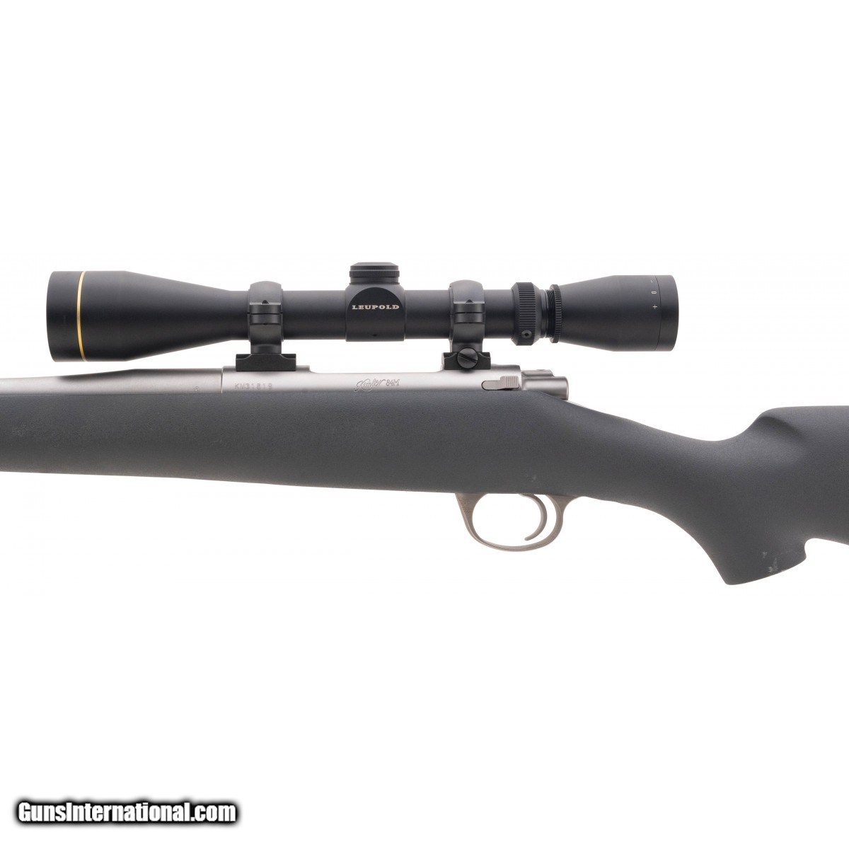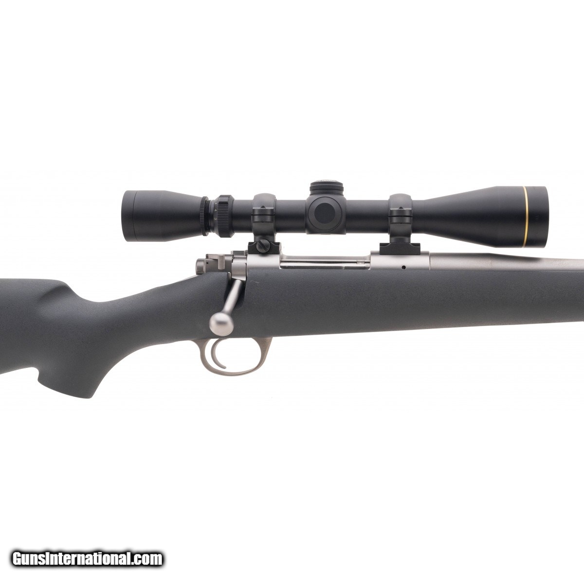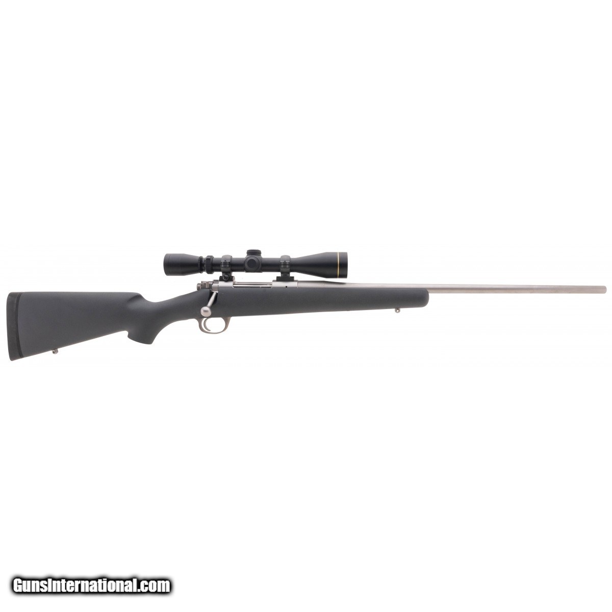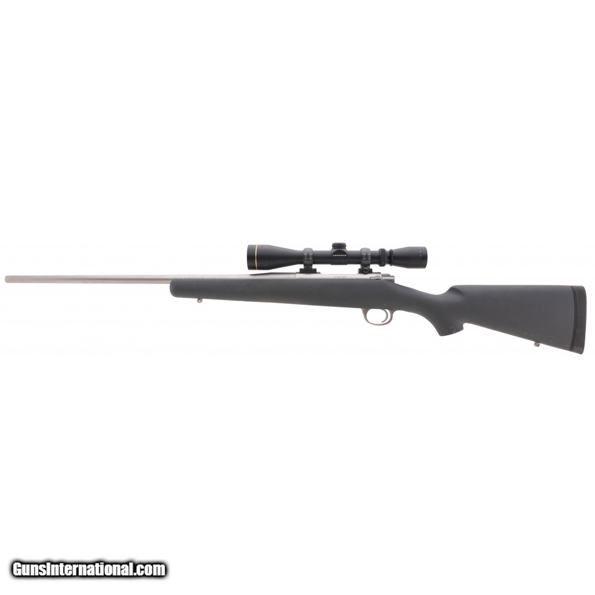 Description: " SN:KM31819. Bolt action lightweight deer rifle with a 21.5"" barrel in a satin stainless finish with a grey synthetic stock. In excellent condition. Includes a NRA 3-9x Leupold scope. SOLD |