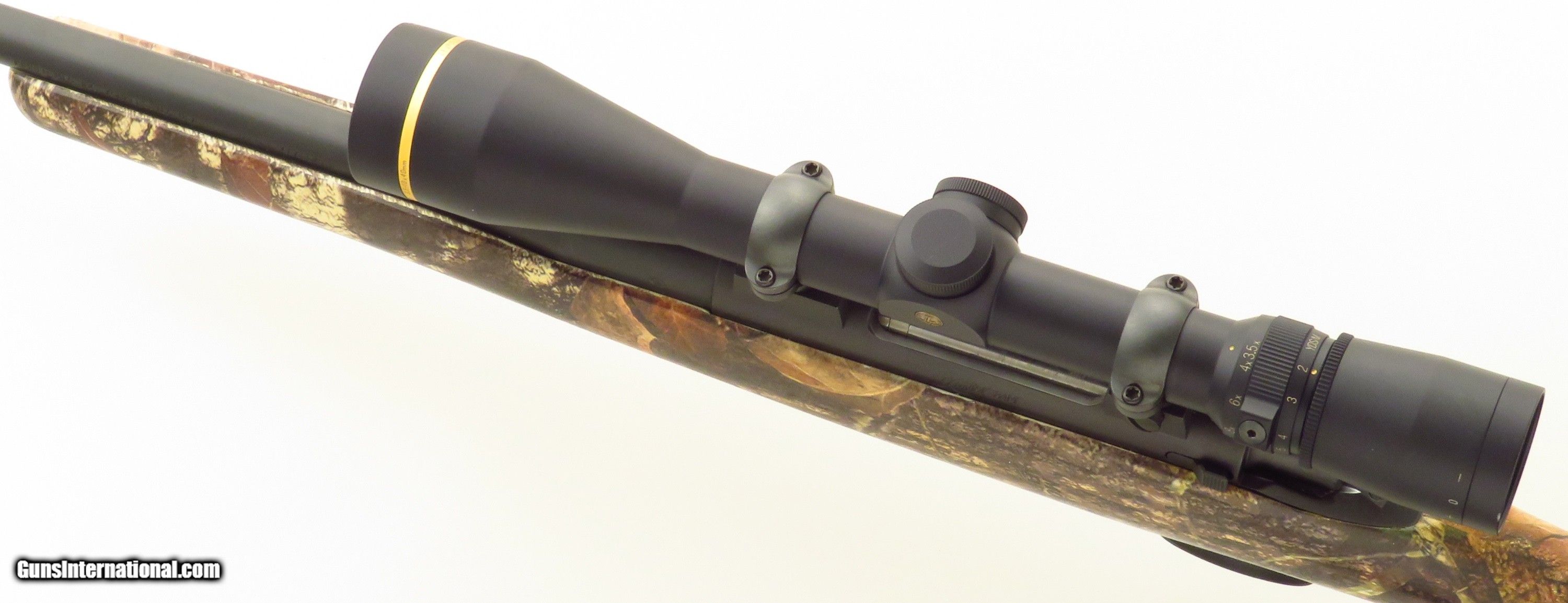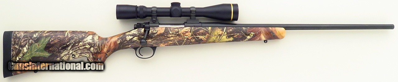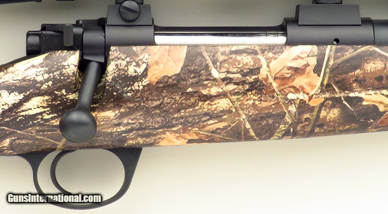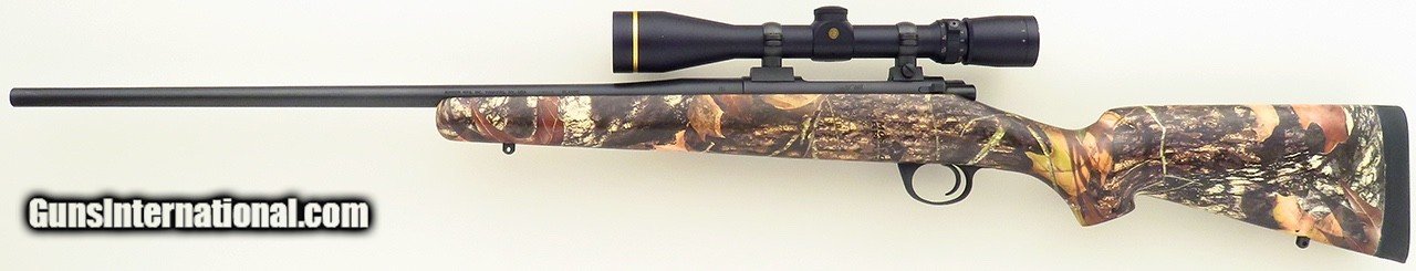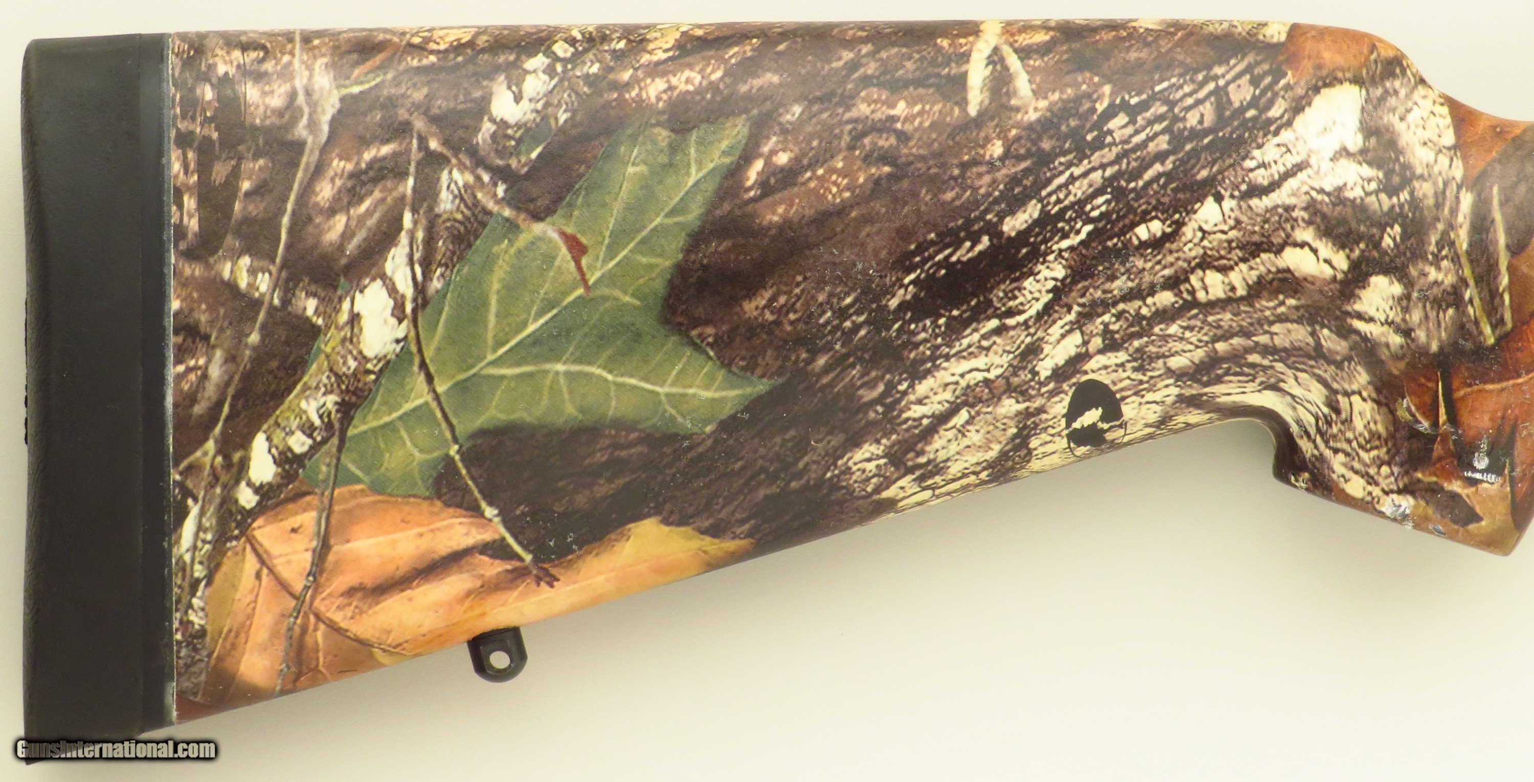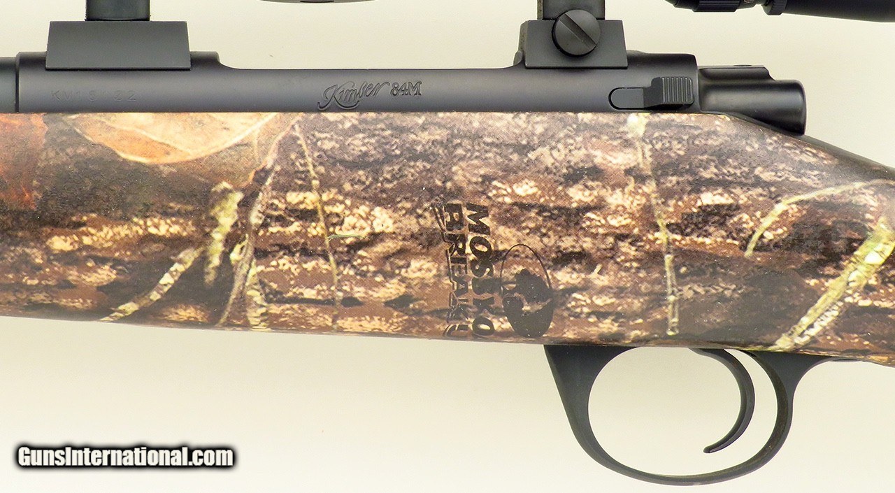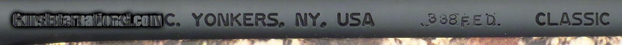 Description: Special Kimber Model 84M Classic .338 Federal. Built by a former Kimber design engineer as his Maine black bear rifle and consigned by his estate, serial KM18102 has a 22-inch pre-production barrel (caliber hand stamped), Montana synthetic stock with experimental dipped camo finish, KimPro II metal finish, three-position safety, tuned trigger and a Leupold VX-III 3.5-10x40 scope (Duplex reticle, .25 MOA clicks, matte, 1-inch) in Leupold rings and Kimber scalloped bases. DIMENSIONS: Weight (with optic) is 6.2 pounds and the length-of-pull is 13.6 inches. CONDITION: The bore is superb. Metal finish is over 95 percent with trace rubs and light freckling over the bolt handle/knob. Stock finish is excellent, with areas of minor roughness. Optic is clear, lens coatings unmolested and the objective bell edge has a slight impression (middle right). The price is firm. $1,500 plus shipping. SOLD Rifle Caliber: .338 Federal |