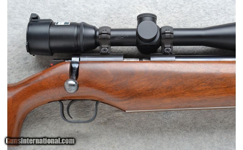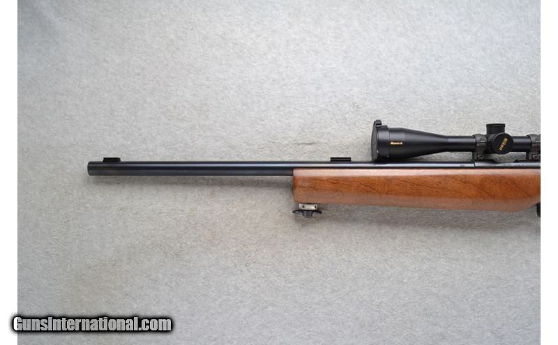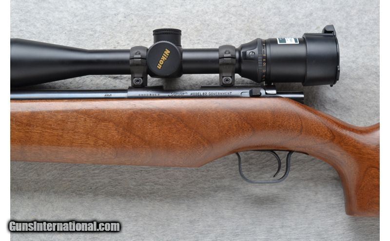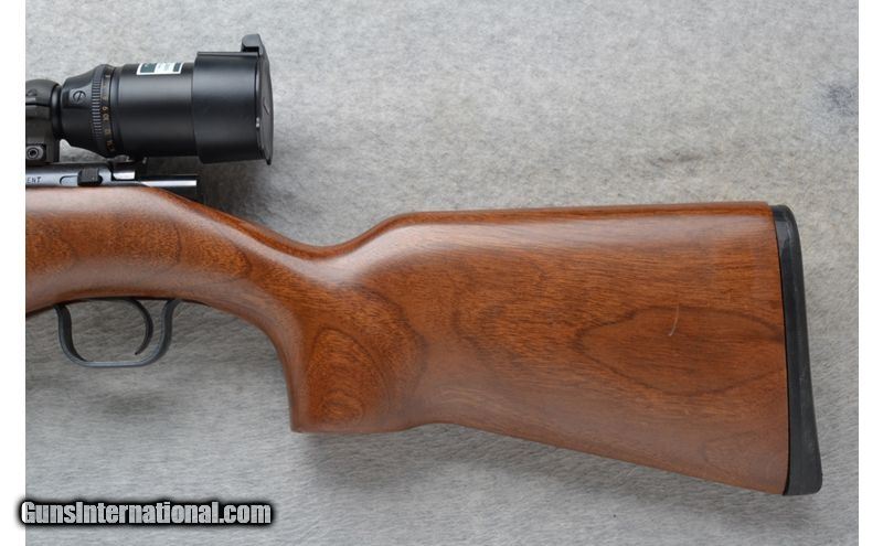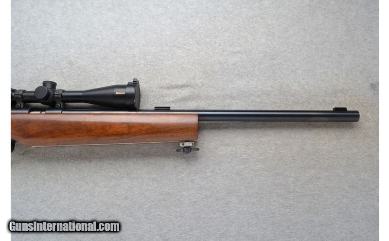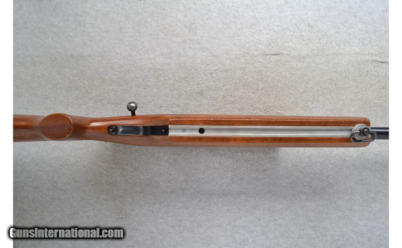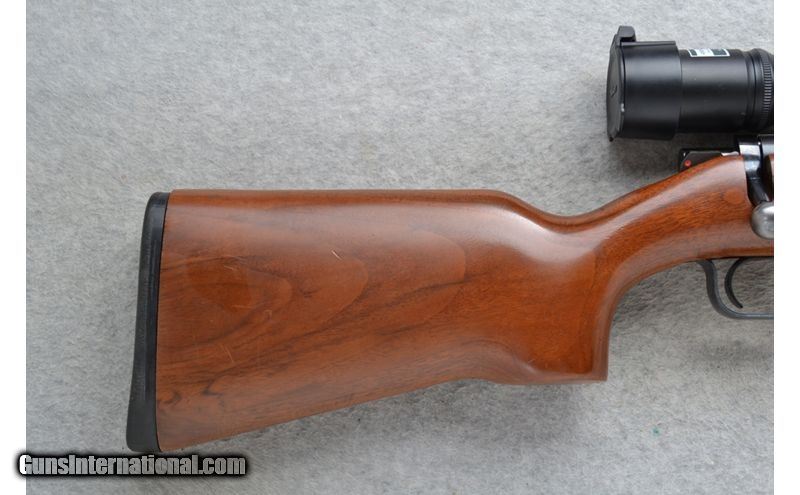 Description: This Kimber Model 82 Government is a single shot right hand bolt action rifle in .22 Long Rifle Cal. It has a 25 inch heavy target barrel. It is outfitted with a Nikon Monarch 4-16x42 Scope. No iron sights are present. Front and middle sight mount bases are installed. The butt stock is a heavy smooth walnut pistol grip. The forearm is a smooth grip heavy walnut with a bottom accessory rail. .22 Long Rifle SOLD Chambers: Bolt Action single shot. Metal Condition: Very good. Some minor handling marks. Wood Condition: Good with many light handling marks. Bore Condition: Excellent. Barrels: 25 inch heavy target barrel. Stock Dimensions: LOP 12 inches. Fore End: Smooth grip walnut with a bottom accessory rail. Butt Pad: Kimber black rubber pad. Weight: 11 lb. 2 oz. Sights: Nikon Monarch 4-16x42 Scope. No iron sights present. Item Location: Richfield, WI |