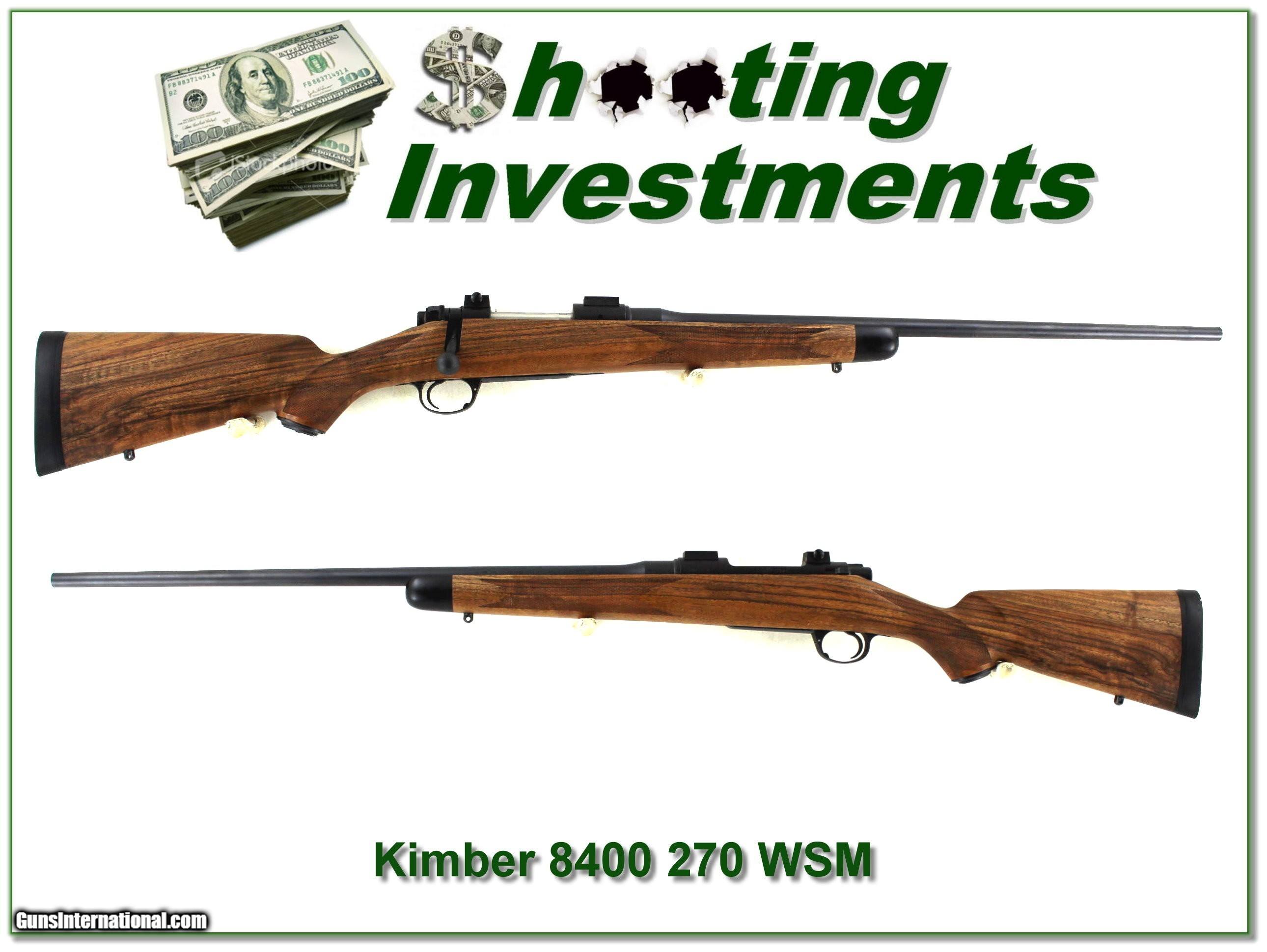 Description: Big game hunters, this is an excellent condition and no longer made Kimber 8400 Select Grade in 270 WSM. It has beautiful walnut and a 24in barrel. It will make a high-end hunting gun and it comes with Kimber bases as seen. I am selling this one on consignment and as such lay-a-way can’t be used. It does of course have the standard 3-day inspection. Shipping and insurance is $49. Please email me with any questions or larger pictures. (Consign your quality firearms with Shooting Investments for only 12%! Let me know if you have any you would like to sell!) 24-0278 Payment: Payment is by Money Order, Cashier’s Check or Personal Check. I can now also accept Credit Cards (MasterCard, Visa, Discover & American Express) with a 3% convenience fee. Shipping: The shipping charge will be listed in each description. It is $49 for most firearms. Some heavy guns or those insured for over $2000 will be higher. Shipments to Alaska and Hawaii are higher because air shipment is required. Most firearms are shipped on Tuesday and Thursday and usually in 5 days of receipt of payment. We package all shipments carefully and insure them. Optics are shipped Priority Mail and most other non-firearm shipments are shipped First Class. Returns: Our return policy is simple. If for any reason you are not pleased with your purchase, you may return your item for a full refund of purchase price. Ammunition cannot be returned. It is important to us that you are happy. Guns cannot be fired or dissembled before returning them and they must be returned in the same condition as received. Notification of a return must occur within 3 days of receipt at your dealer. Shipping, convenience and dealer fees are not refundable and are the responsibility of the buyer. Lay-a-way: If needed, we offer a 60 day lay-a-way option on most firearms. It is 1/3 now, 1/3 in 30 days and 1/3 in 60 days. Lay-a-way firearm sales are final and cannot be returned. If a lay-a-way is not completed the first payment cannot be refunded. Consigning your firearms with Shooting Investments: We will help you get top dollar for your firearms. While most local guns shops charge 20% or more, our fee is only 12% with a minimum of $75. At your local gun shop it might take months to sell. Selling on-line provides instant access to thousands of interested buyers. You won’t find any other on-line dealer willing to sell your firearms for only 12% or listing every gun on 3 separate s. Selling through an House typically costs the seller 15% and the buyer an addition 15% (so 30%) and you have to wait several months to sell and longer to receive funds. If properly priced, we will sell your firearms within a few weeks. Send us an email or give us a call and we’ll explain how easy it is for you to get top dollar. Trading: Trading for us is really just buying your gun to re-sell. If you have a gun you want to trade, please email a picture and we will let you know what we can give for it. You will always get more if we sell it for you on consignment. SOLD |