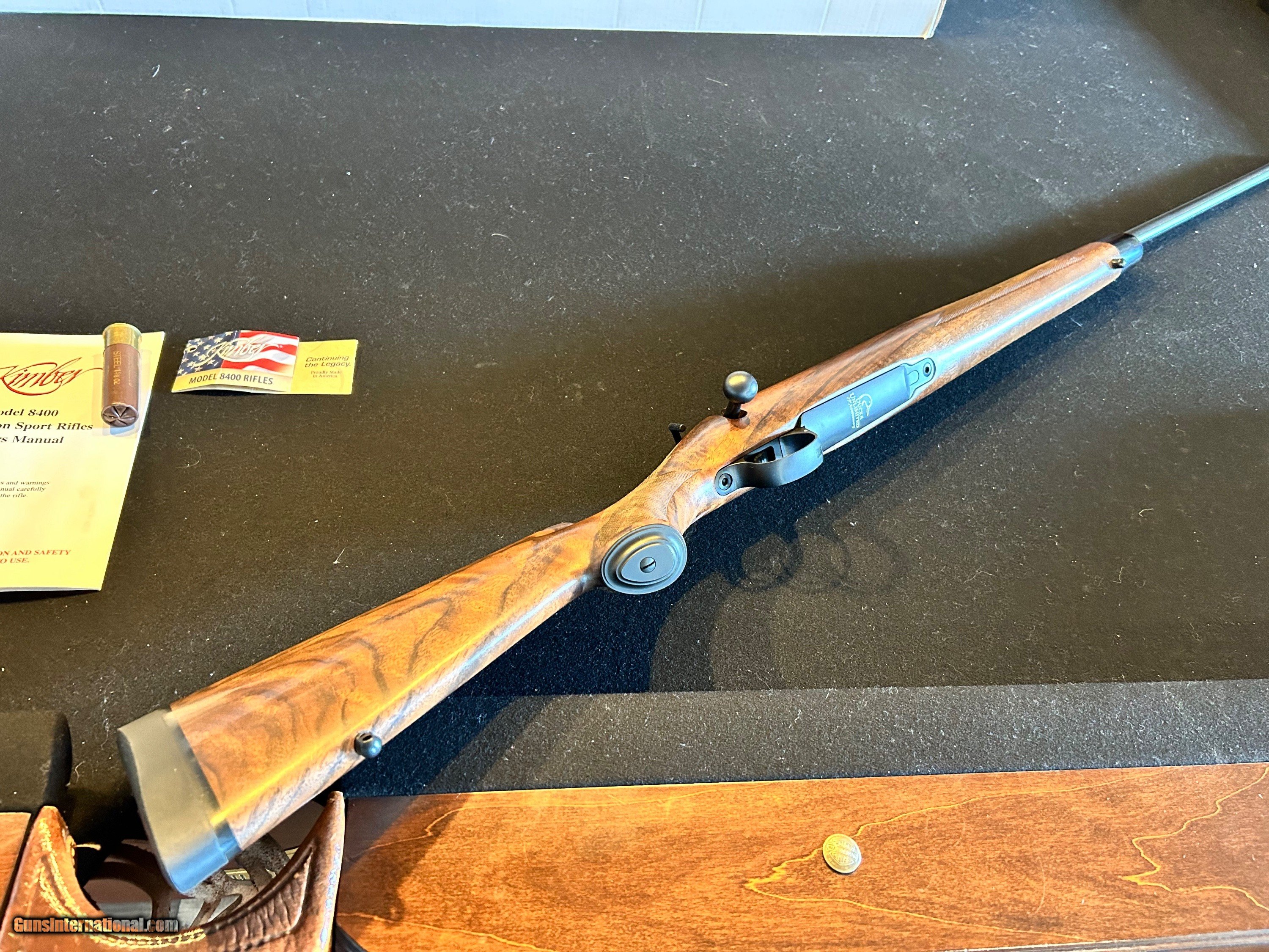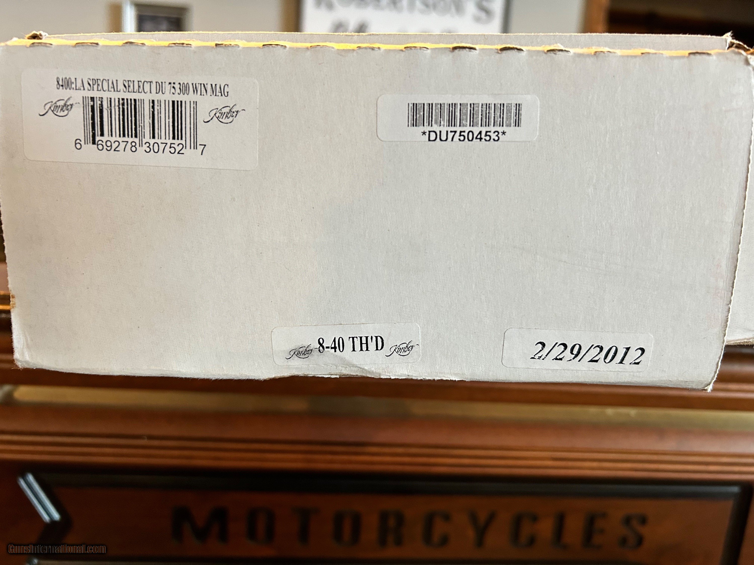 Description: New/Old Stock unfired Kimber Ducks Unlimited 75th Anniversary rifle. Chambered in 300 Win Mag, beautiful wood. The stock does have 2 very small blemishes, one small compression in the checkering and one just above floor plate on left side of gun(see photos), both are very small and not real noticeable. The rifle has had a scope mounted for display purposes only, there is no visible evidence of this: meaning no scratches or marks in the blueing. Gun is beautiful and in new mint condition. SOLD Rifle Caliber: .300 Winchester Magnum Manufacturer: Kimber Model: 8400 Condition: New old stock Metal Condition: 100% Wood Condition: 99% Bore Condition: 100% |