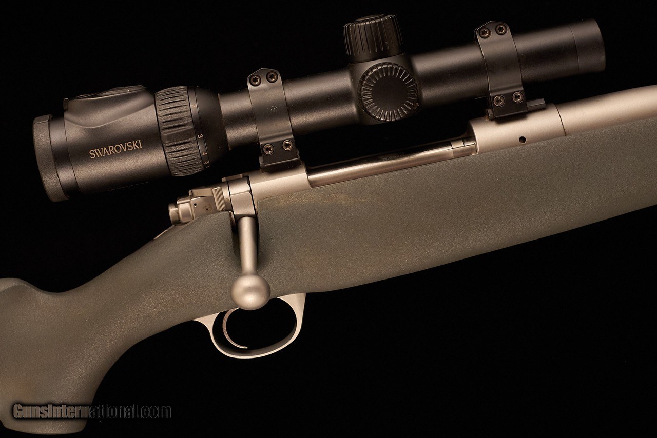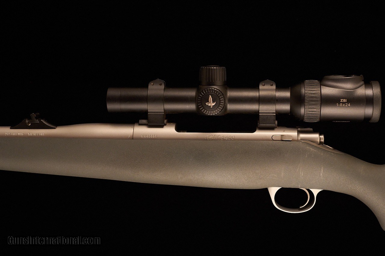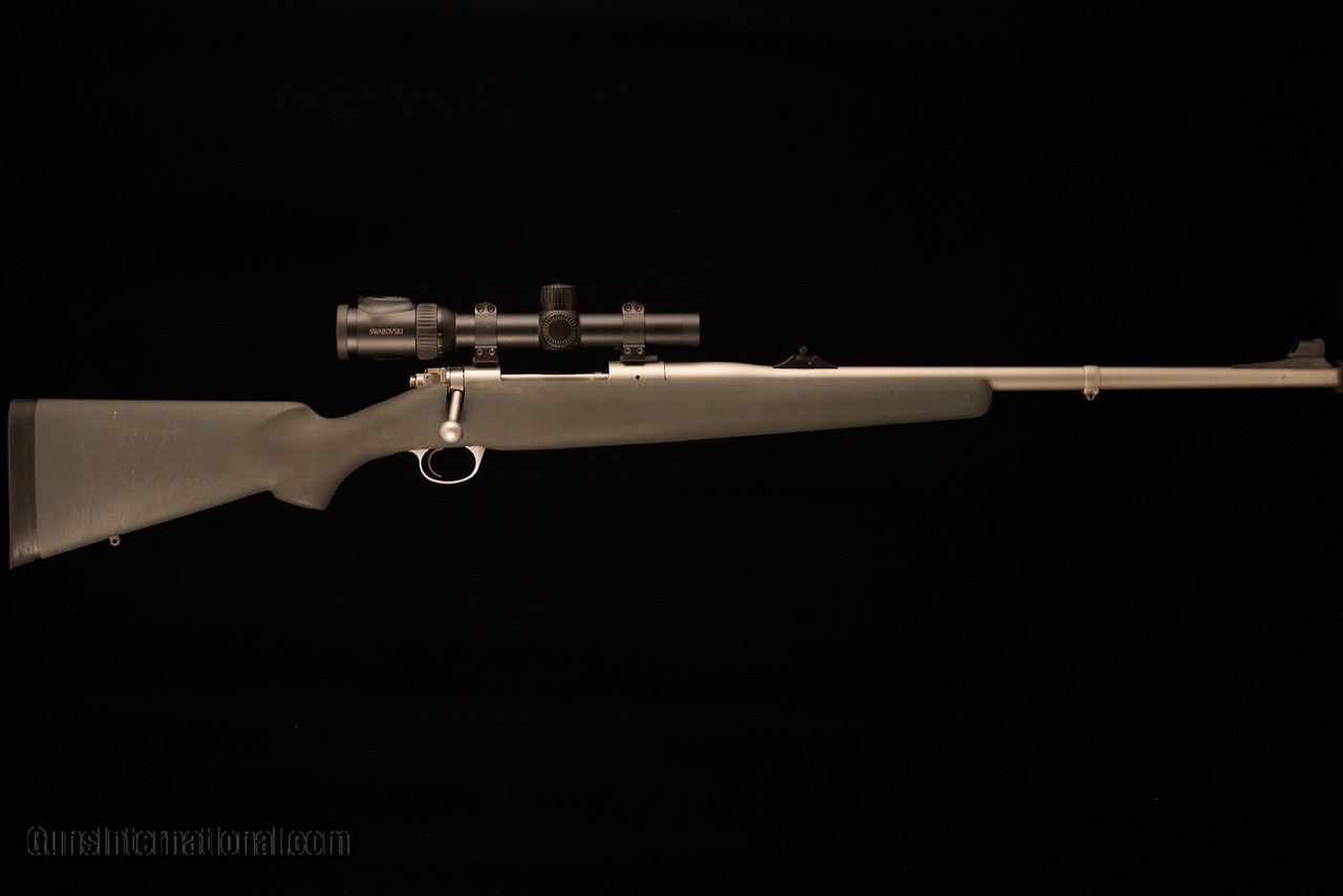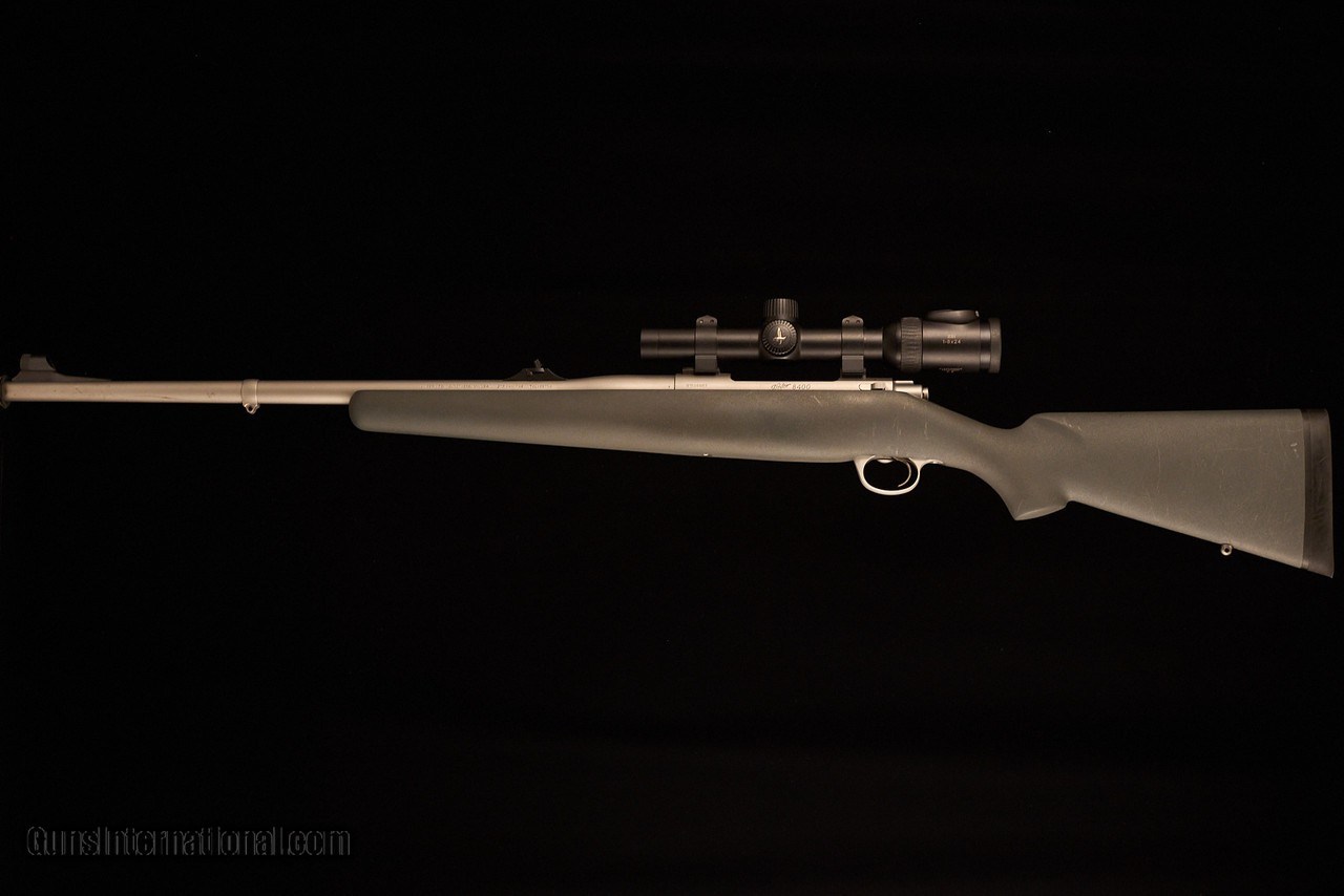 Kimber Talkeetna in .375 H&H Magnum with Swarovski Z8i 1-8x24mm scope in fixed rings. Stainless action/barrel and Kevlar stock. Excellent all-weather rifle! Bore is shiny and bolt face is very clean, indicating a low round count. Overall condition is excellent.