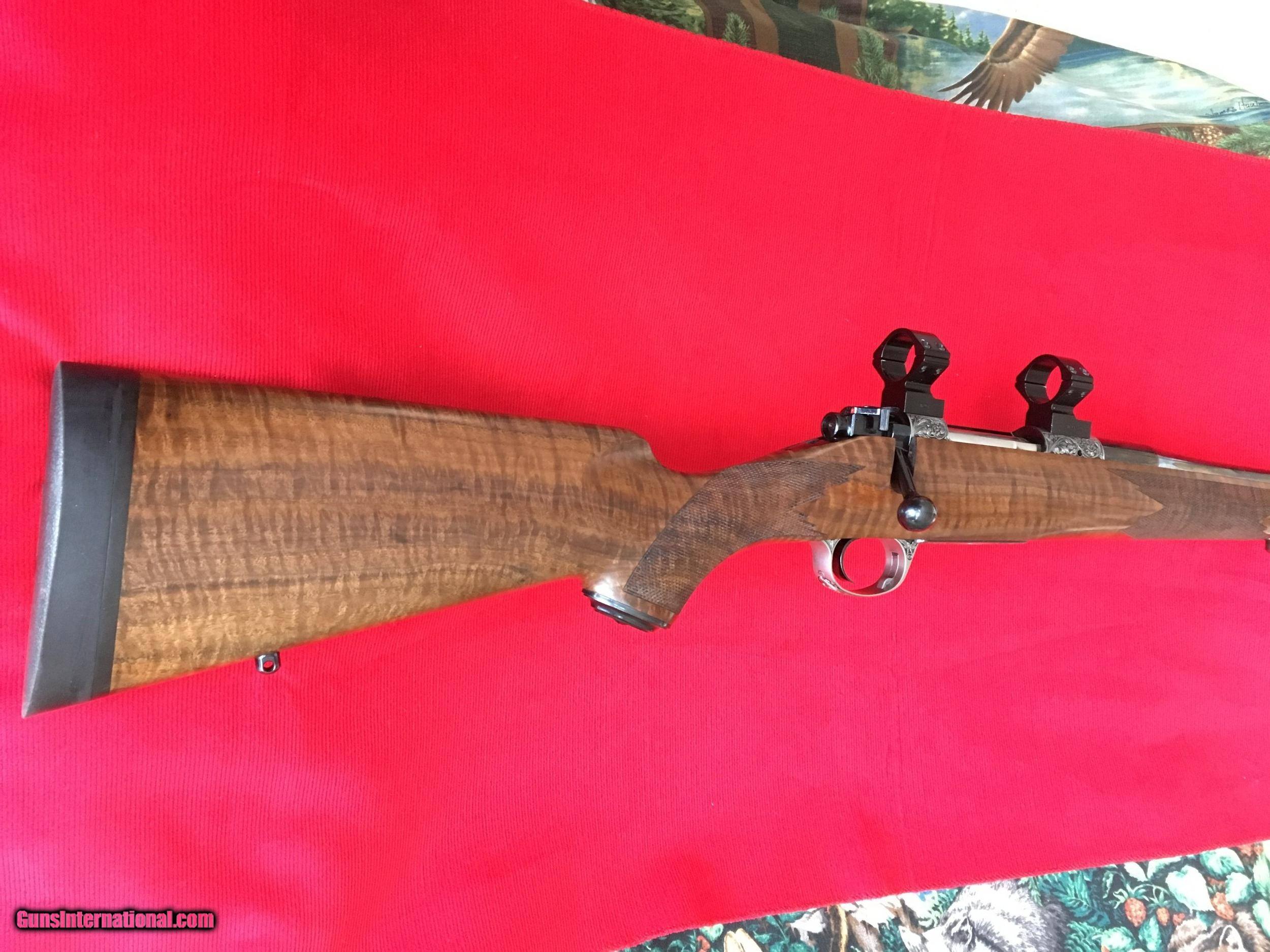 Description: Kimber 84M 7mm/08 Super America . Custom hand engraved by former Browning Master engraver Ron Reimer with an Antelope ringed with Gold on the floorplate . One of a kind gun with beautiful fiddle back walnut stock .Gun is in like New excellant condition . Comes with Talley 1" rings . SOLD |