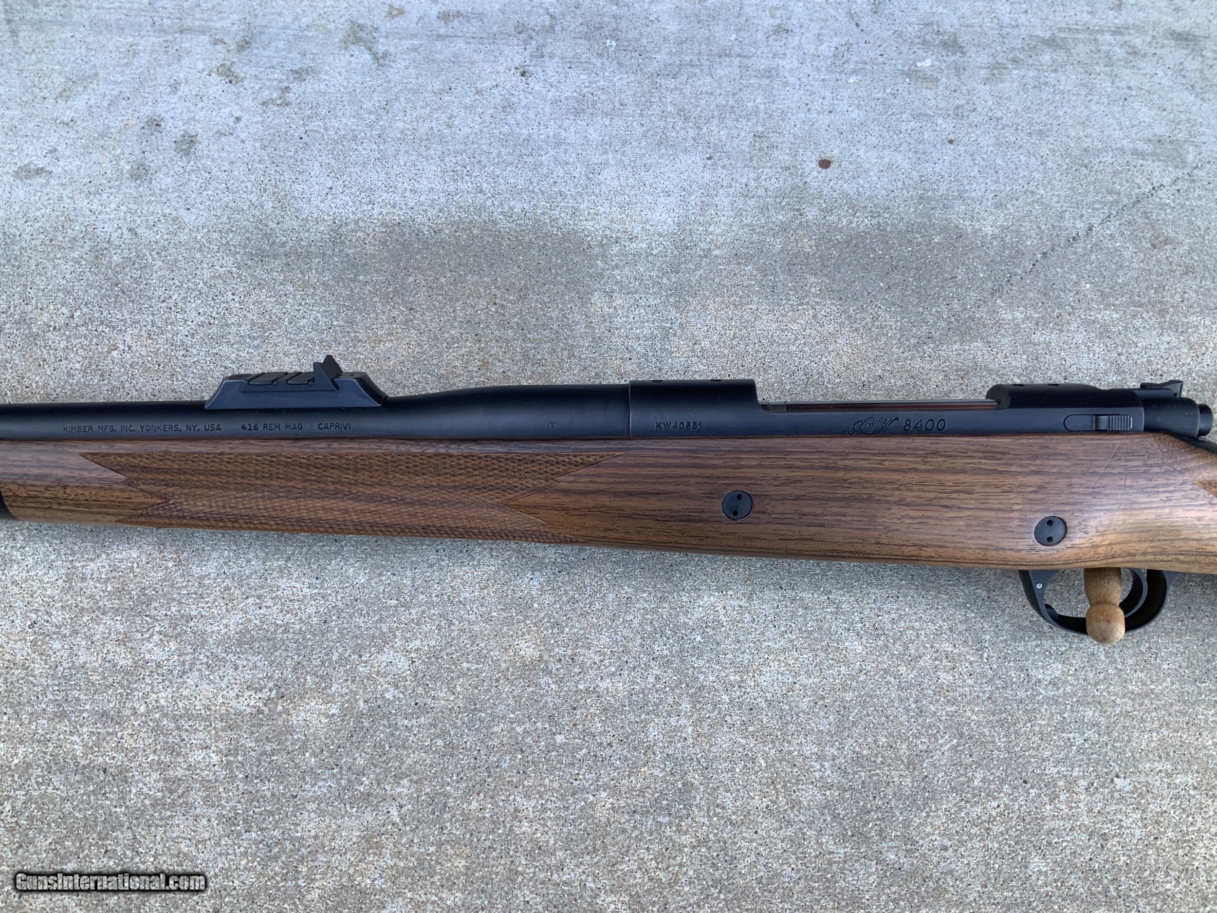 Description: KIMBER CAPRIVI .416 REM MAG BIG GAME RIFLE. I purchased this rifle in 2019 for a African Safari. Went to Zimbabwe and with this rifle shot a Cape Buffalo, Zebra, Spotted Hyena, Warthog, Klipspringer. The gun performed perfectly and is battle tested and ready for it's next safari. Photos show a few minor blemishes, very small difficult to see them. Original box, Owners manuel and paperwork included. BTW - Kimber no longer makes rifles in .416 Rem Mag caliber, therefore difficult to find in the future. SHIPPING EXTRA - Will ship in Plano gun case, insured, to your shipping address (FFL), call for shipping quote. SALE PENDING !!!! SALE PENDING !!!! SALE PENDING !!!! SOLD Rifle Caliber: .416 Remington Magnum Manufacturer: Kimber Model: Caprivi Serial Number: KW40551 Barrel Length: 24 Bore: Excellent Condition: Excellent Metal Condition: Excellent Wood Condition: Excellent as noted Bore Condition: Excellent Action: Bolt |