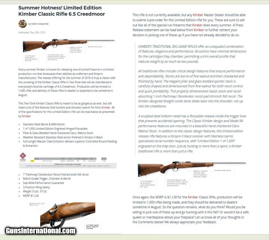 Kimber Model 84M Classic 6.5 Creedmoor Limited Edition (1 of 1,000 made) stainless steel barrel - original box