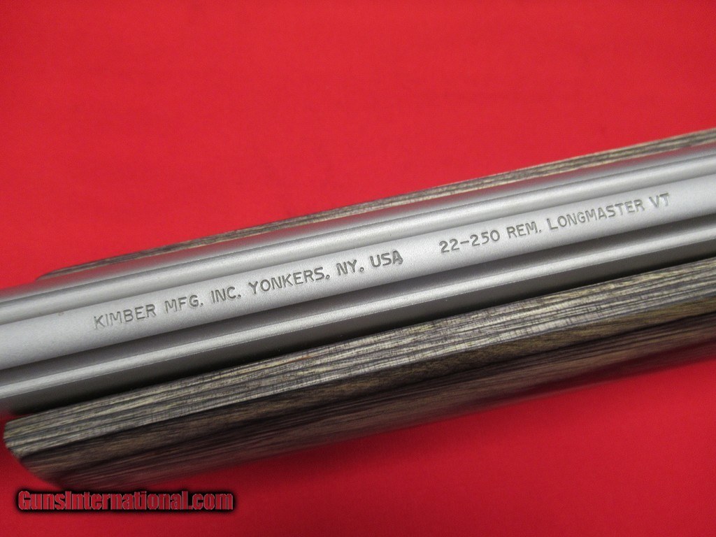 Description: Kimber Model 84M Longmaster 22-250 Rem 26" w/ Leupold bases -- Factory original and in near new condition. This gun appears test-fired only. Heavy laminate target style stock with stainless fluted heavy barrel. This is one sharp looking rifle. SOLD |