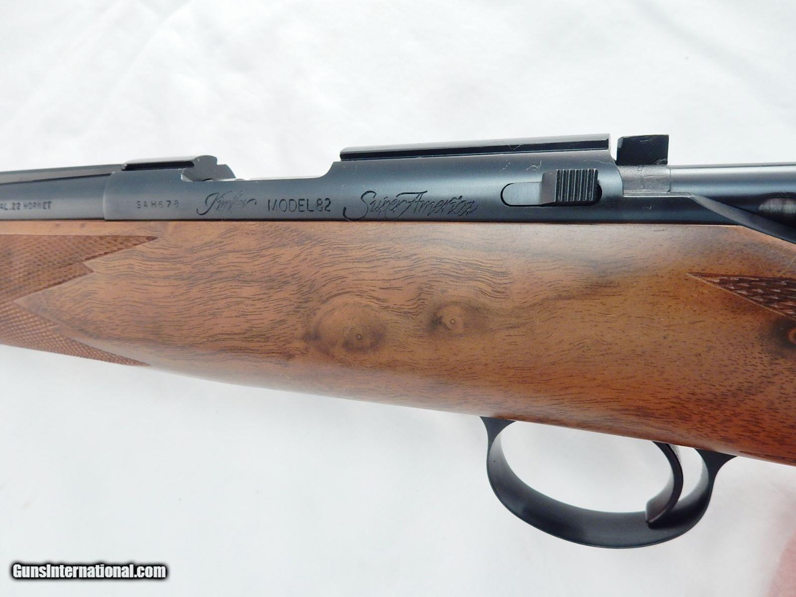 Description: This is a Kimber 82 Super America 22 hornet with a 22 inch barrel. This gun is 99% with no box. Options are checkered butt plate, quarter rib, hooded front sight and jeweled bolt. Serial # is SAH6xx. Buyer pays 55.00 shipping. Thank you. 42-9-1 SOLD |