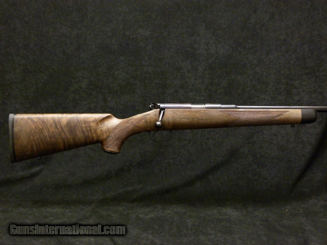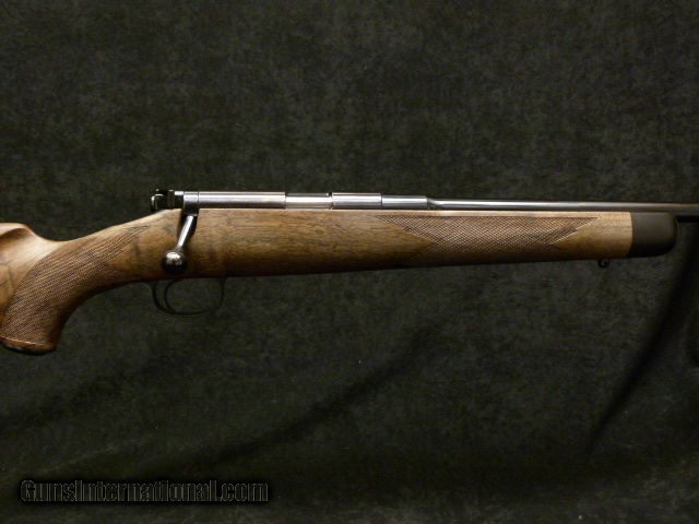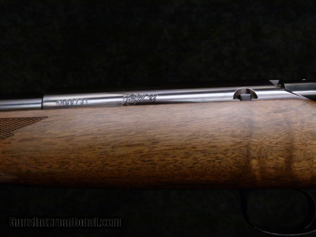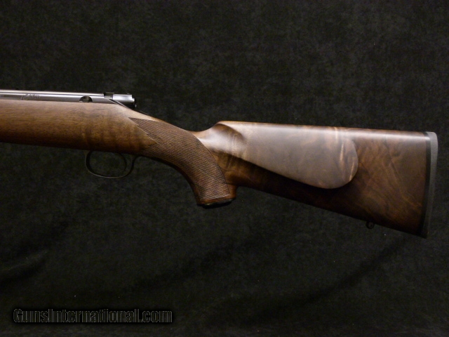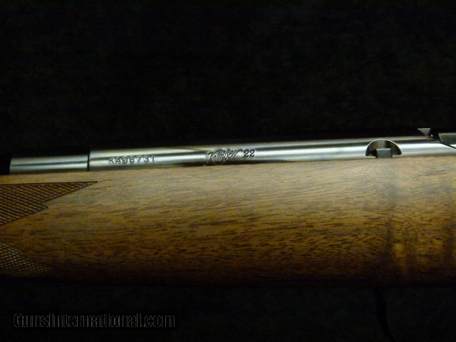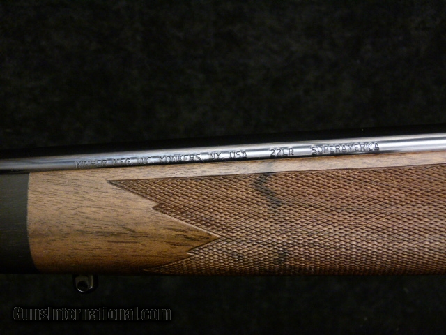 Description: Kimber (Yonkers, NY) Super America Model .22 LR, highly polished drilled & tapped blue receiver and custom sporter weight 22" barrel, 3-positiion safety, AAA Claro walnut with right hand cheekpiece, steel grip cap, wrap 22 lpi checkering and ebony forend tip, oil finish stock with 13 5/8" lop over thin rubber pad, ball swivels. As new in box but no papers. Weighs 6 lbs. 1 oz. SOLD |