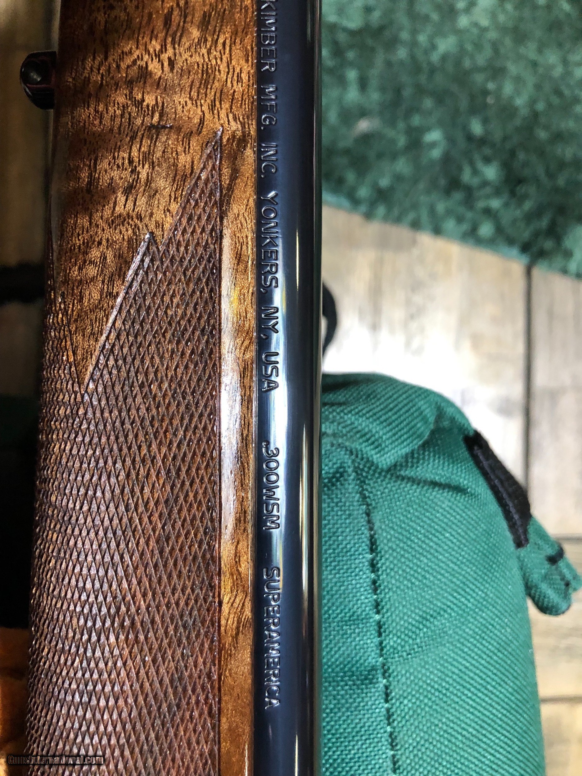 Description: Kimber Of NY Superamerica 300WSM. 24” Sporter high deep gloss blue barrel. Outstanding AAA Claro walnut stock. The spot on the gun is the only real mark on the gun only caused by taking it to the range. Gun in excellent shape with barely double-digit round count. Also included, at no extra charge, are the bases & rings. Buyer pays for shipping & any insurance desired. SOLD |