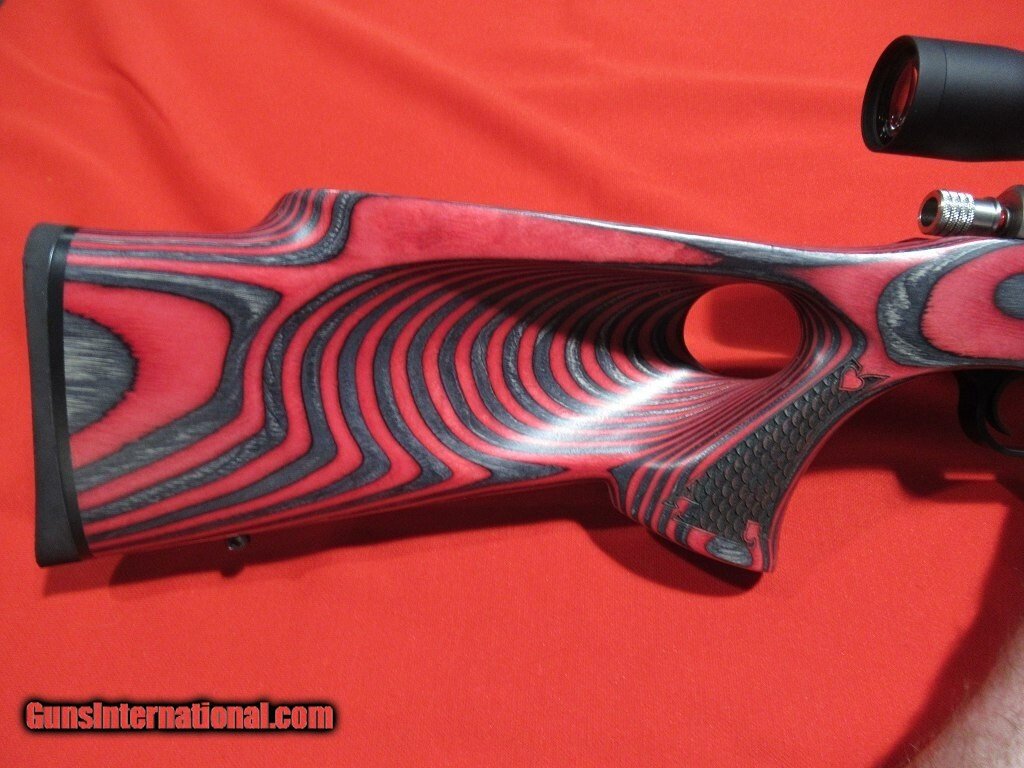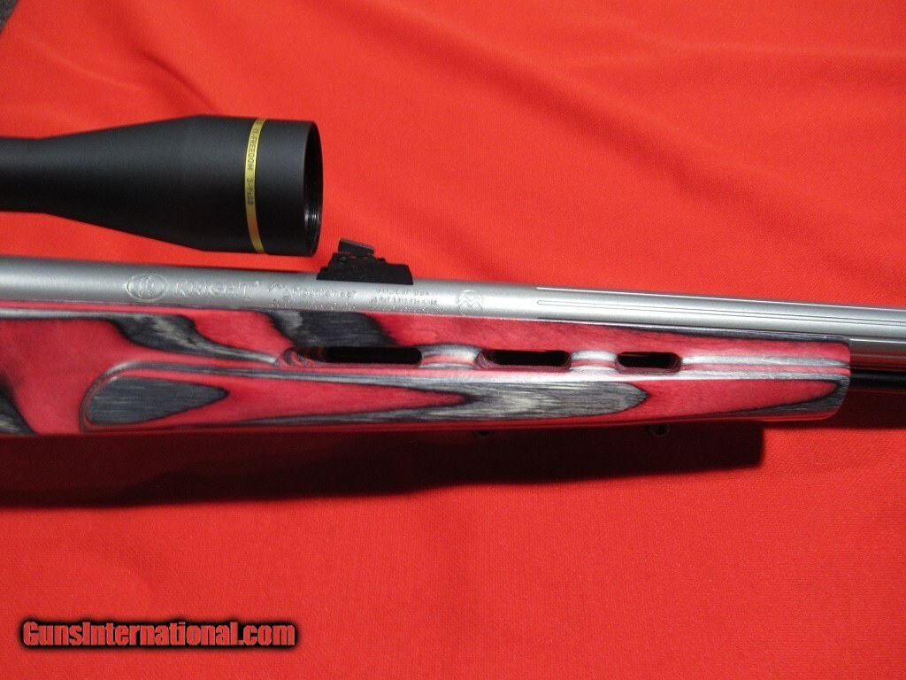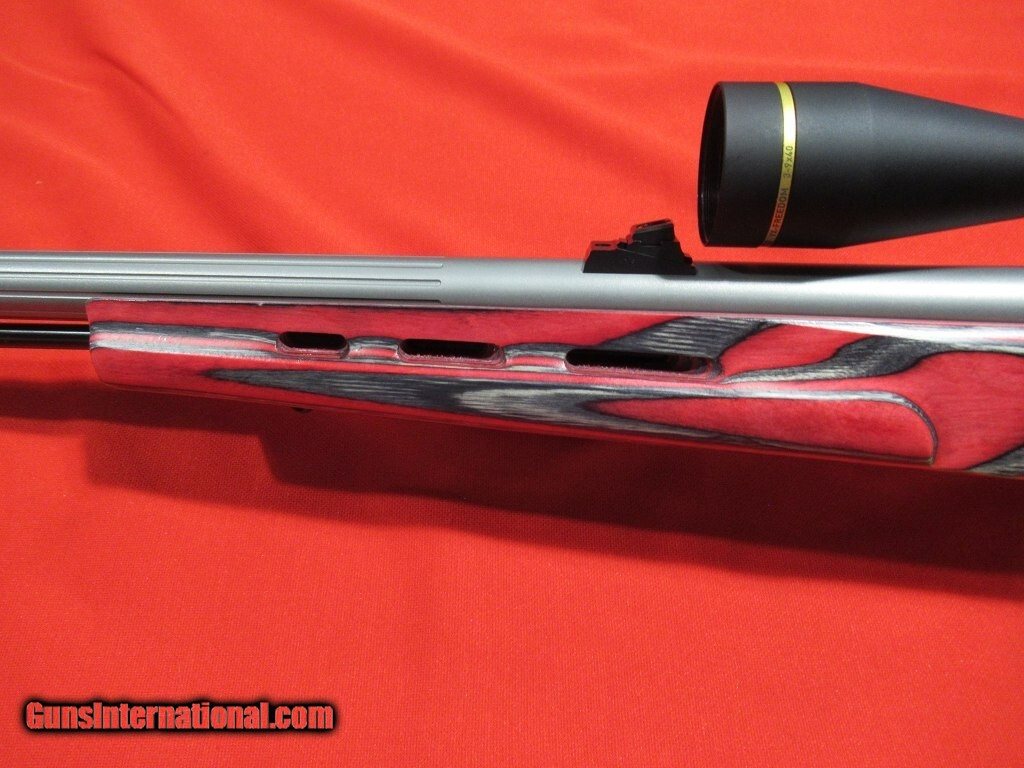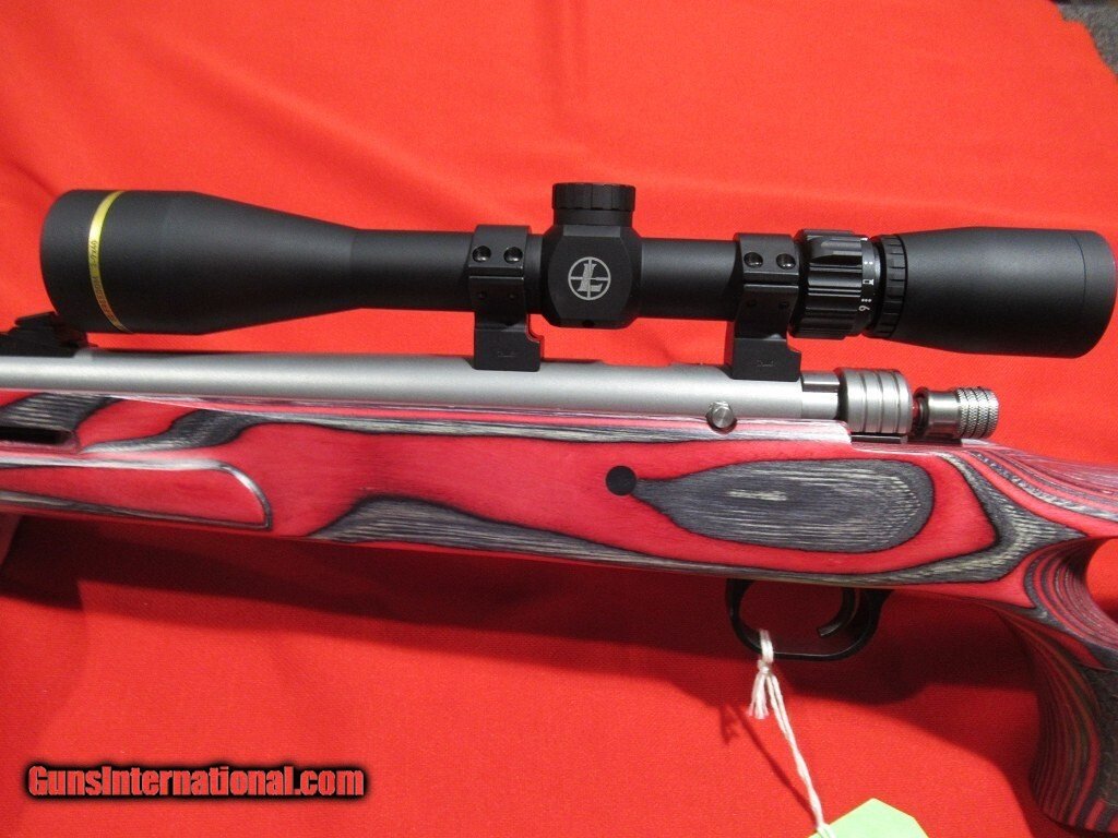 27" fluted Green Mountain barrel with 1-28" twist satin stainless barrel, red laminate thumbhole stock, adjustable fiber optic front and rear sights, topped with a Leupold VX-Freedom 3-9x scope.