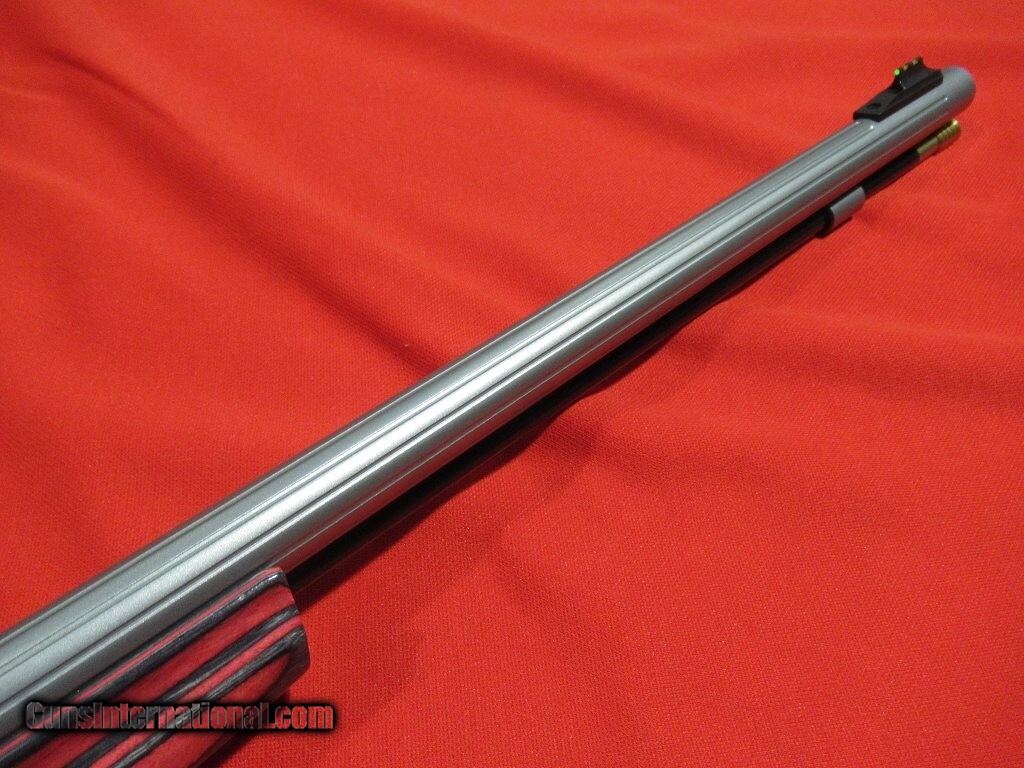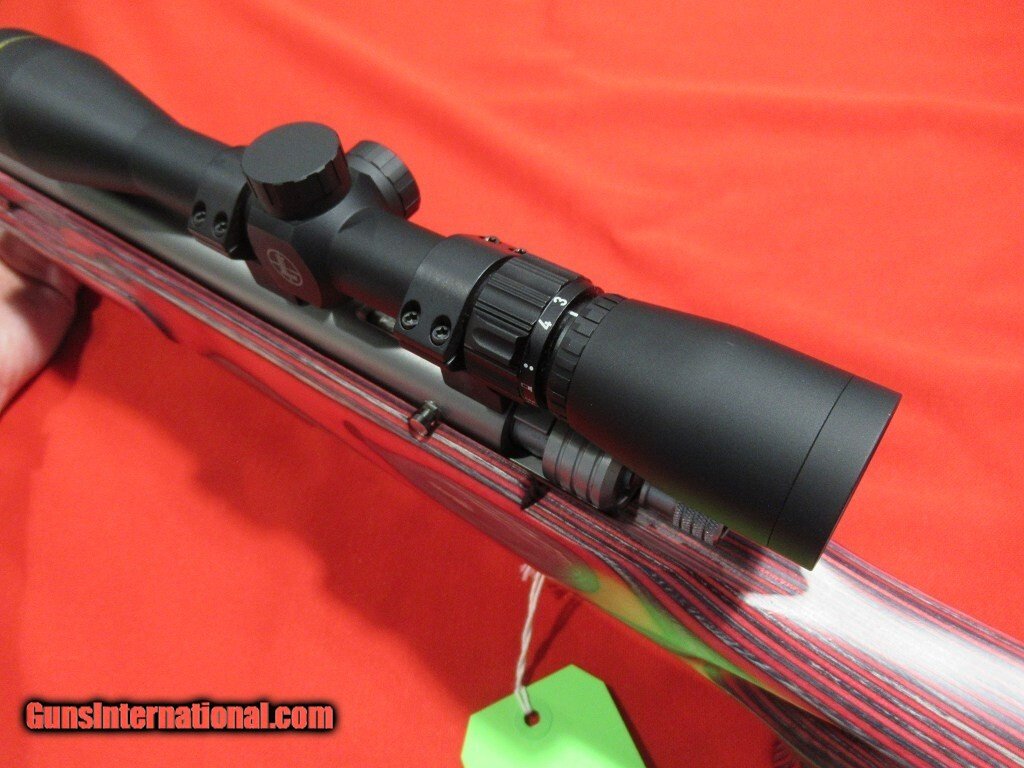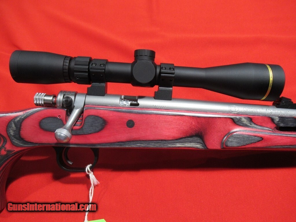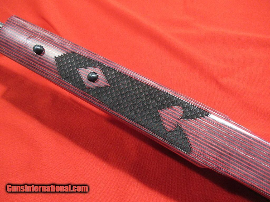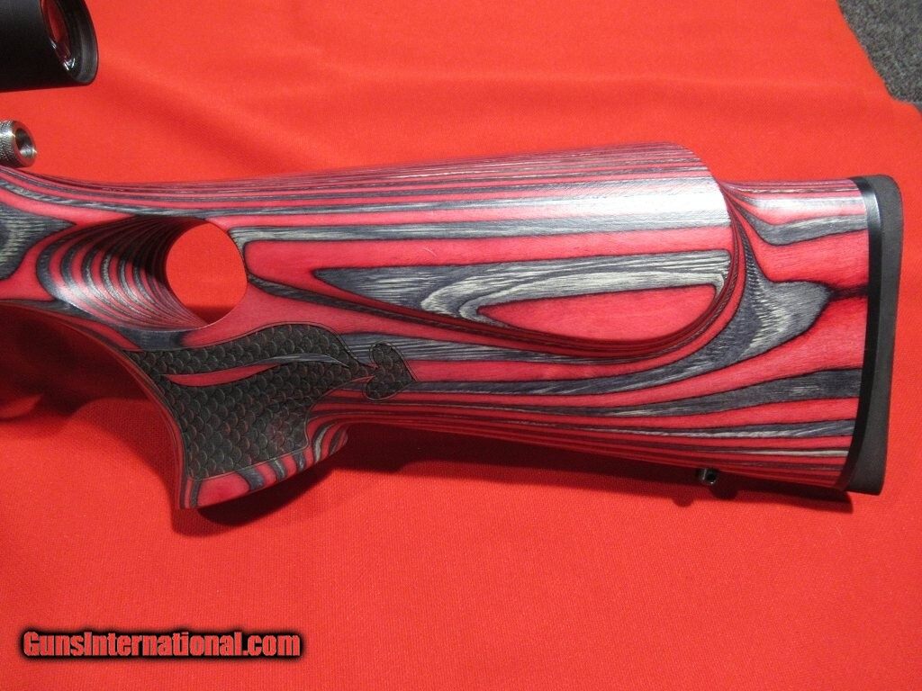 27" fluted Green Mountain barrel with 1-28" twist satin stainless barrel, red laminate thumbhole stock, adjustable fiber optic front and rear sights, topped with a Leupold VX-Freedom 3-9x scope.