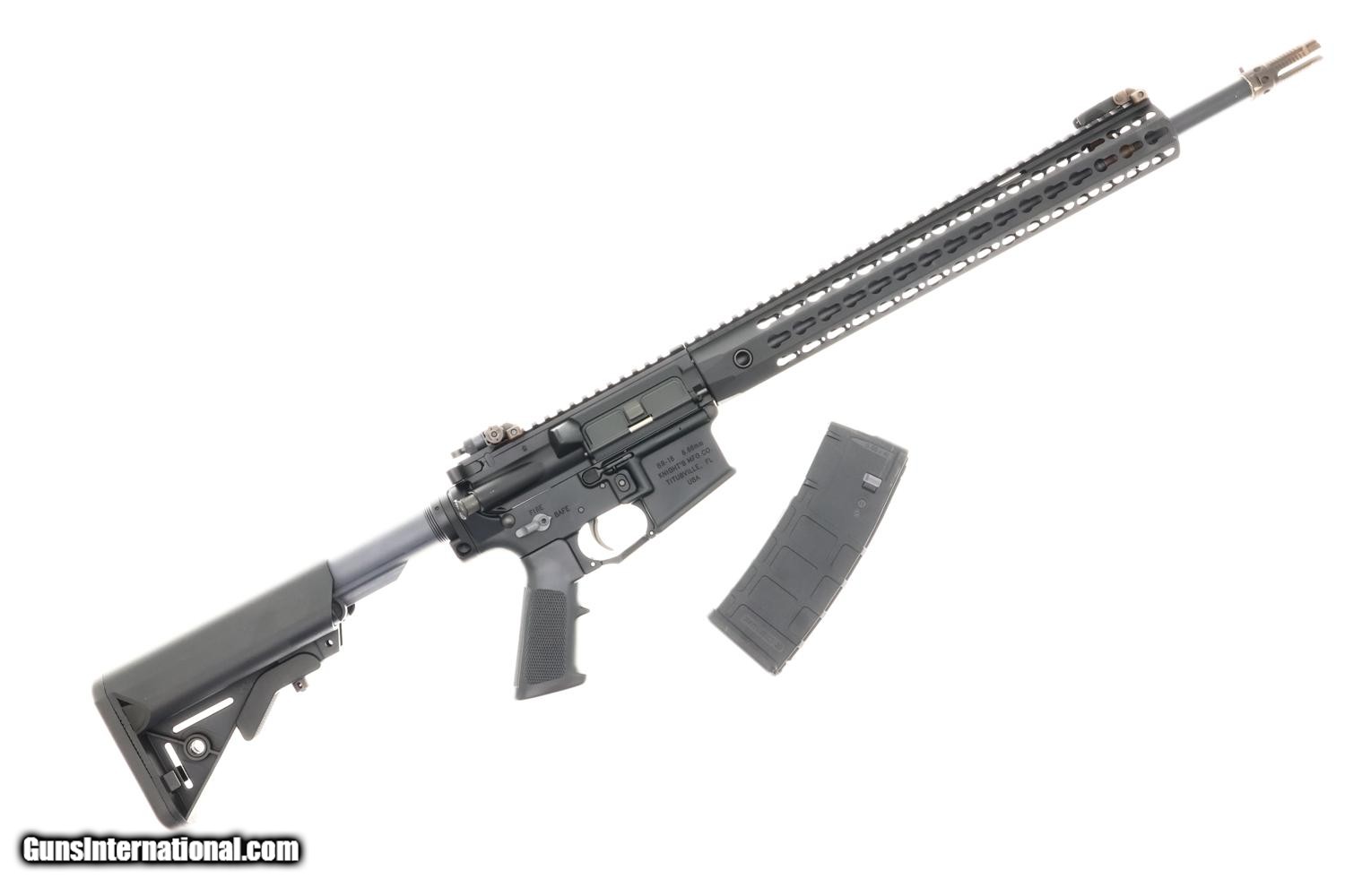 Standard configuration Knights Armament SR-15 (LRP Mod 2) semi-auto rifle, cal. 5.56x45mm with Knights Armament flip-up height adjustable front and fully adjustable rear aperture sights. On the left side of the “M-Lock” hand guard is “KNIGHTARMCO”. On the upper receiver there is “LPR MOD 2”; on the lower receiver is “STONER RIFLE/KNIGHTS ARMAMENT LOGO/KM910709” and ambidextrous safety selector switch. The right magazine well is marked “SR-15 5.56mm/KNIGHT’S MFG.CO./TITUSVILLE, FL/USA”. Complete with three-prong flash hider/suppressor adapter, one PMAG brand 30 round magazine, and black plastic buttstock. Matching hard plastic case.