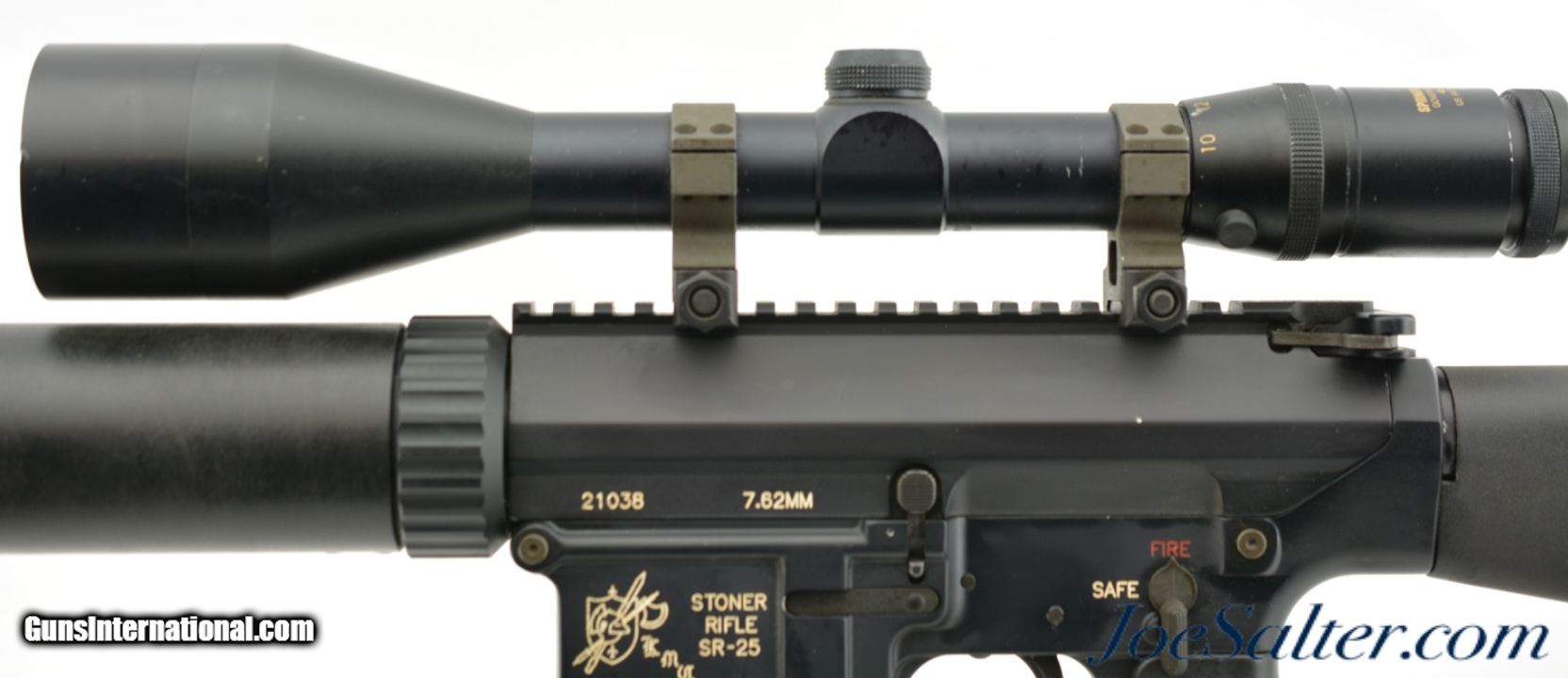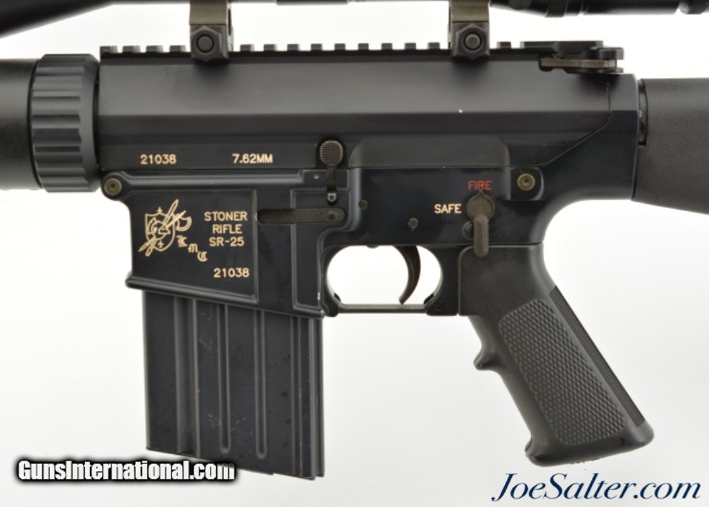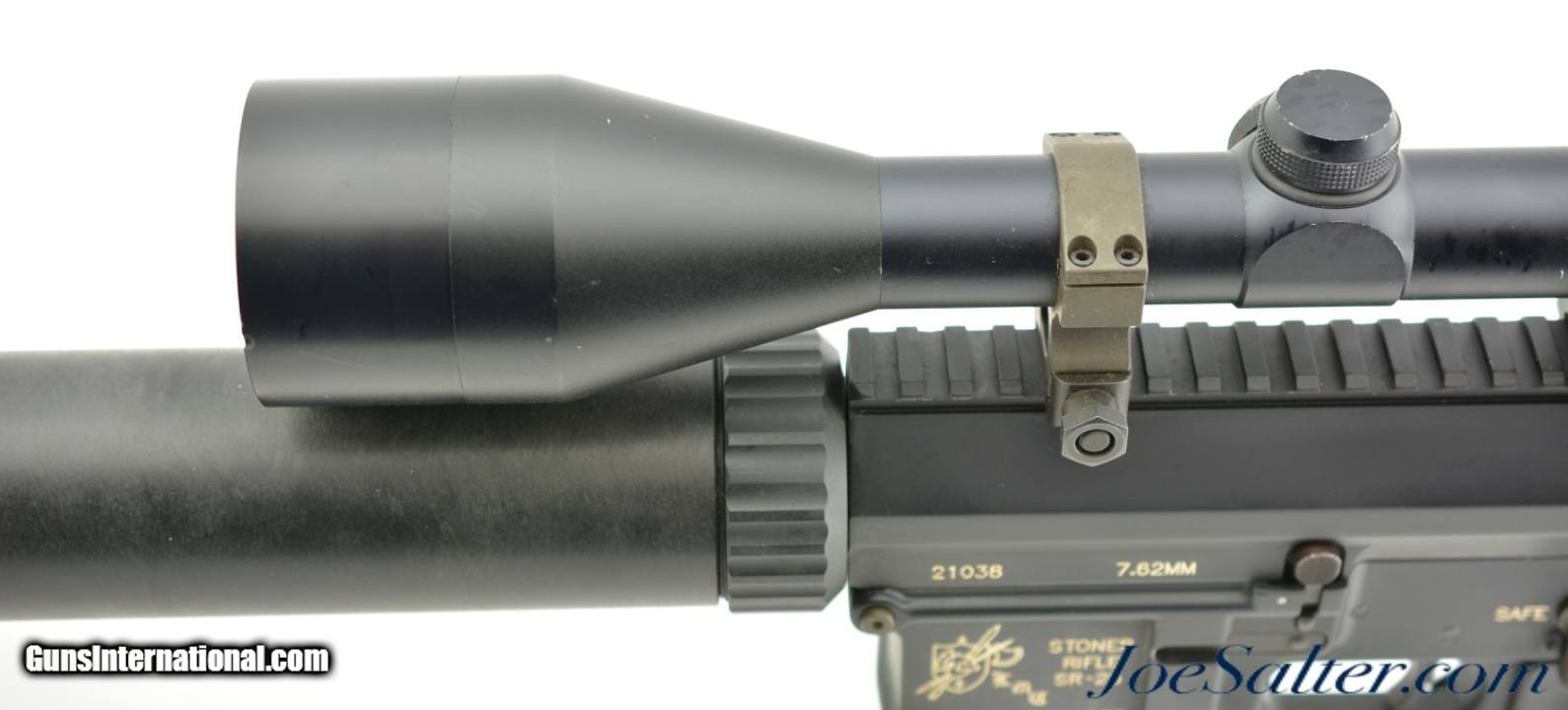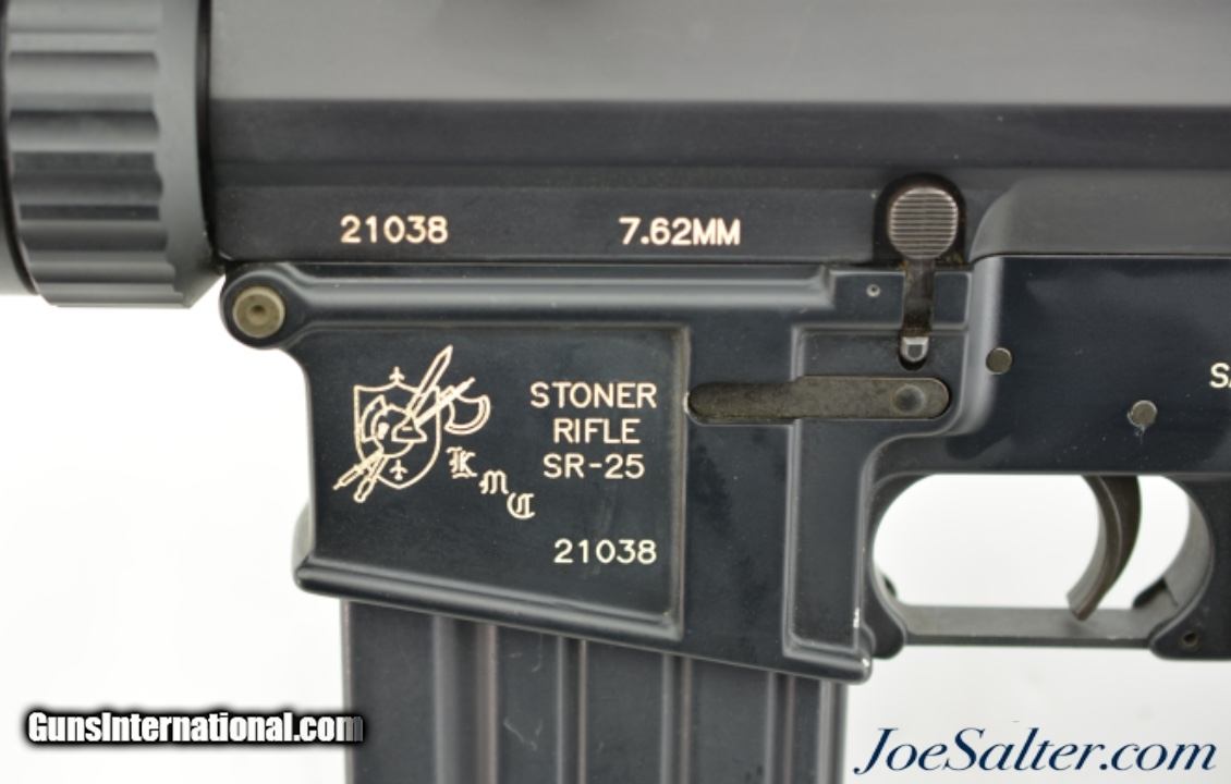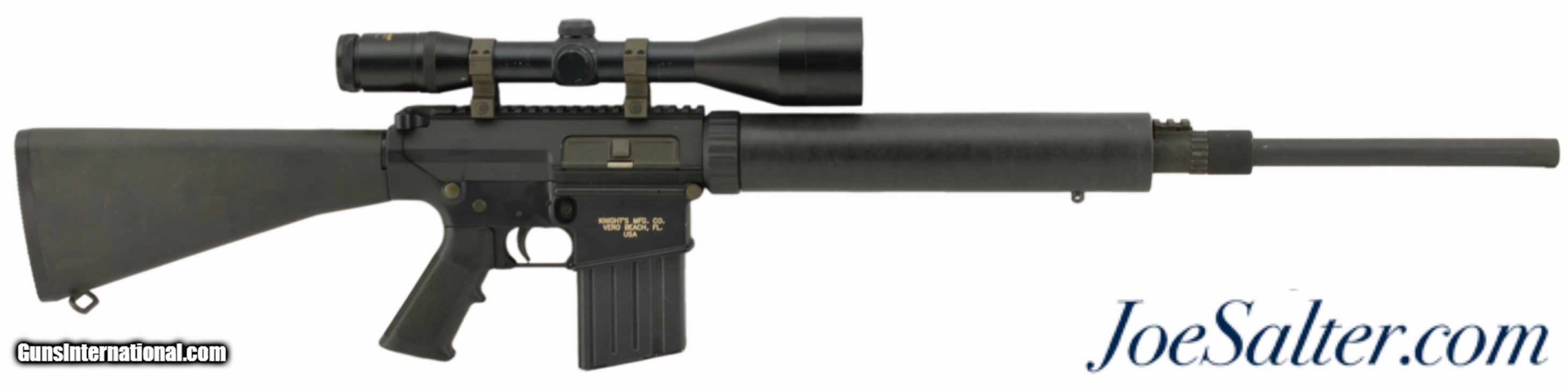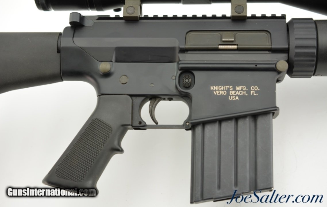 Pre-Ban Knight’s Manufacturing Co. Model SR-25 Rifle Built in 1993 308 Win  Description: Serial #21038, 7.62 x 51mm NATO, 24" match barrel with an excellent, bright bore. According to Knight’s Armament Co. records, this rifle was manufactured in September of 1993, and has the early Vero Beach address. The barrel retains 97-98% of the original matte blue finish, with a commensurate amount of the original black anodized finish remaining on the upper and lower receiver. The cylindrical aluminum free-floating handguard likewise exhibits very little wear, and the chromed bolt carrier exhibits hardly any evidence of use. The A2 pistol grip and fixed stock are in excellent shape with only some minor scratches and tiny surface blemishes scattered about. The rifle has no iron sights, but is equipped with a Springfield Armory Government Model 4x & 14x 56 scope with first focal plane range-finding reticle and internal spirit level. The optics are crisp and clear with excellent brightness. Finally, a single 20 rd. magazine is included. This is a splendid example of a high quality, American-made rifle and is in excellent condition. FFL; SOLD |