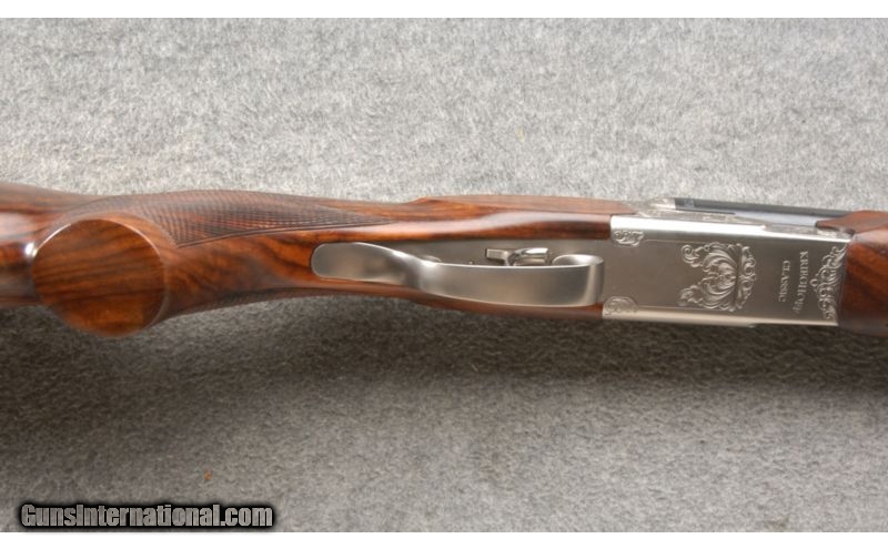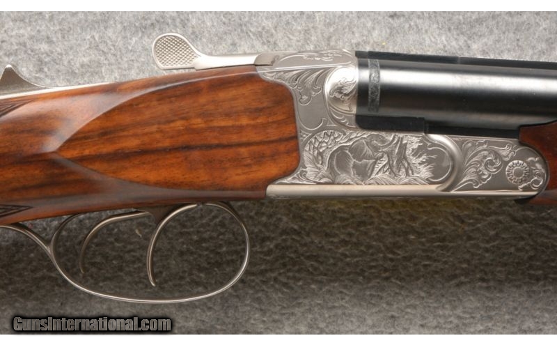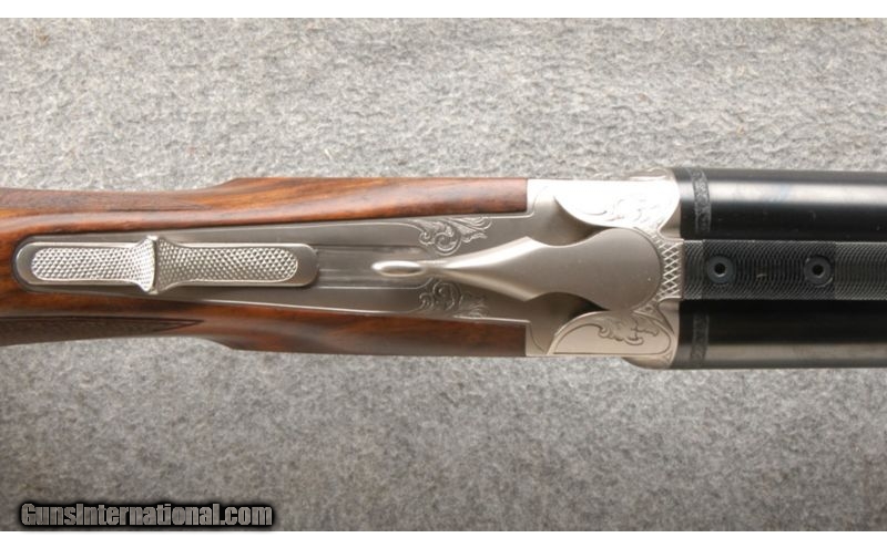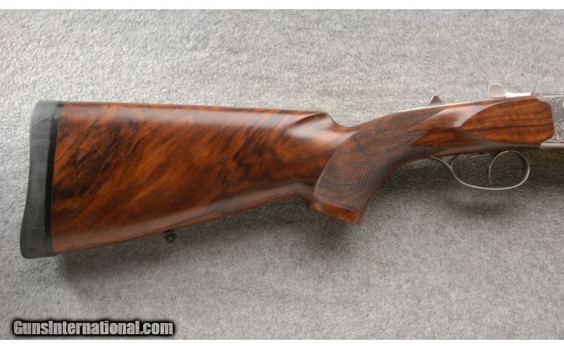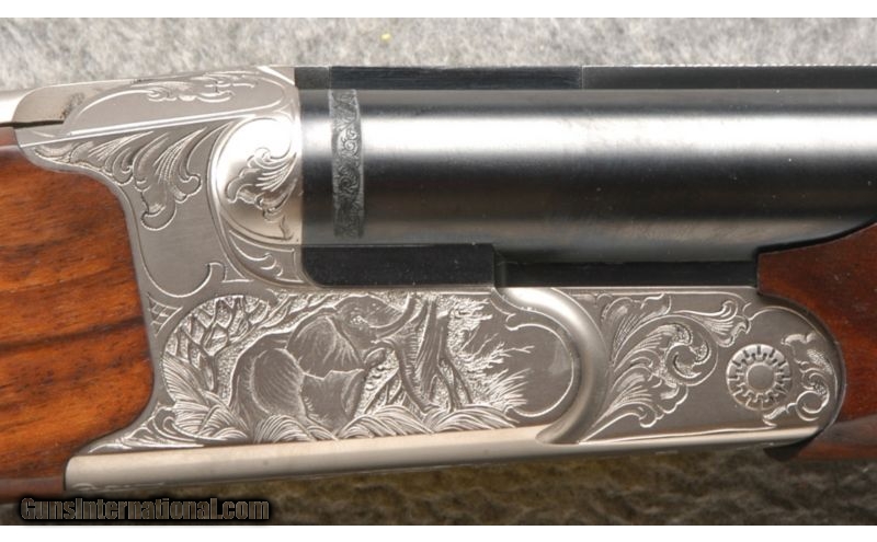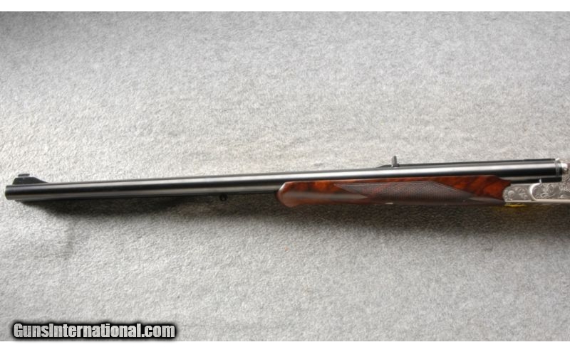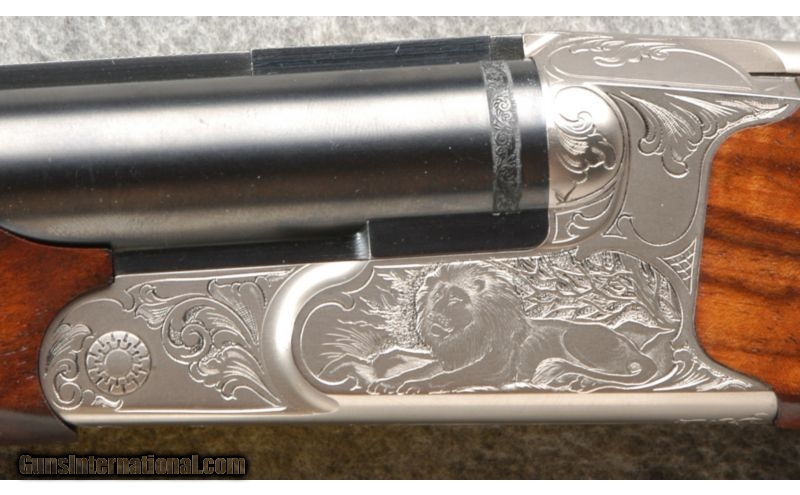 Description: This fine Safari rifle is in very nice hunting condition. The receiver and barrels are in excellent condition with only minor marks you have to look for. The high grade walnut stock has a few small dings and dents and a small amount of finish missing. The engraving is crisp and clean with a Bull Elephant and Male Lion. All in all a very nice rifle in the hard hitting and easy shooting .500 X 416 Nitro Express cartridge. SOLD Manufacturer: 2008 Caliber Info: .500 X 416 Nitro Express. Chambers: Side X Side with extractors. Metal Condition: Excellent. Wood Condition: Very good with minor dings. Bore Condition: Bright and shiny. Barrels: 23.5 inch with express sights. Triggers: Double with the front trigger being articulated. Stock: Very nice high grade walnut with a shadow line cheek piece, checkered pistol grip and palm swell for a right handed shooter. Stock Dimensions: 15 1/8 inch LOP to the front trigger. Fore End: Matching checkered walnut with a schnable. Butt Pad: Black XLT soft rubber butt pad. Weight: 11 Lbs 11 Oz. Sights: Fixed express sights. Extras: Comes with the owners manuel. Item Location: Richfield, WI |