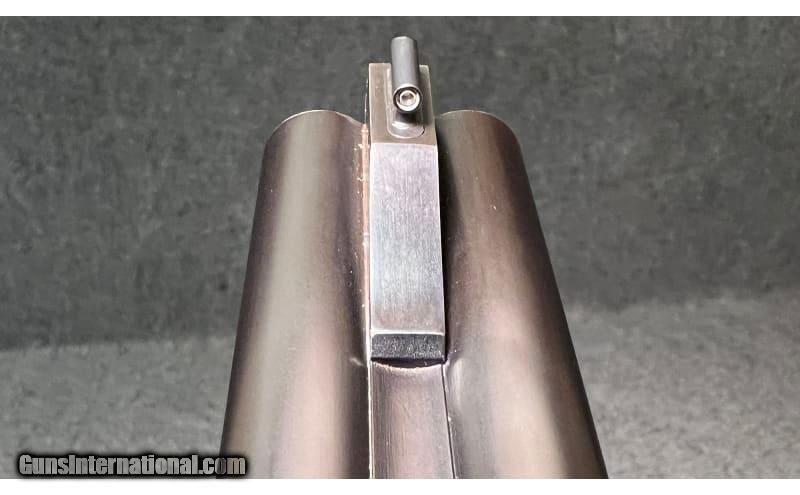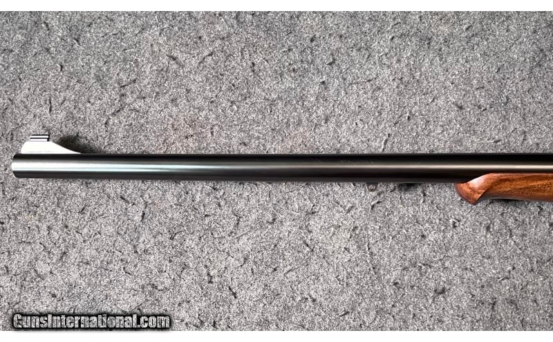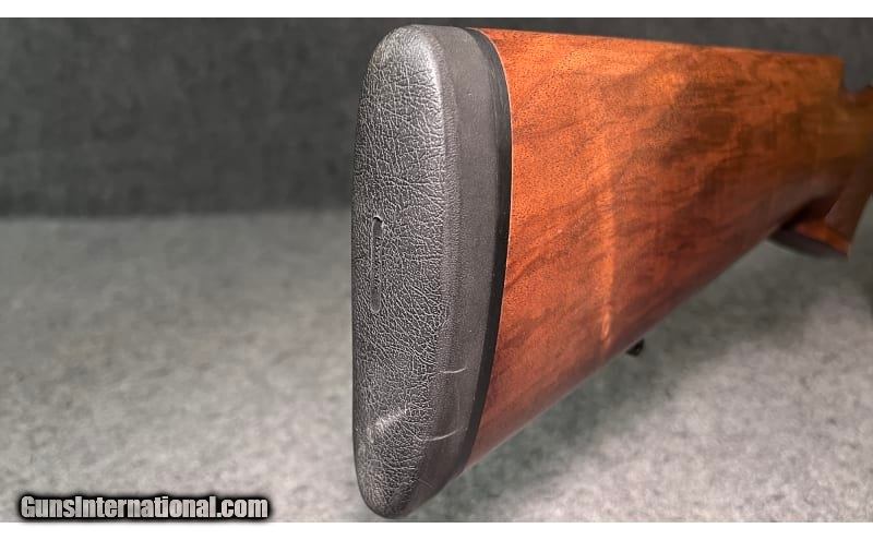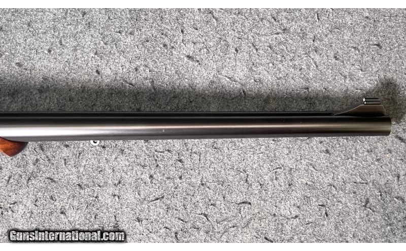Description: This Krieghoff Big Five "Classic" double rifle is chambered in the uncompromising .470 Nitro Express caliber. It has 23½" barrels with the express style quarter solid rib, sling swivel studs top and bottom, a 1" Decelerator butt pad, and a length of pull on the first trigger of 15" and the rear trigger 14¼". This rifle is designed with a hinged front trigger to protect your trigger finger when shooting the rear trigger, as the recoil will push the rifle backwards, driving the front blade into the back of that finger. It has a 'combi-cocking' lever that dominates the top tang. This cocking lever allows the rifle to be carried when fully loaded, without the fear of an accidental discharge. As the 'Big Five' is raised to the shoulder, the thumb pushes this lever forward ready for firing, but does not automatically decock the firing mechanism when the action is broken for reloading. This design is invaluable for dangerous game hunting where re-loading and subsequent shots must be executed in the fastest possible time. So you break the barrel, reload, raise it the shoulder and fire without the need to cock the action again. Simple and effective. The bluing is in excellent condition with virtually no handling wear visible. Likewise, the fore arm and butt stock are in excellent condition with no discernable handling wear, nor marks, chips or cracks. The bore is very bright and shiny with excellent sharp-edged rifling intact. .470 Nitro Express SOLD Metal Condition: Bluing is in excellent condition with virtually no handling wear visible Wood Condition: "Fore arm and butt stock are in excellent condition with no discernable handling wear, nor marks, chips or cracks Bore Condition: Bore is bright and shiny with excellent sharp-edged rifling intact Barrels: 23½" barrels with express style quarter solid rib Triggers: Double triggers: The front activates the right barrel and the rear the left Stock Dimensions: "14¼"" LOP, overall length 41¼"" Fore End: Semi-Beavertail forearm with diamond checkering Butt Pad: Right-handed stock with Rigby-style cheekpiece and diamond checkered pistol grip Weight: 9 lbs 12 oz Sights: Fixed front moon sights and an open 'V' to the rear on the raised central rib Item Location: Wichita, KS |