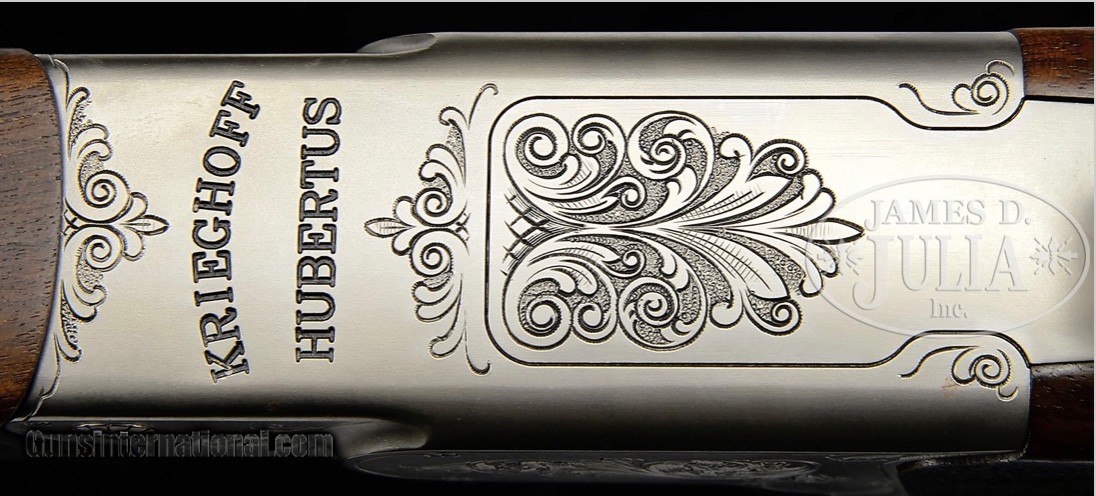 Description: SOLD PENDING FUNDS KRIEGHOFF HUBERTUS SINGLE SHOT RIFLE WITH EXTRA BARRELS, SCOPE, AND CASE. SN 020372. Cal. 6.5 x 57R, 30-06, 9.3 x 74R. 23-5/8″ Bbls are each fitted with quarter rib having one standing leaf rear sight, and mounts for Recknagel “ERAMATIC” quick detachable scope rings. Bbls also have banded-on sling eyes and front sight ramps with square, bronze beads, and are marked with Krieghoff name and address and warnings. 30-06 and 9.3 Bbls are round. 6.5 Bbl is octagon. Each bbl set has caliber stamped in milled out portion of left rear lump, which is also marked “KRIEGHOFF ULM” and with SNs. Each bbl set has its own schnabeled forend with Deeley latch, marked for caliber in bbl channel. Lightweight, coin finished action is fitted with Krieghoff’s unique “Kickspanner” action with large cocking/ safety slide on top tang. Rifle is absolutely safe and uncocked when slide is in the “safe” position. Once thumbpiece is pushed forward action is cocked, and remains “live” and cocked by opening the action, through repetitive shots, until thumb slide is released back into “safe” position. Action is engraved with cleanly cut, tasteful sprays of large, shaded, open scroll. Bottom of action is marked “KRIEGHOFF HUBERTUS”. Trigger is “set”. Well figured European walnut full pistol grip buttstock measures 13-7/8″ over thin, black pad. A sling eye is on toe line. Point pattern checkering is at grip. There is a silver colored oval depicting standing grizzly bear, with what looks like a hallmark on bottom rock. Aforementioned forends match well. 9.3 x 74R BBL set: Drop at heel: approx 2-1/4″, drop at comb: approx 1-1/4″. Weight: 6 lbs. 6 oz. LOP: 13-7/8″. 30-06 BBL set: Drop at heel: approx 2-1/4″, drop at comb: approx 1-1/4″. Weight with scope: 7 lbs. 14 oz. LOP: 13-7/8″. 6.5 x 57R BBL set: Drop at heel: approx 2-1/4″, drop at comb: approx 1-1/4″. Weight: 6 lbs. 11 oz. LOP: 13-7/8″. Zeiss DIATAL – ZA 8 X 56 scope with heavy post and crosshair duplex reticle is in Recknagel ERAMATIC mount which fits 30-06 bbl. Two other ERAMATIC base/ ring sets without scopes are also with the rifle. Makers tan leather case with two combination locks, is lined in green cloth, has Krieghoff leather label stitched into lid, and has space for action, three bbl sets, scope, and both spare mounts. CONDITION: Excellent, near new. Wood and metal retain essentially all their orig finishes, with a few minor marks. Bores are excellent, bright and shiny throughout. Action is crisp. Set trigger works. Scope has some marks in exterior lacquer from another mount, and with some scratches and minor chipping on ocular bell. Optics are excellent. Case leather is excellent, with a few minor marks. Straps and handle are very fine. Interior cloth shows marks from contact with gun and bbls. Partitions have been rearranged, and there’s some glue in cloth. A fast handling, well balanced rifle, ideal for a one gun worldwide hunter. Last manufacturer’s retail for this combo would be well in excess of $16,000.00. 4-50171 MGM43 (6,500-9,500) More pictures available. Just ask SOLD Manufacturer: krieghoff Model: hubertus |