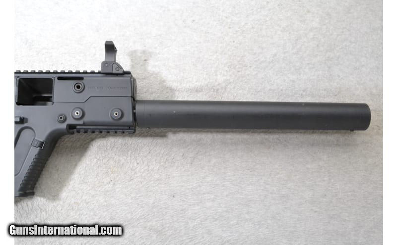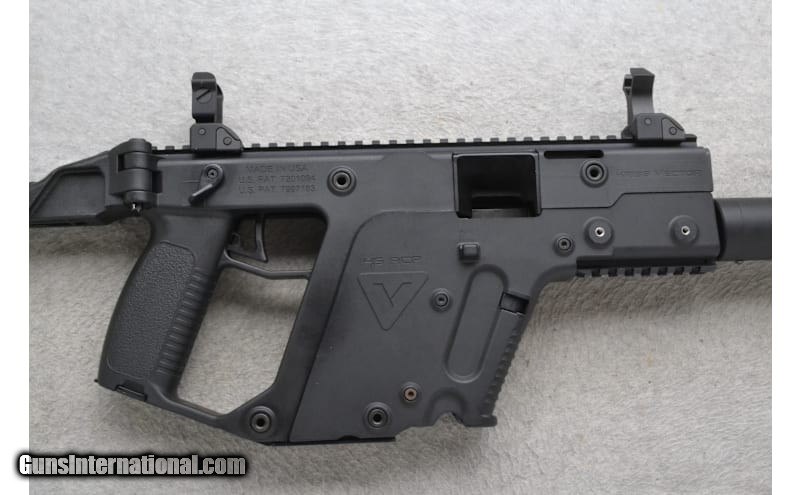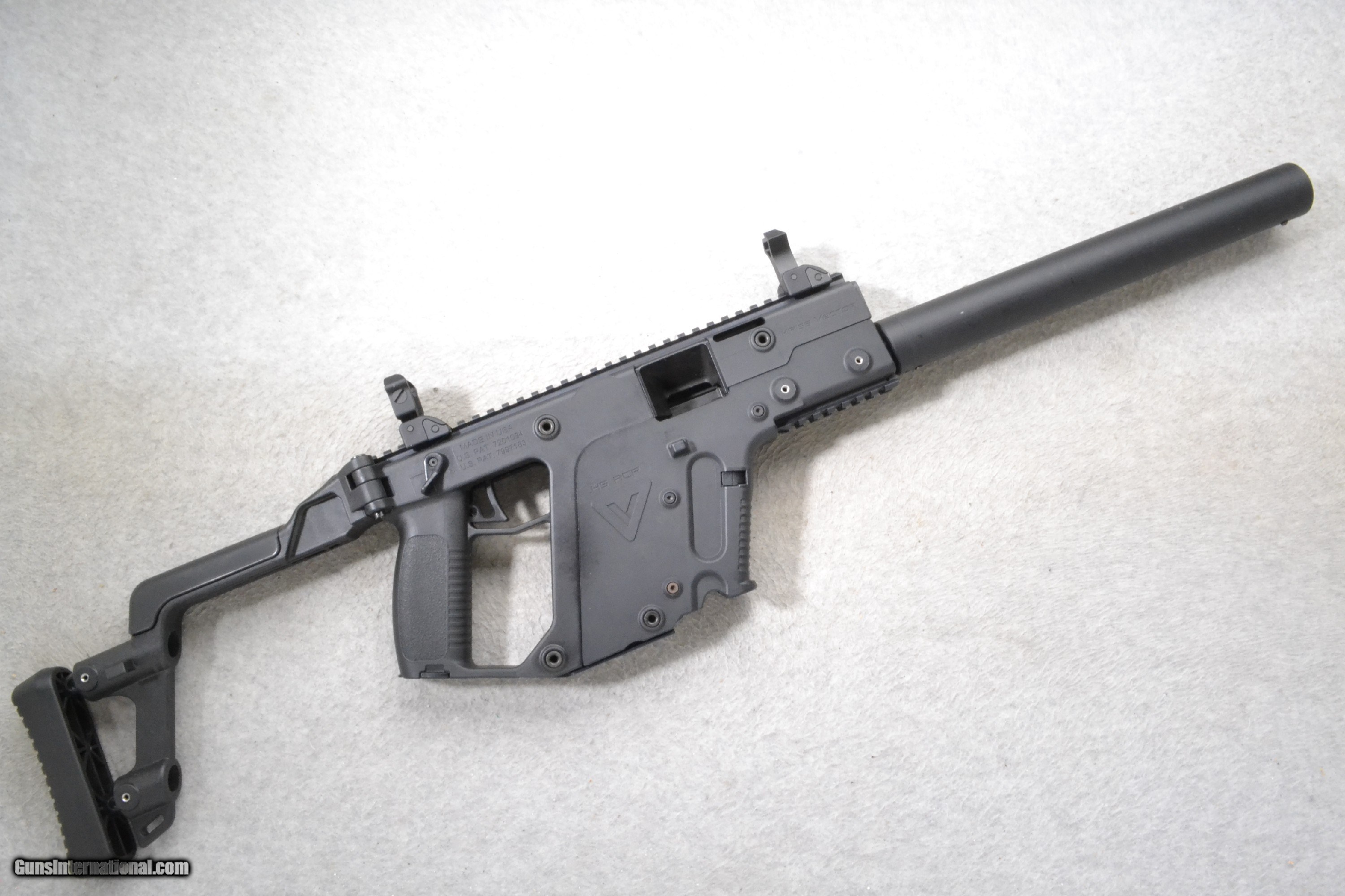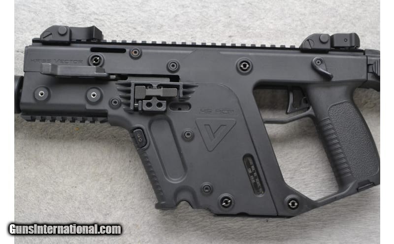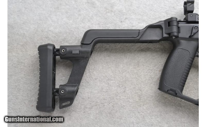 Description: This Kriss Model CRB is a right-hand semi auto rifle in .45 ACP Cal. It has a 16" shrouded barrel with a faux suppressor, side charging handle, flip-up adjustable post front sight with side protectors and a flip-up adjustable aperture rear sight with side protectors. The forearm is a ribbed black polymer with finger grooves and the foldable and adjustable buttstock is a textured grip black polymer pistol grip with a black polymer butt plate. Has top optic rail and lower accessory rail. Please check your local regulations before inquiring to purchase. .45 ACP .45 ACP SOLD Chambers: 25 round detachable magazine Metal Condition: Very good with handling marks Bore Condition: Very good Barrels: 16 Inches with faux suppressor Stock Dimensions: "Adjustable, LOP 12.75"" Fore End: Ribbed black polymer vertical grip with finger grooves Weight: 7 lbs 4 oz Sights: "Flip-up adjustable post front sight with side protectors, flip-up adjustable aperture rear sight with side protectors, top optic rail Item Location: Richfield, WI |
