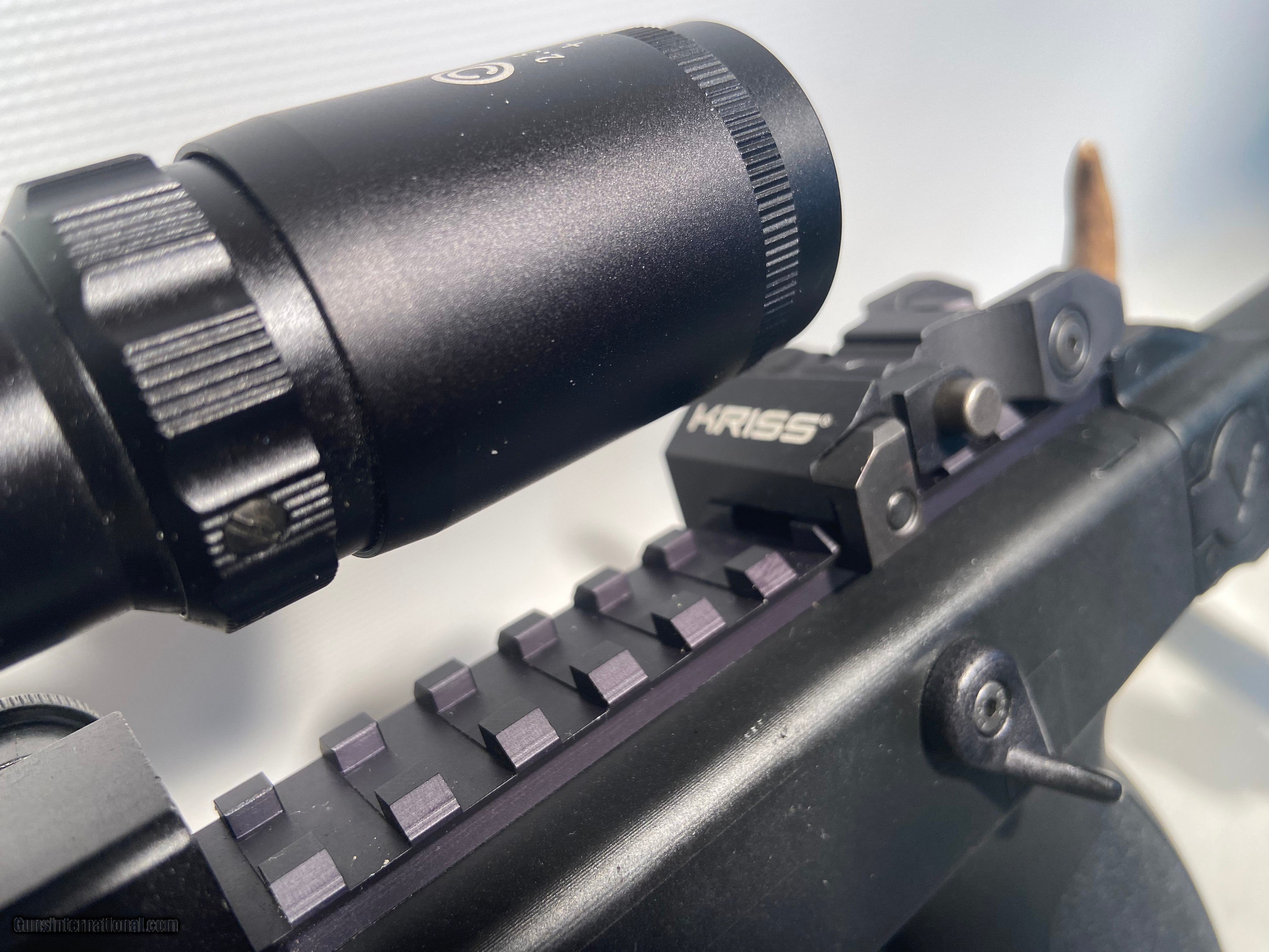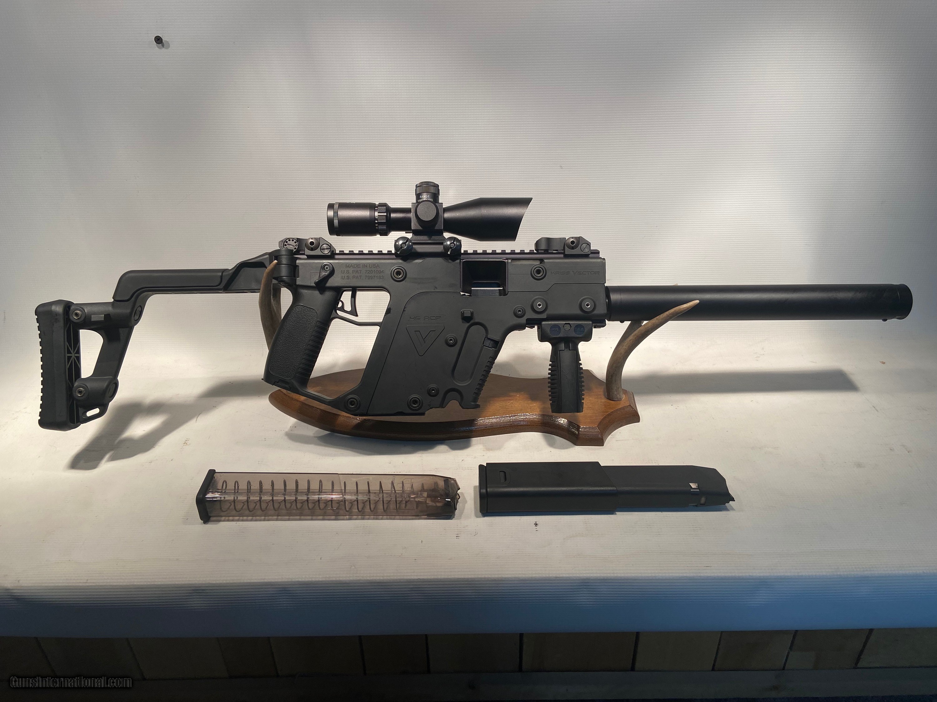 Description: Here we have a Kriss Model Vector CRB chambered in 45 ACP with a Vector folding stock. This gun features the Super V Recoil Mitigation system, 16" barrel and barrel shroud, a VLife 2.5-10x40 illuminated scope, a 25 round Glock mag and a 25 round ETS mag, flip up front and rear Kriss iron sights, full length picatinny top reciever rail and lower picatinny rail, Ambi. short throw safety, combat pivoting trigger and a Vector folding stock (missing push button). This rifle is in great shape! There are some slight marks around the chamber but overall is in 95% +/- condition. The bore is in 95% +/- condition as well. If you have any questions, feel free to reach out to us at anytime. PLEASE CALL WITH QUESTIONS BEFORE PURCHASING. SOLD Rifle Caliber: .45 ACP Handgun Caliber: .45 ACP (.45 Auto) Manufacturer: Kriss Model: Vector CRB Serial Number: 45C006994 Barrel Length: 16 Condition: 95% +/- Metal Condition: 95% +/- Bore Condition: 95% +/- Action: Semi Auto Triggers: Combat Pivoting Trigger Weight: 5.8 lbs. Sights: Flip up and Scope Manufacture Date: 2011-2017 |